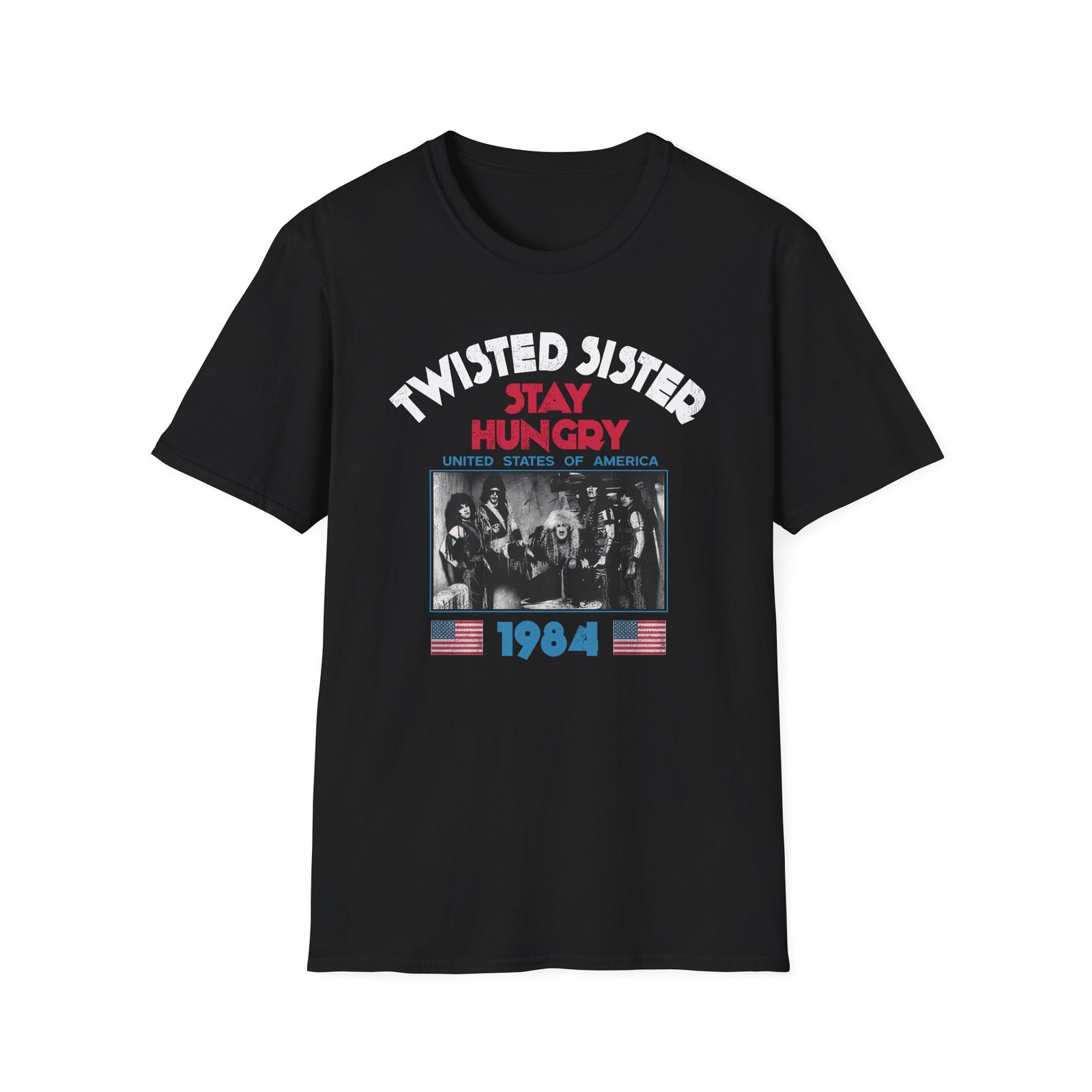 The 1984 Stay Hungry Tour Twisted Sister unisex soft-style t-shirt puts a new spin on casual comfort. Made from very soft materials, this tee is 100% cotton for solid colors. Heather colors and sports grey include polyester. The shoulders have twill tape for improved durability. There are no side seams. The collar is made with ribbed knitting to prevent curling damage.