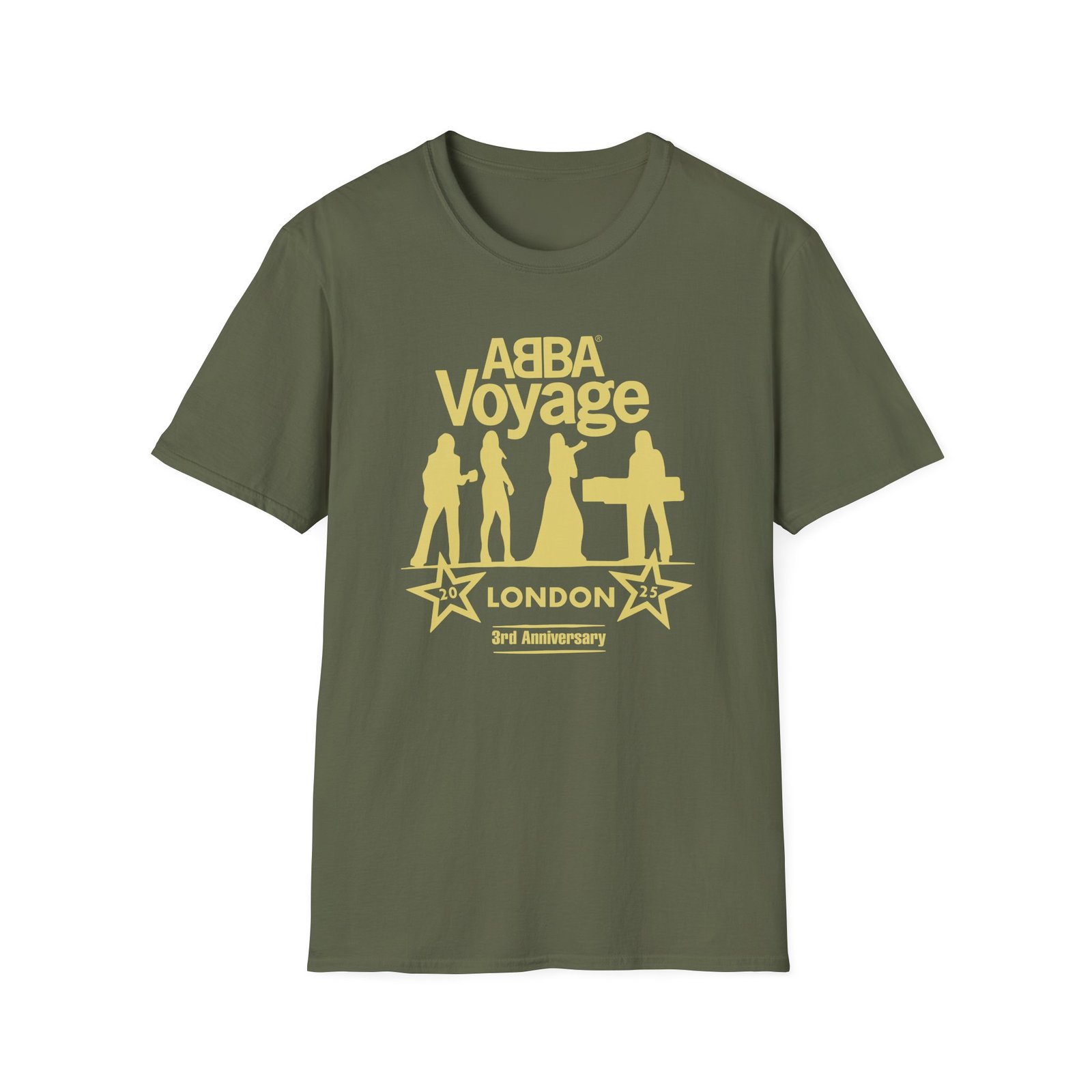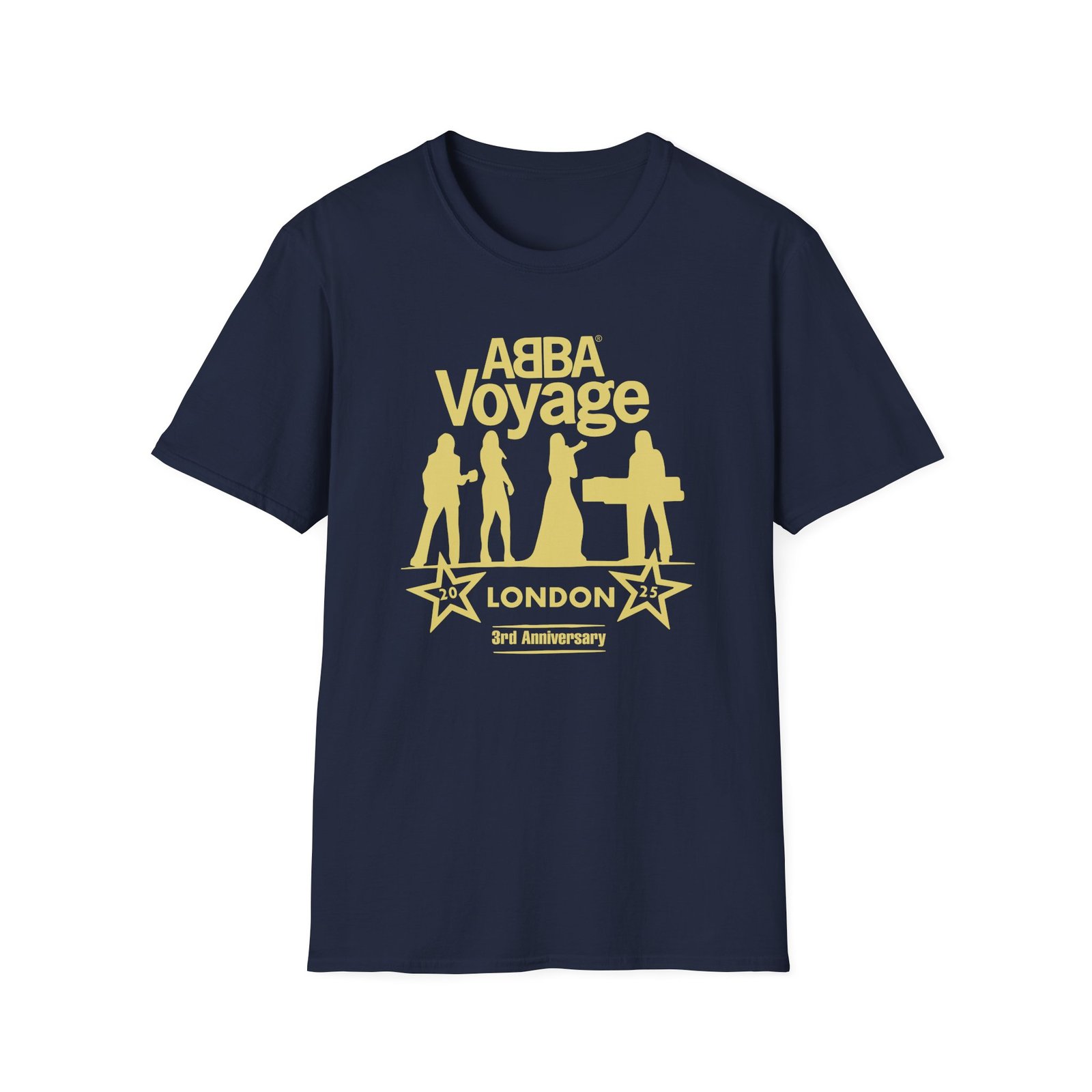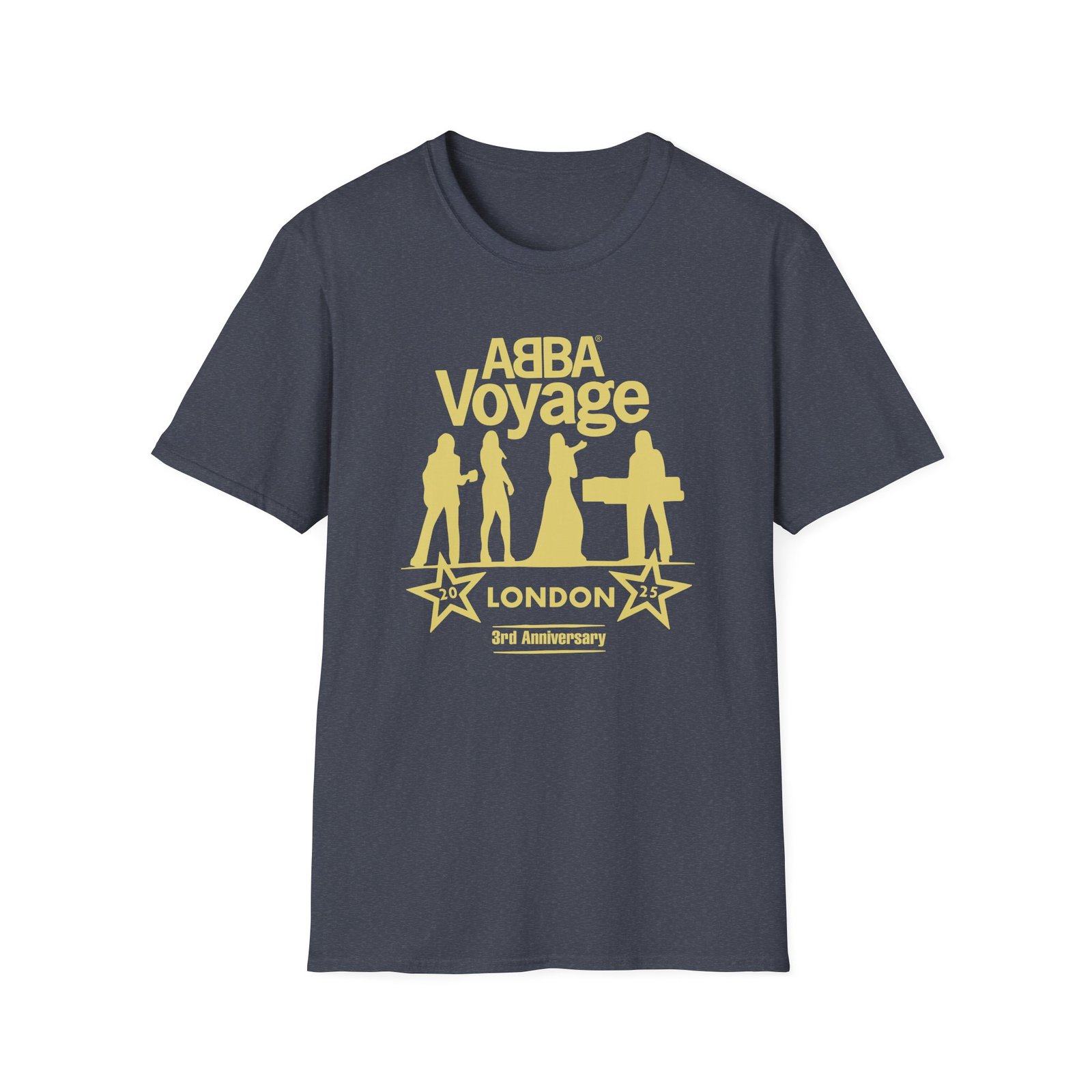 The Abba Voyage 3rd Anniversary unisex soft-style t-shirt puts a new spin on casual comfort. Made from very soft materials, this tee is 100% cotton for solid colors. Heather colors and sports grey include polyester. The shoulders have twill tape for improved durability. There are no side seams. The collar is made with ribbed knitting to prevent curling damage.