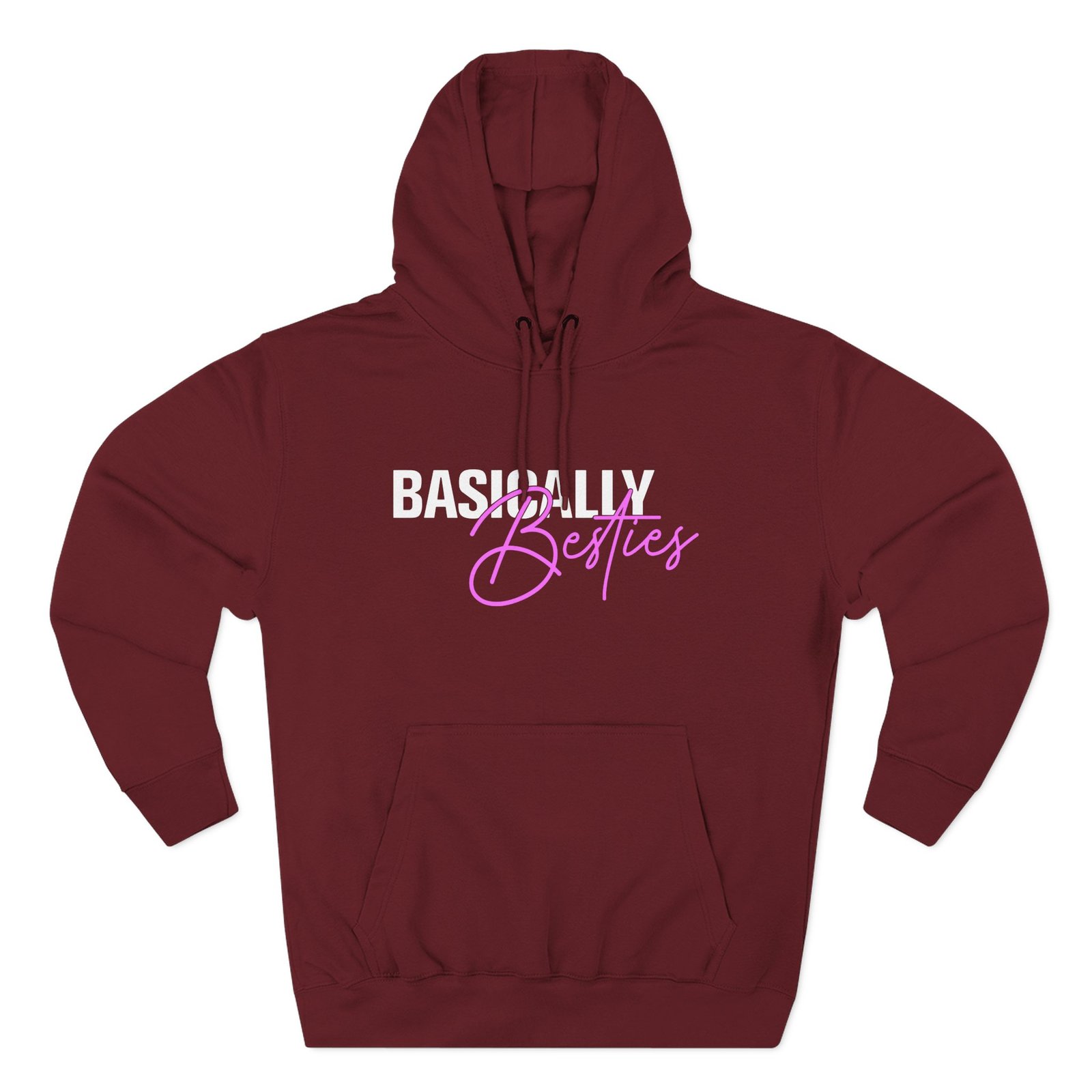 Beat the cold with this Basically Besties premium pullover hoodie that’s just the right layer of warm and cozy. Made with three-panel fleece lining, this pullover is double stitched for durability and roomy. Pick one in your favorite color to match your style.