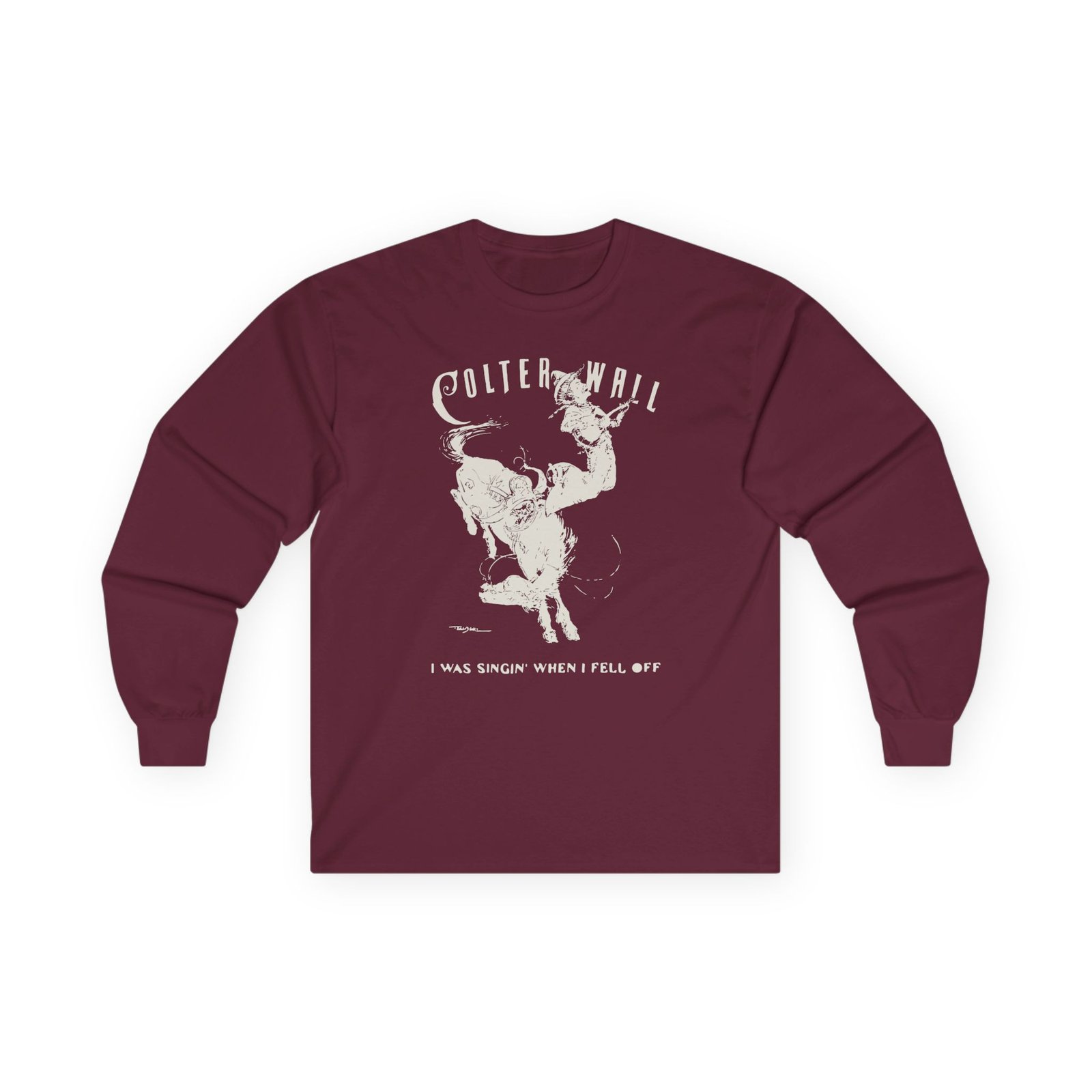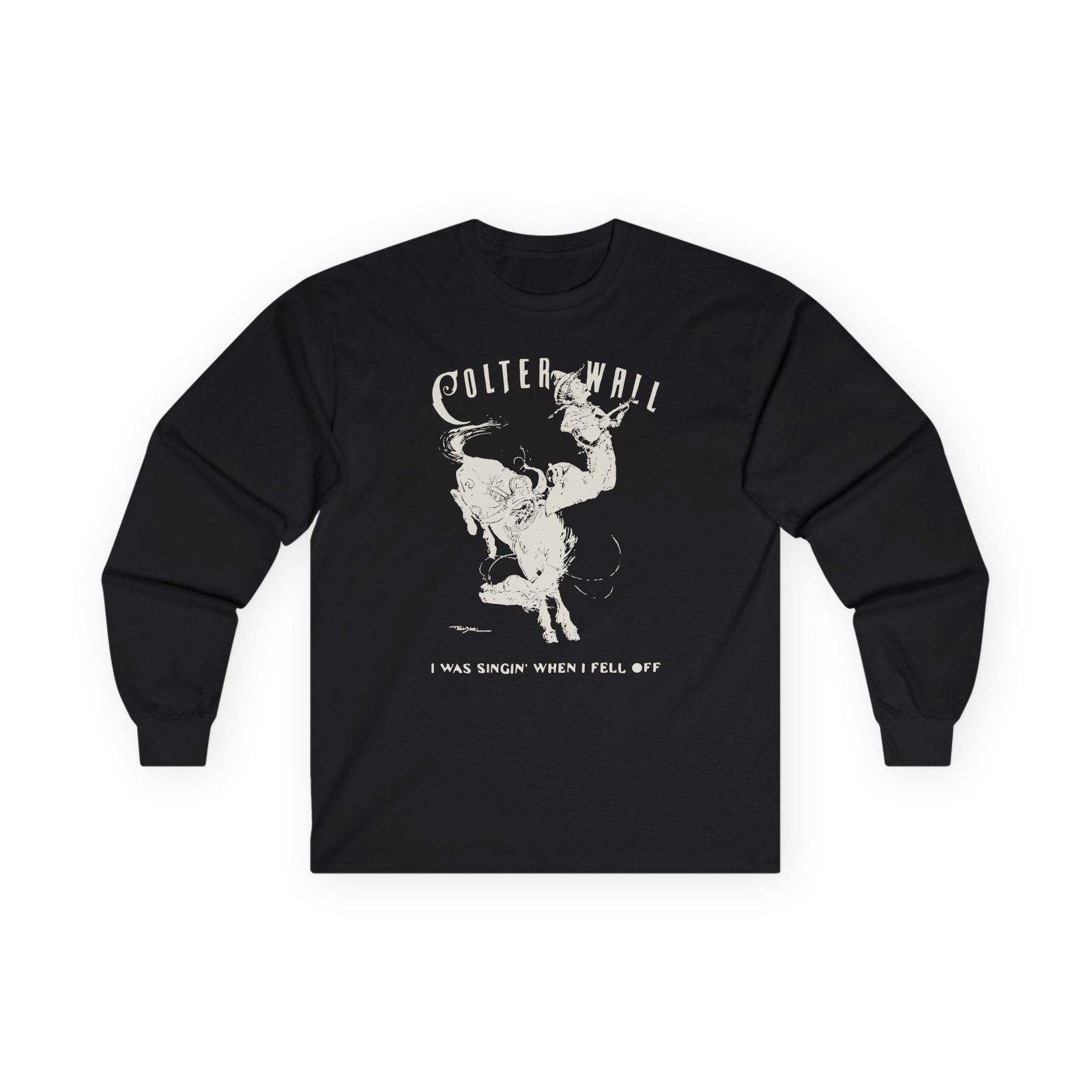A bit more formal than a standard-issue t-shirt, the Colter Wall I Was Singin' When I Fell Off ultra cotton long sleeve tee is a clear comfort winner. The sleeves also act as a nice frame. There are no side seams. The shoulders are taped for improved durability. This makes for a good fitting around the shoulders and neck. The cotton used for these shirts is environmentally friendly.