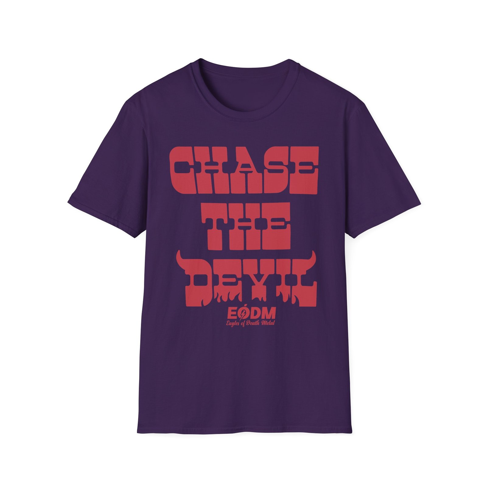 The Eagles of Death Metal Chase The Devil unisex soft-style t-shirt puts a new spin on casual comfort. Made from very soft materials, this tee is 100% cotton for solid colors. Heather colors and sports grey include polyester. The shoulders have twill tape for improved durability. There are no side seams. The collar is made with ribbed knitting to prevent curling damage.