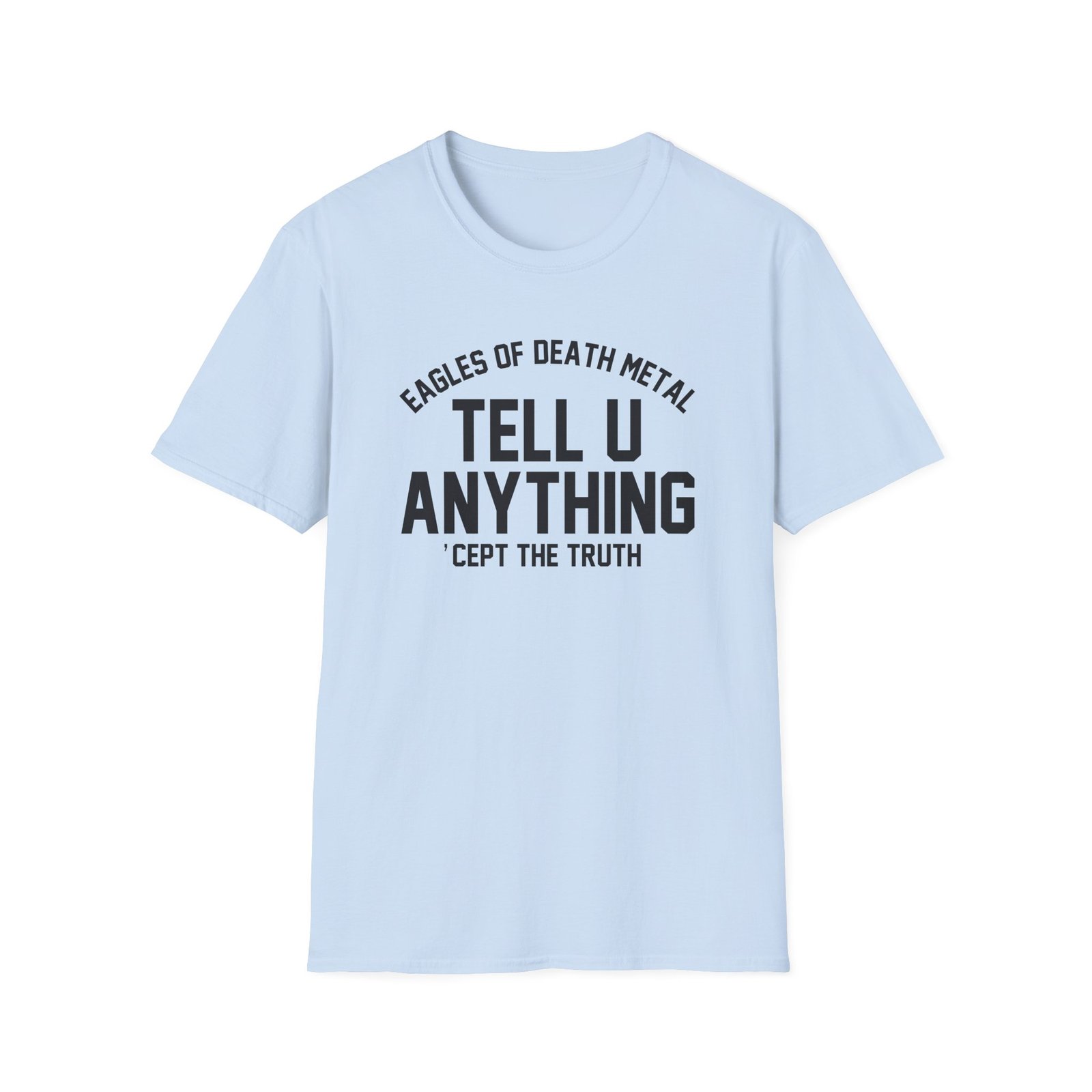 The Eagles of Death Metal Tell You Anything unisex soft-style t-shirt puts a new spin on casual comfort. Made from very soft materials, this tee is 100% cotton for solid colors. Heather colors and sports grey include polyester. The shoulders have twill tape for improved durability. There are no side seams. The collar is made with ribbed knitting to prevent curling damage.