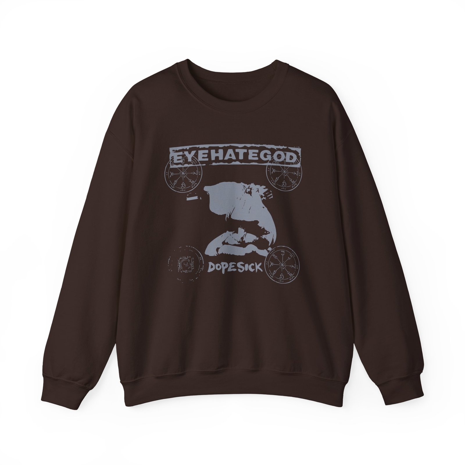 Ideal for any situation, a Eyehategod Dopesick unisex heavy blend crewneck sweatshirt is pure comfort. These garments are made from polyester and cotton. This combination helps designs come out looking fresh and beautiful. The collar is ribbed knit, so it retains its shape even after washing. There are no itchy side seams on these sweaters.
