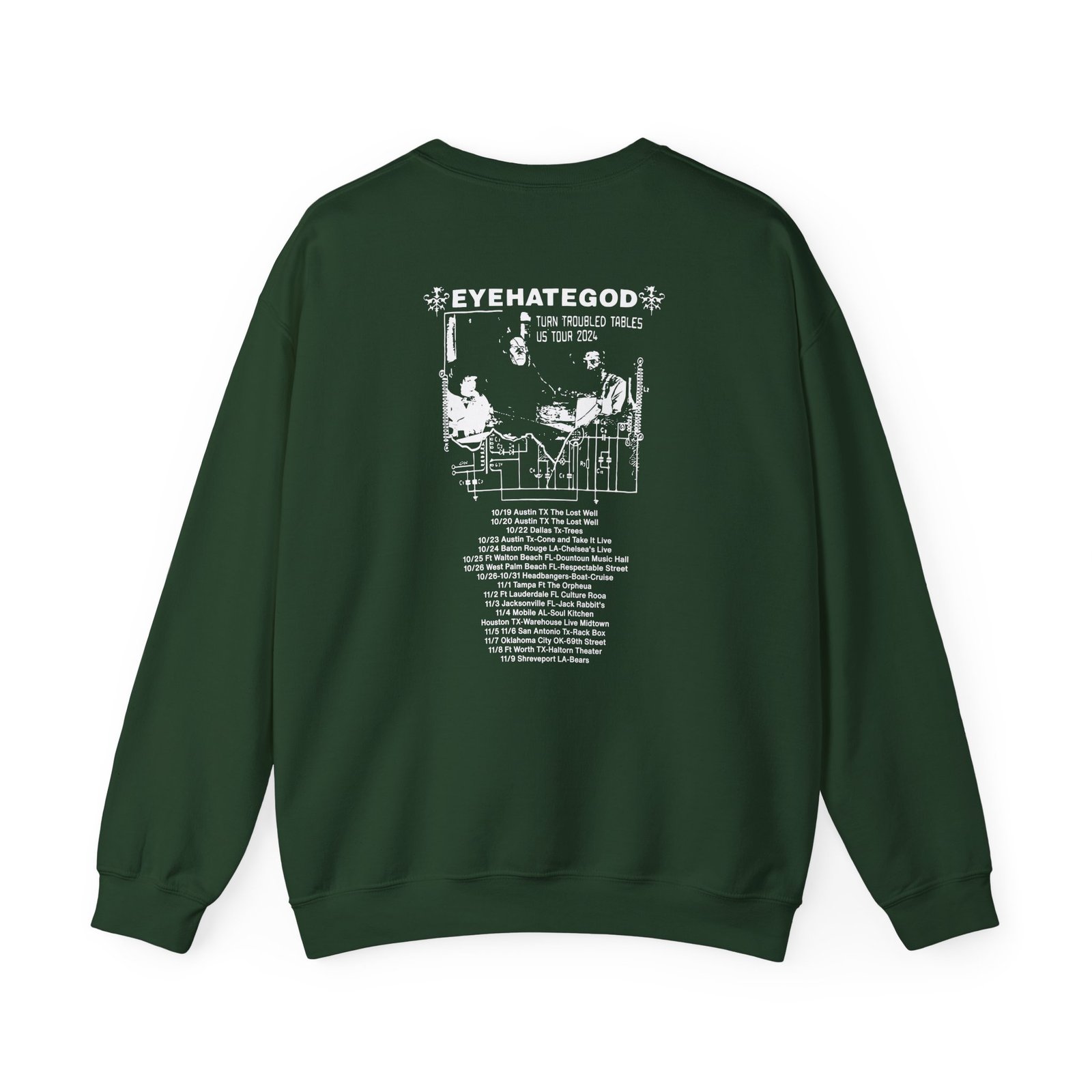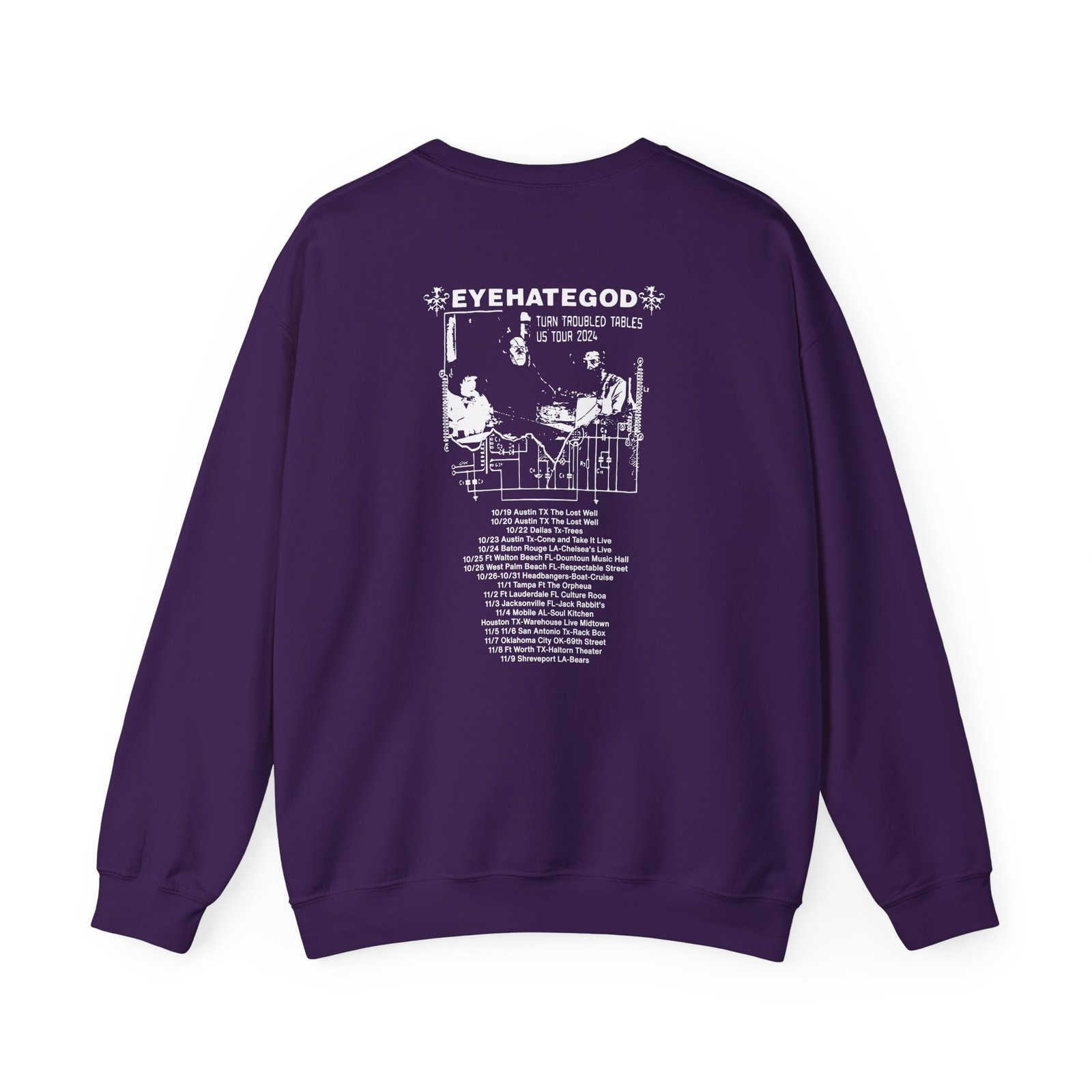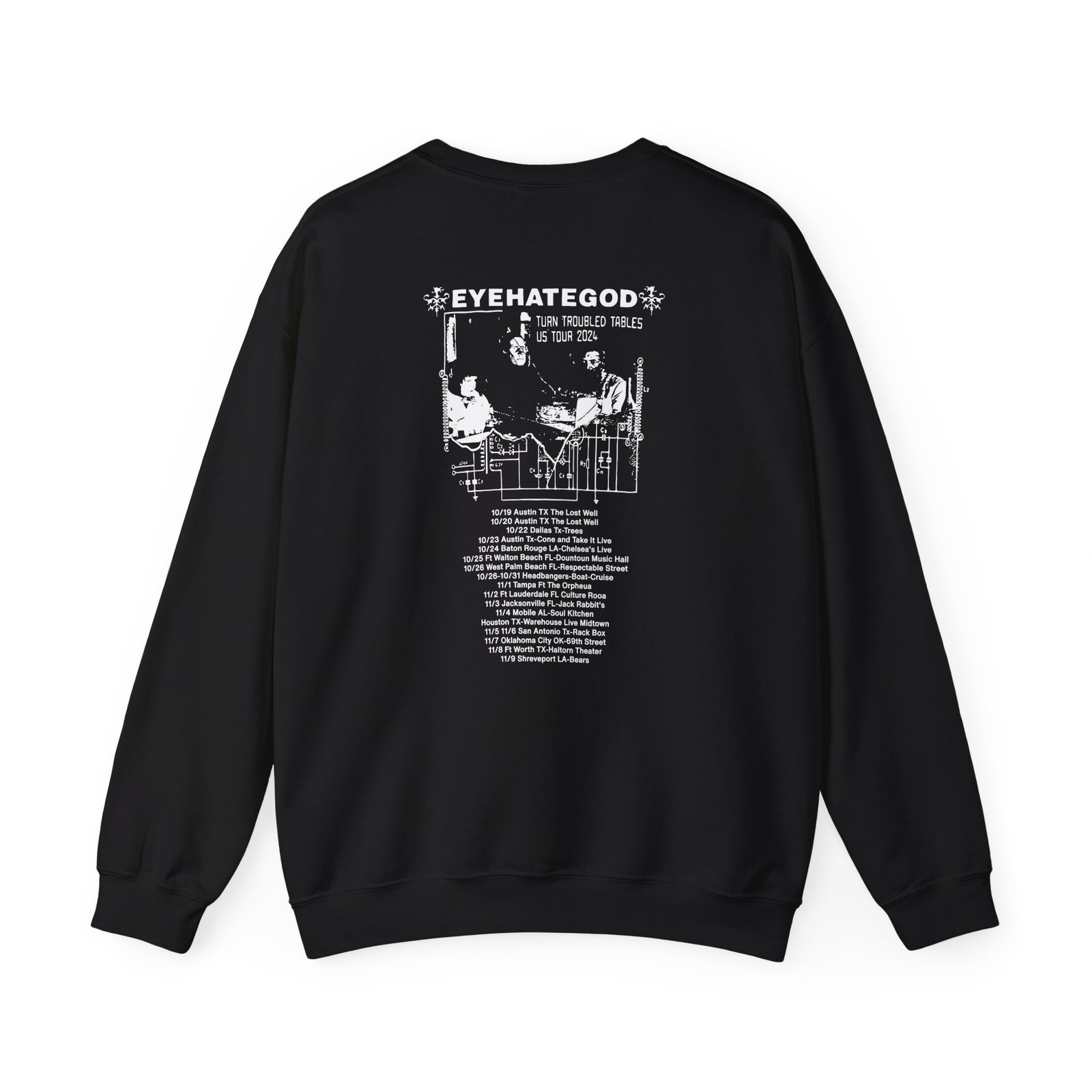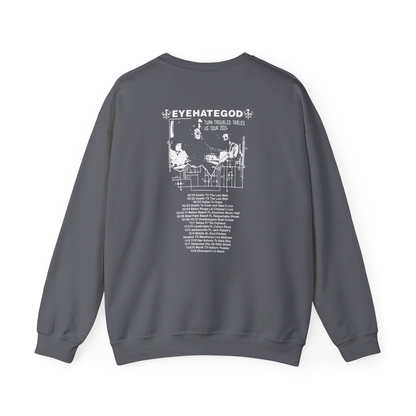 Ideal for any situation, a Eyehategod Turn Troubled Tables Us Tour unisex heavy blend crewneck sweatshirt is pure comfort. These garments are made from polyester and cotton. This combination helps designs come out looking fresh and beautiful. The collar is ribbed knit, so it retains its shape even after washing. There are no itchy side seams on these sweaters.