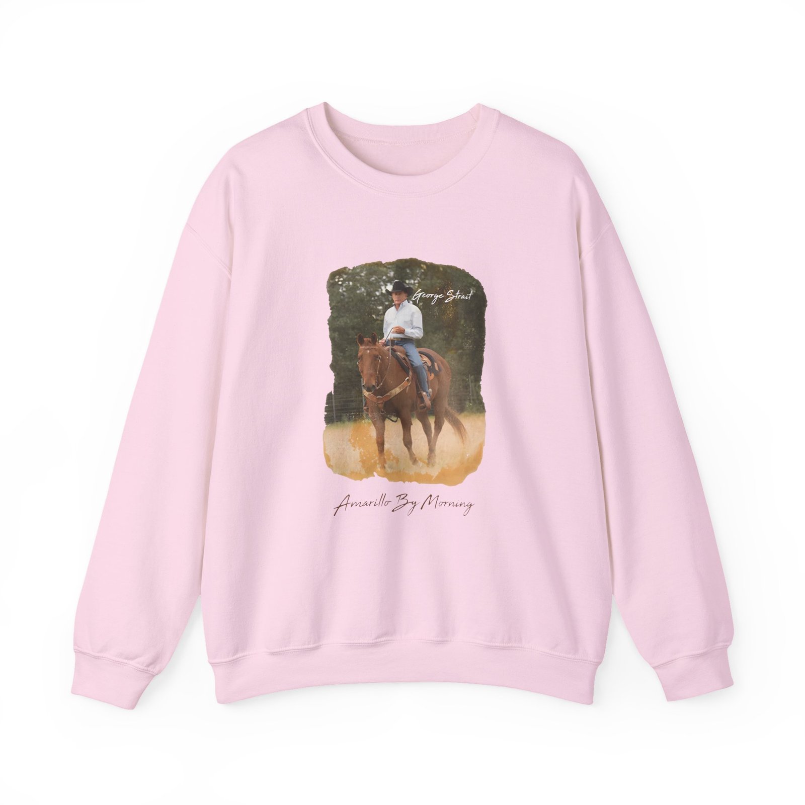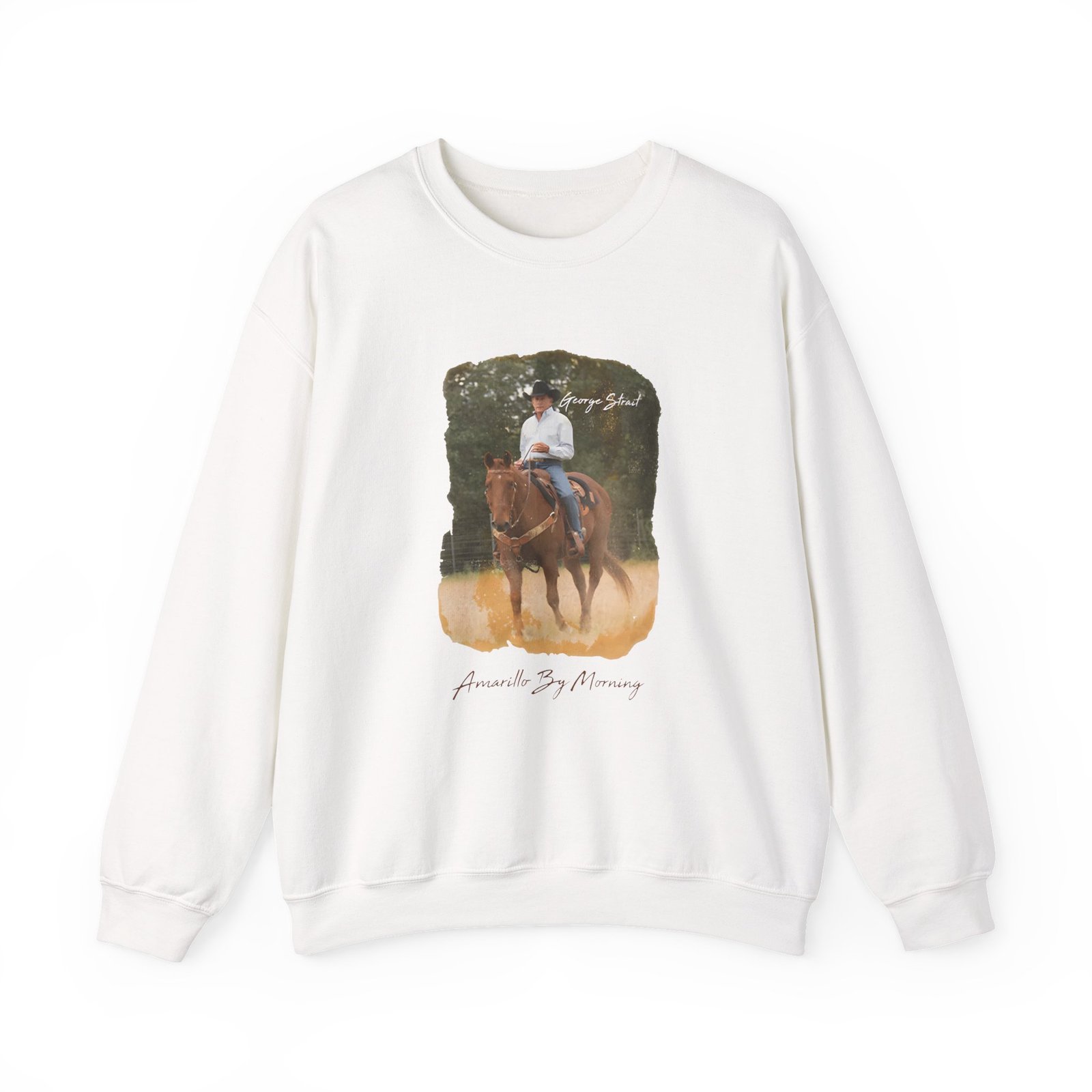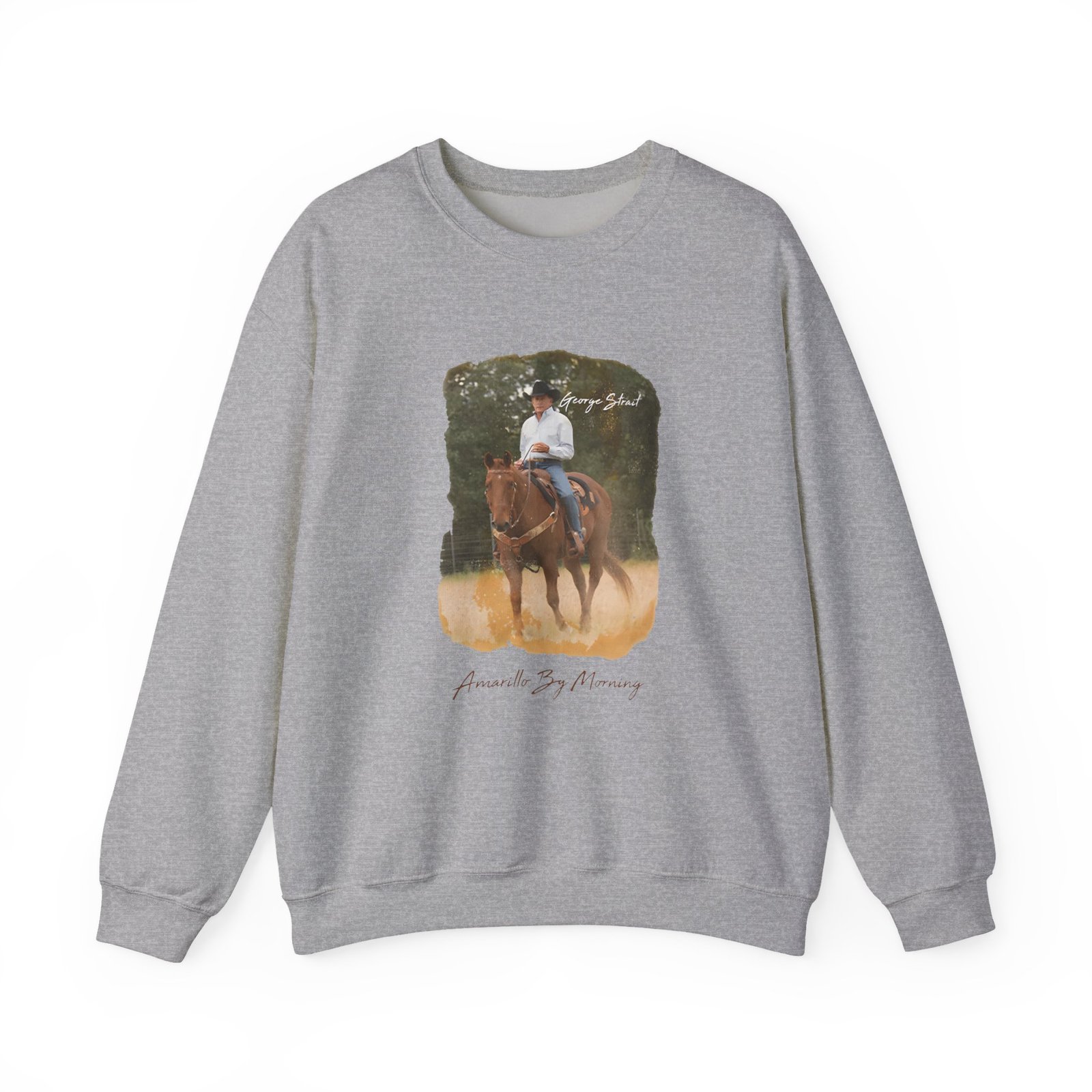 Ideal for any situation, a George Strait Amarillo by Morning unisex heavy blend crewneck sweatshirt is pure comfort. These garments are made from polyester and cotton. This combination helps designs come out looking fresh and beautiful. The collar is ribbed knit, so it retains its shape even after washing. There are no itchy side seams on these sweaters.