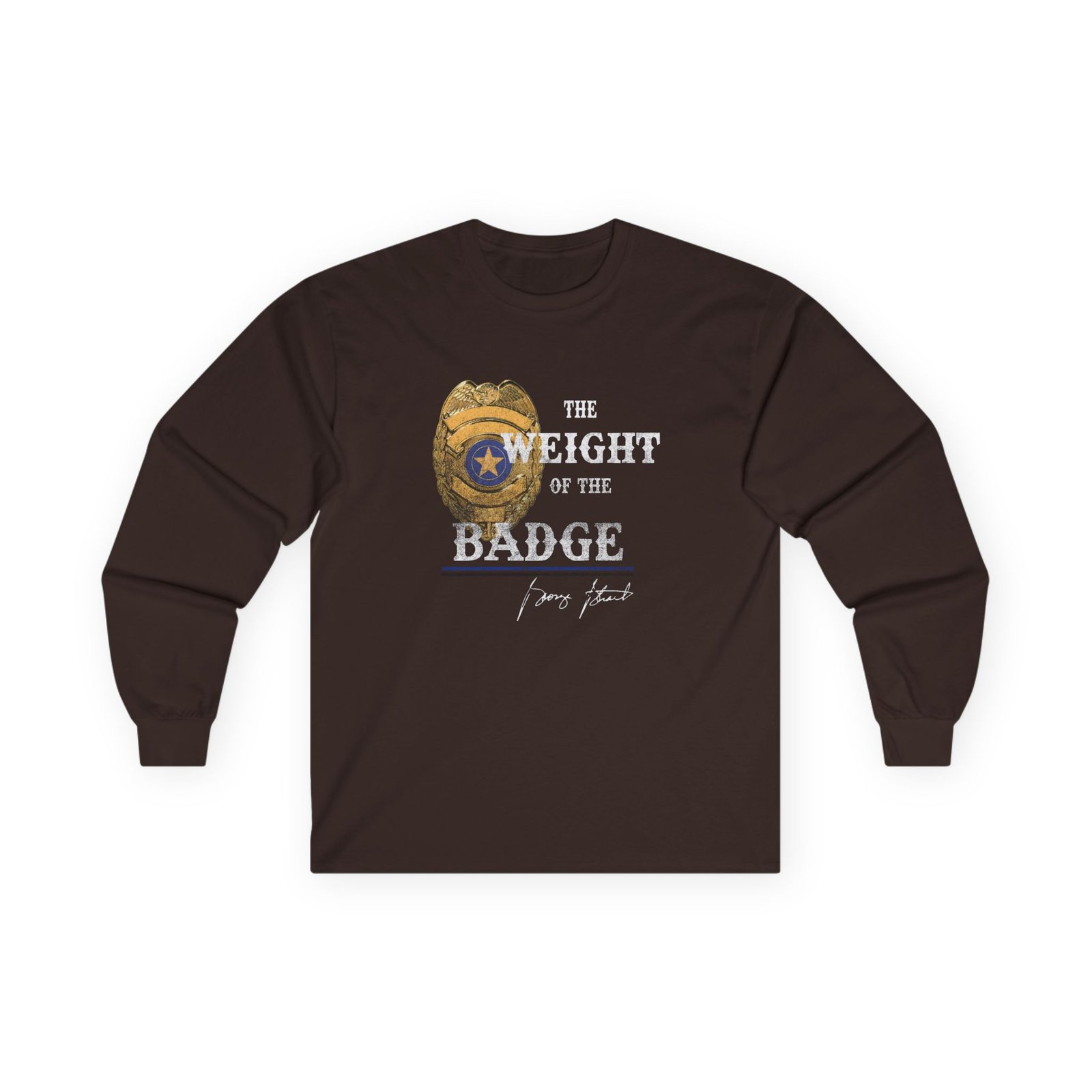A bit more formal than a standard-issue t-shirt, the George Strait Gold Badge ultra cotton long sleeve tee is a clear comfort winner. The sleeves also act as a nice frame. There are no side seams. The shoulders are taped for improved durability. This makes for a good fitting around the shoulders and neck. The cotton used for these shirts is environmentally friendly.