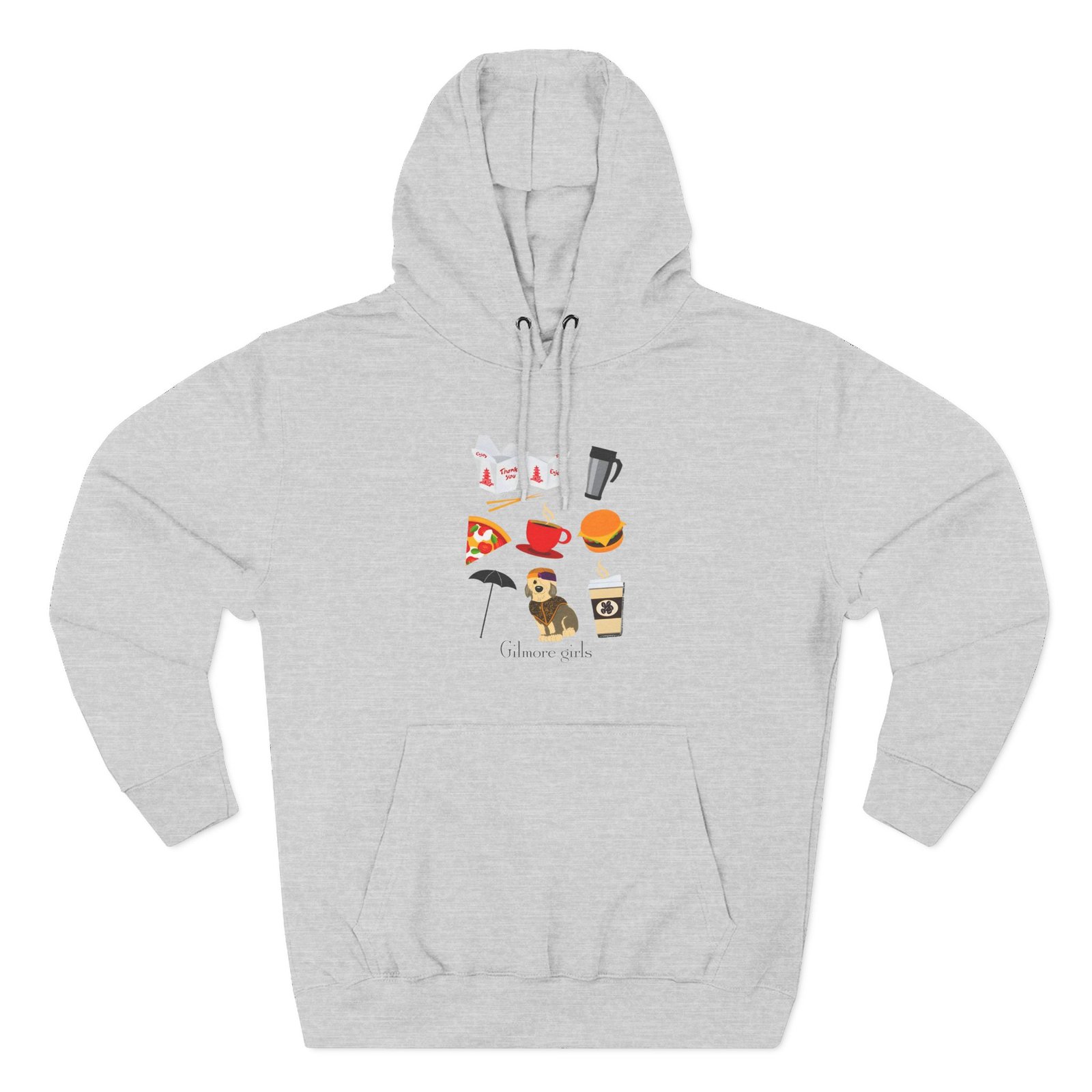 Beat the cold with this Gilmore Girls Iconic Icons premium pullover hoodie that’s just the right layer of warm and cozy. Made with three-panel fleece lining, this pullover is double stitched for durability and roomy. Pick one in your favorite color to match your style.