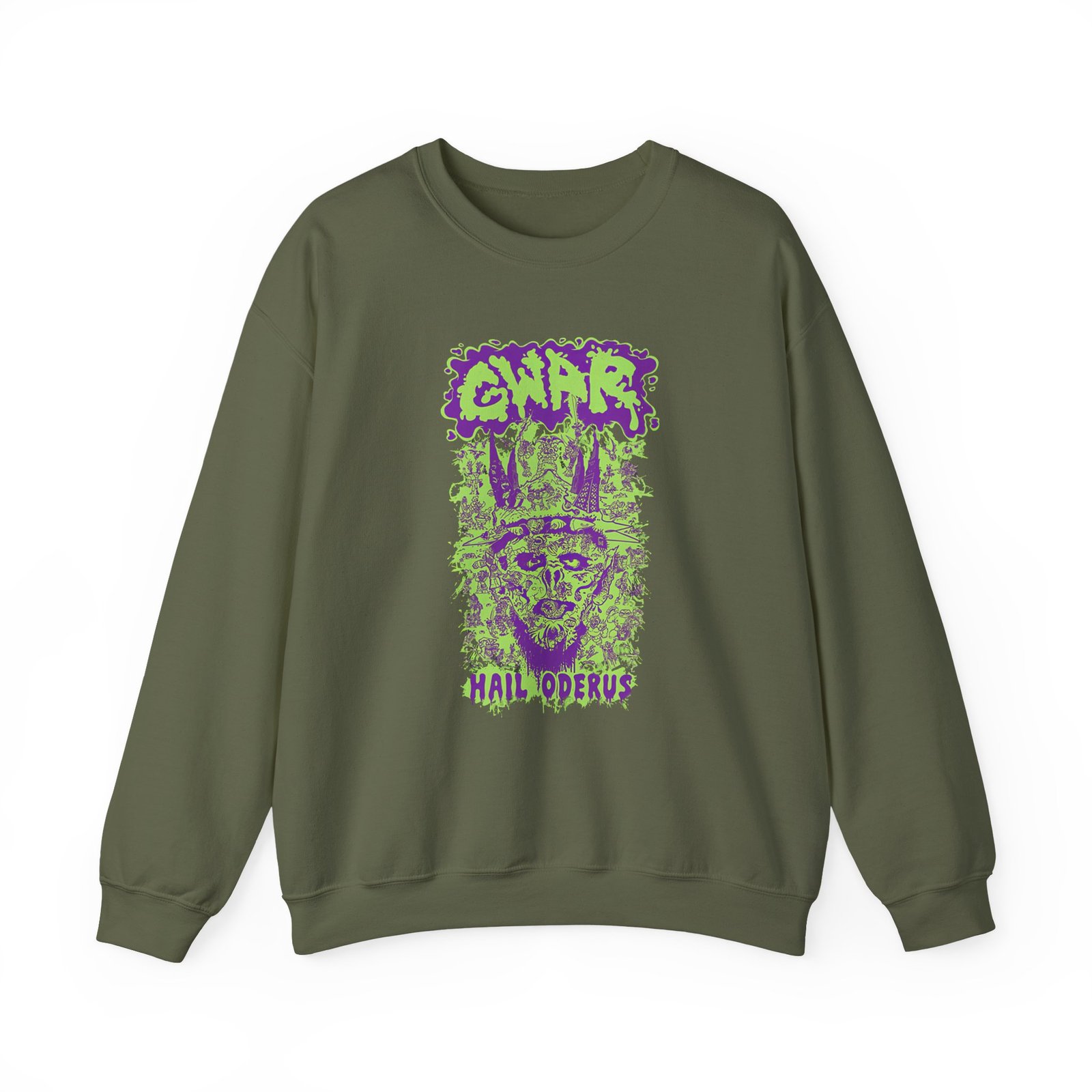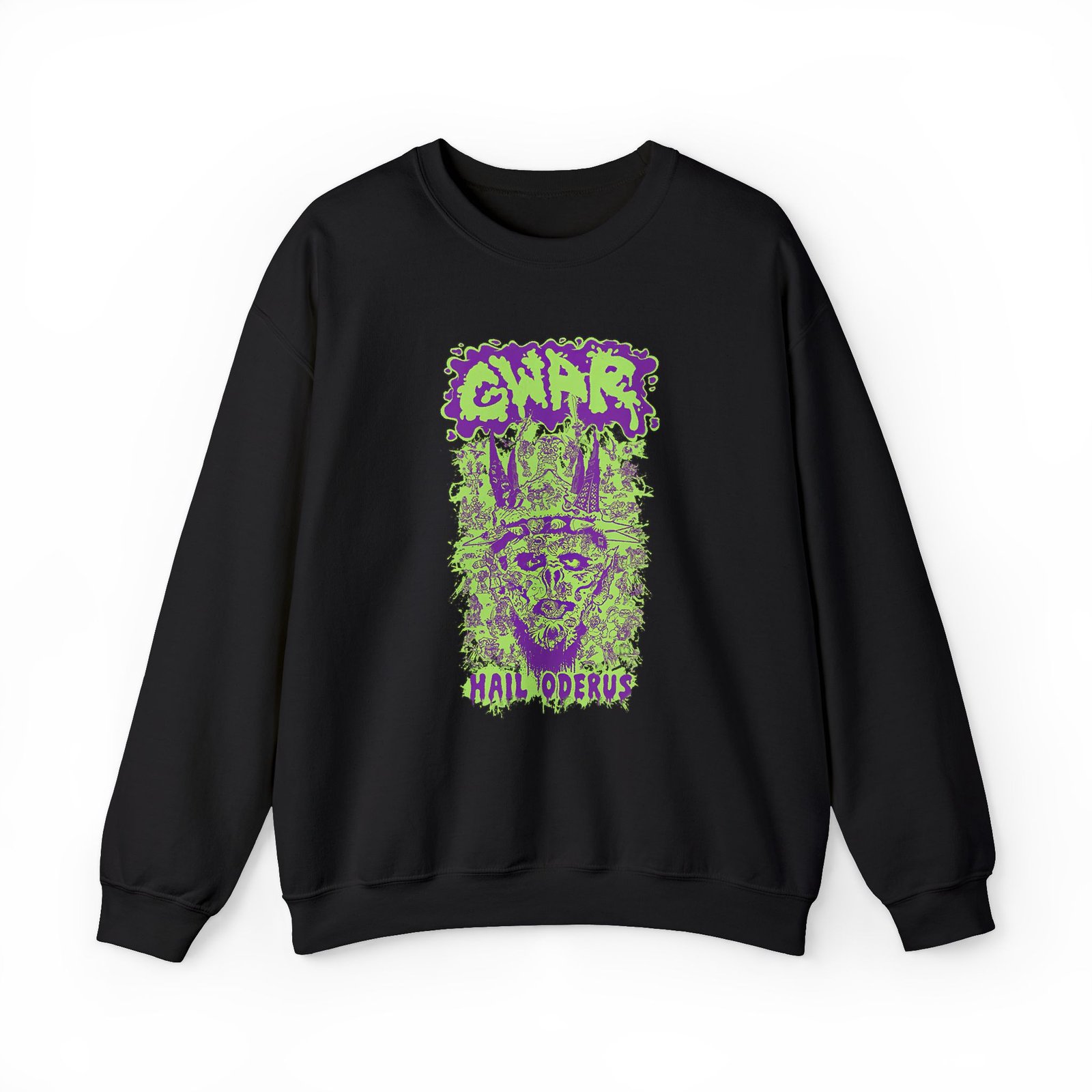 Ideal for any situation, a Gwar Hail Oderus unisex heavy blend crewneck sweatshirt is pure comfort. These garments are made from polyester and cotton. This combination helps designs come out looking fresh and beautiful. The collar is ribbed knit, so it retains its shape even after washing. There are no itchy side seams on these sweaters.