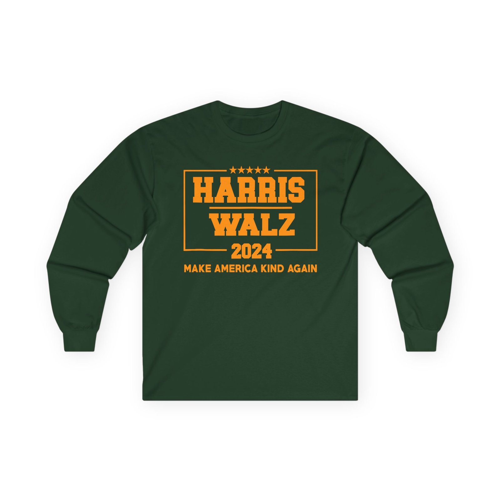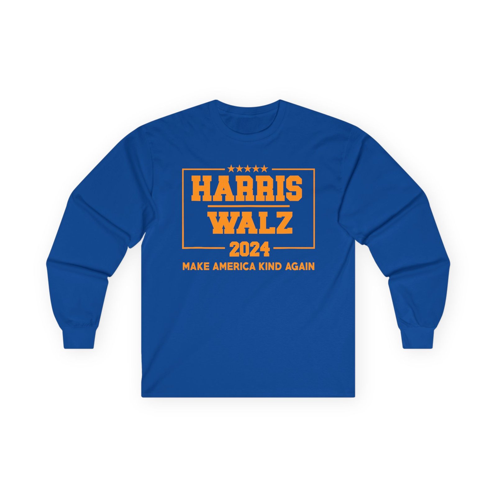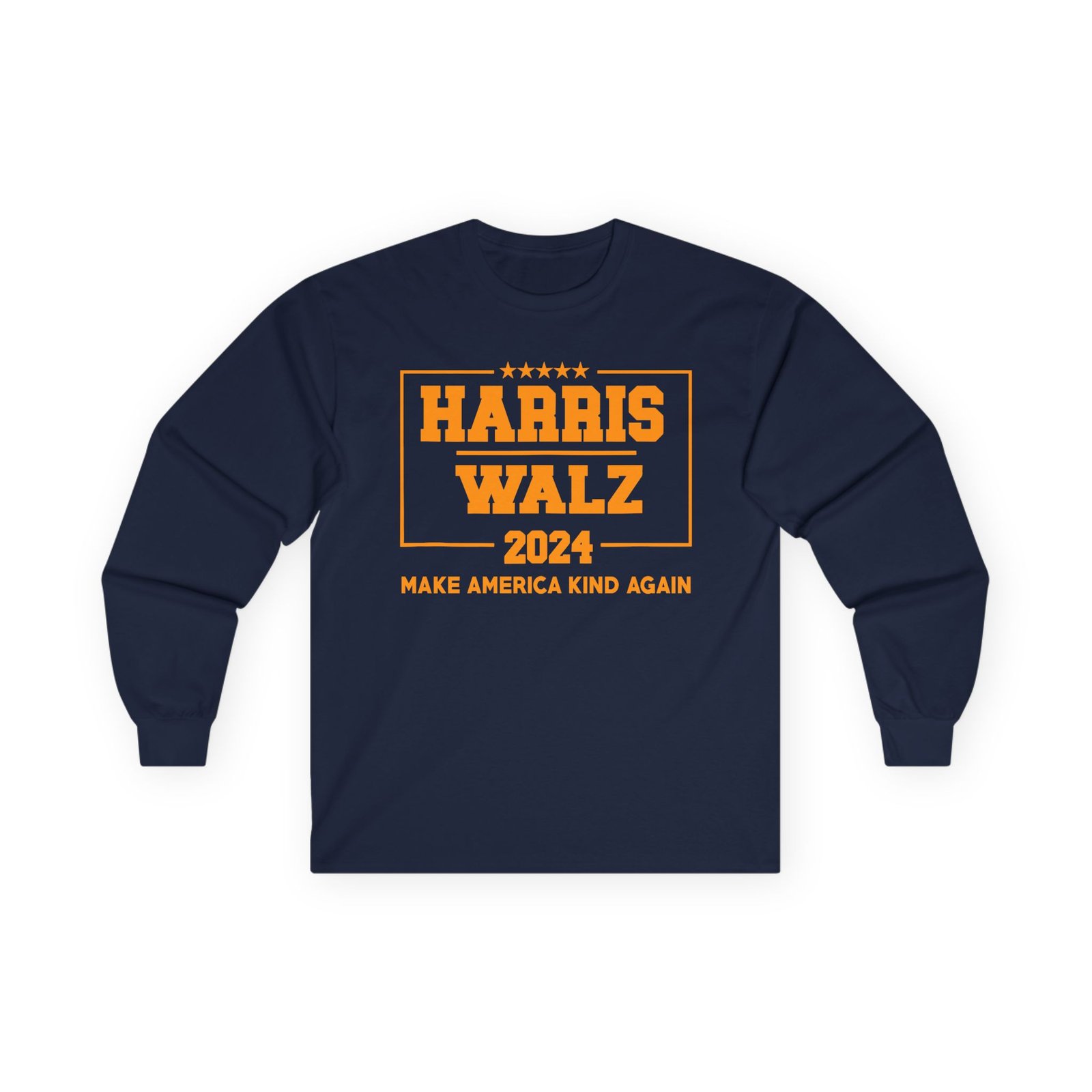 A bit more formal than a standard-issue t-shirt, the Harris Walz Make America Kind Again ultra cotton long sleeve tee is a clear comfort winner. The sleeves also act as a nice frame. There are no side seams. The shoulders are taped for improved durability. This makes for a good fitting around the shoulders and neck. The cotton used for these shirts is environmentally friendly.