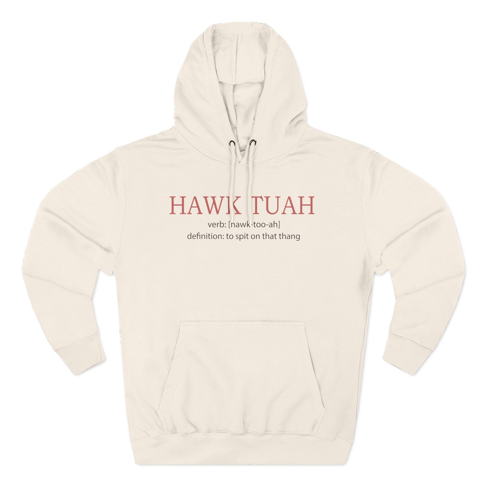 Beat the cold with this Hawk Tuah premium pullover hoodie that’s just the right layer of warm and cozy. Made with three-panel fleece lining, this pullover is double stitched for durability and roomy. Pick one in your favorite color to match your style.
