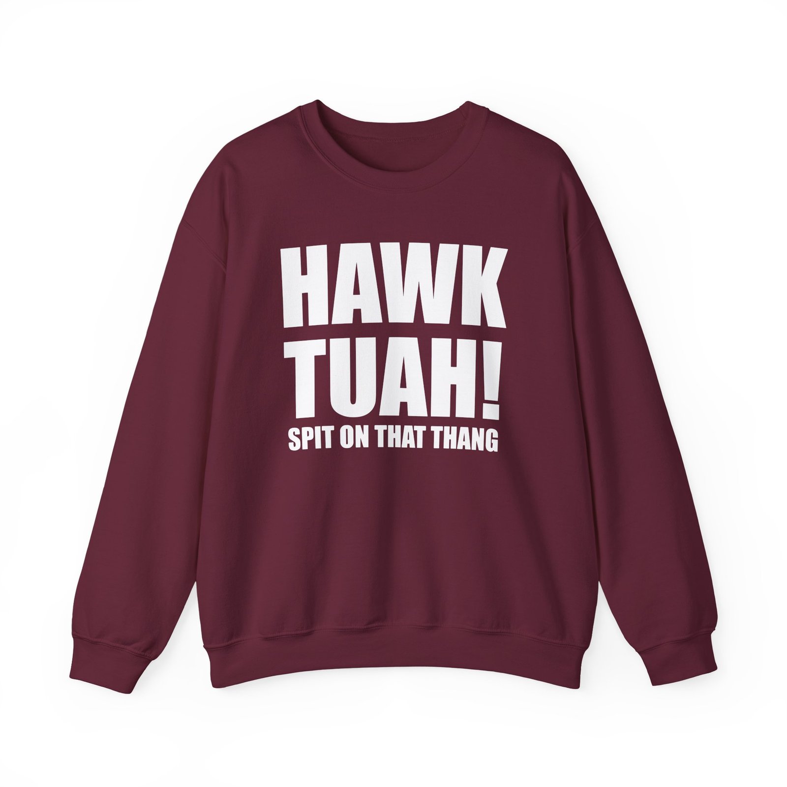 Ideal for any situation, a Hawk Tuah unisex heavy blend crewneck sweatshirt is pure comfort. These garments are made from polyester and cotton. This combination helps designs come out looking fresh and beautiful. The collar is ribbed knit, so it retains its shape even after washing. There are no itchy side seams on these sweaters.