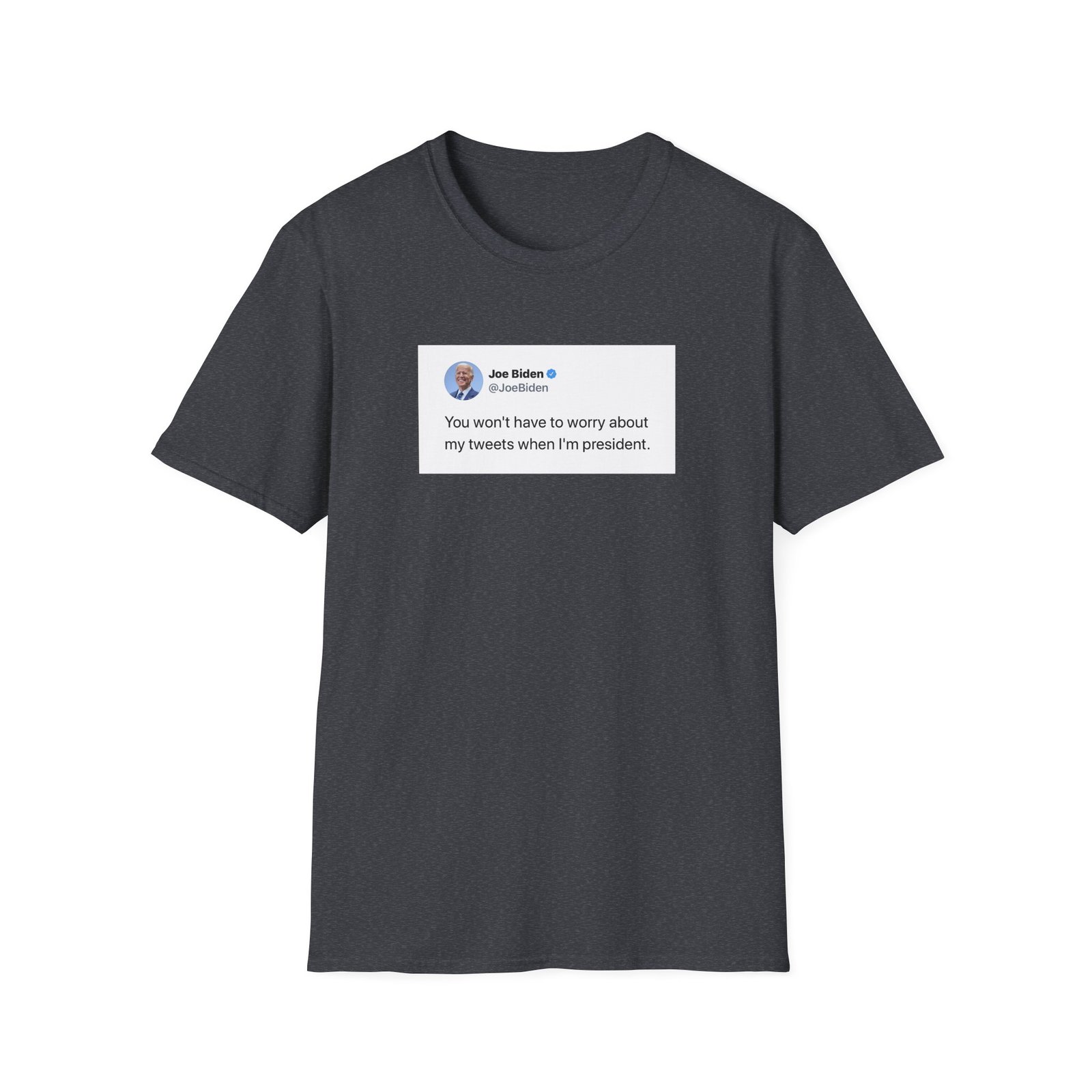 The Joe Biden Don’t Worry About My Tweets unisex soft-style t-shirt puts a new spin on casual comfort. Made from very soft materials, this tee is 100% cotton for solid colors. Heather colors and sports grey include polyester. The shoulders have twill tape for improved durability. There are no side seams. The collar is made with ribbed knitting to prevent curling damage.
