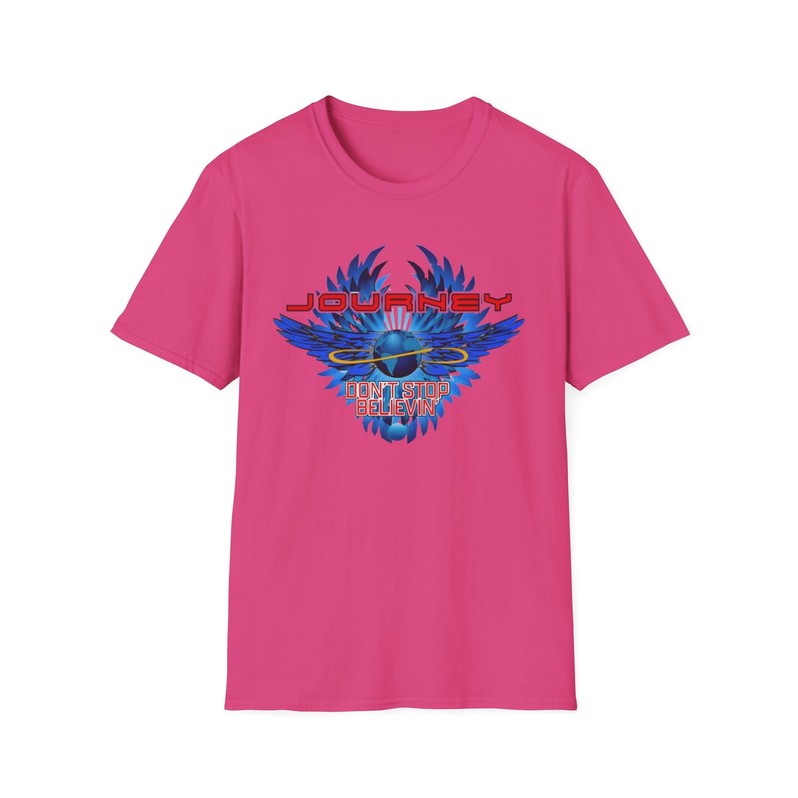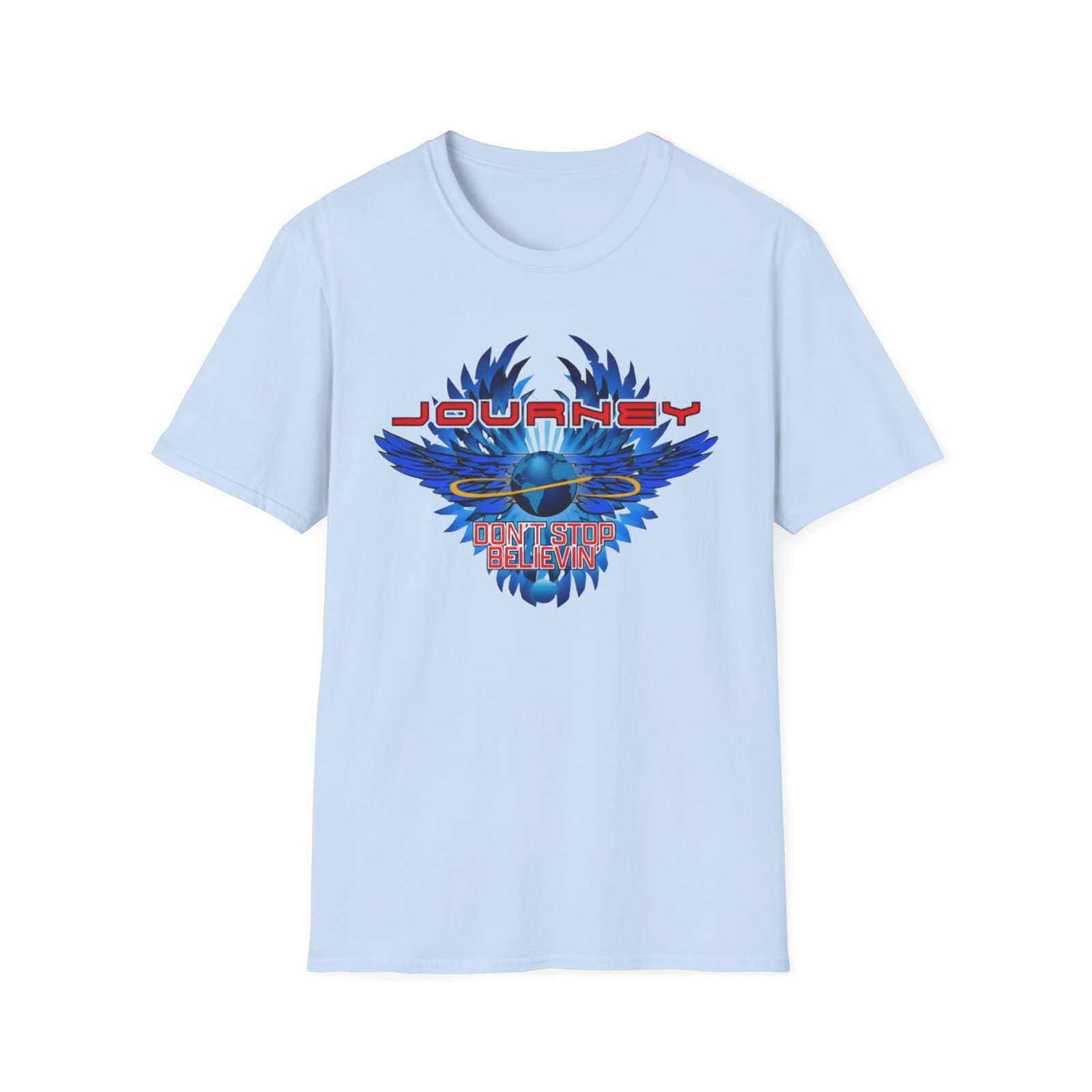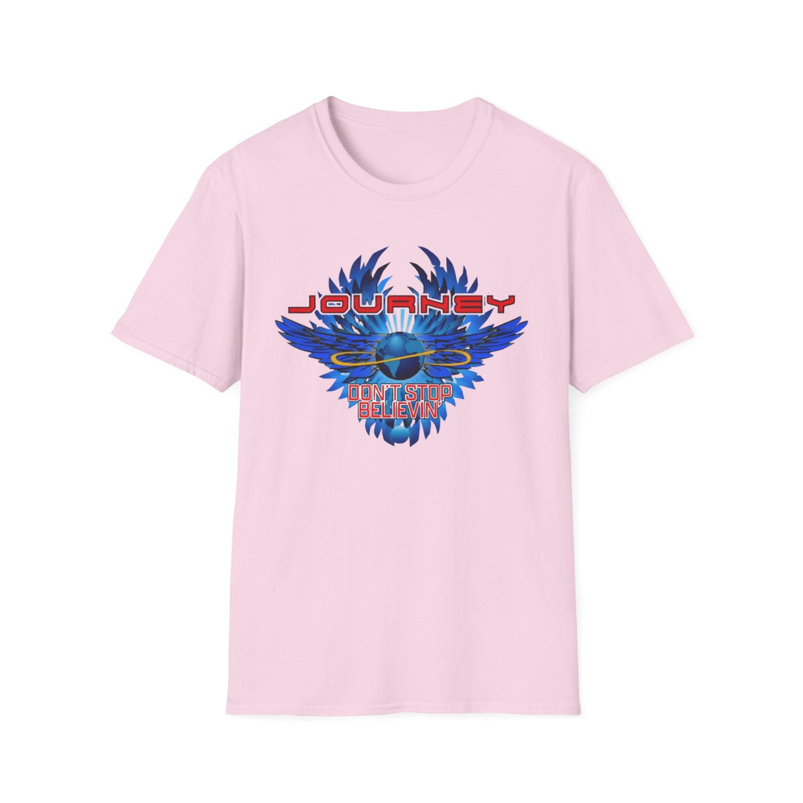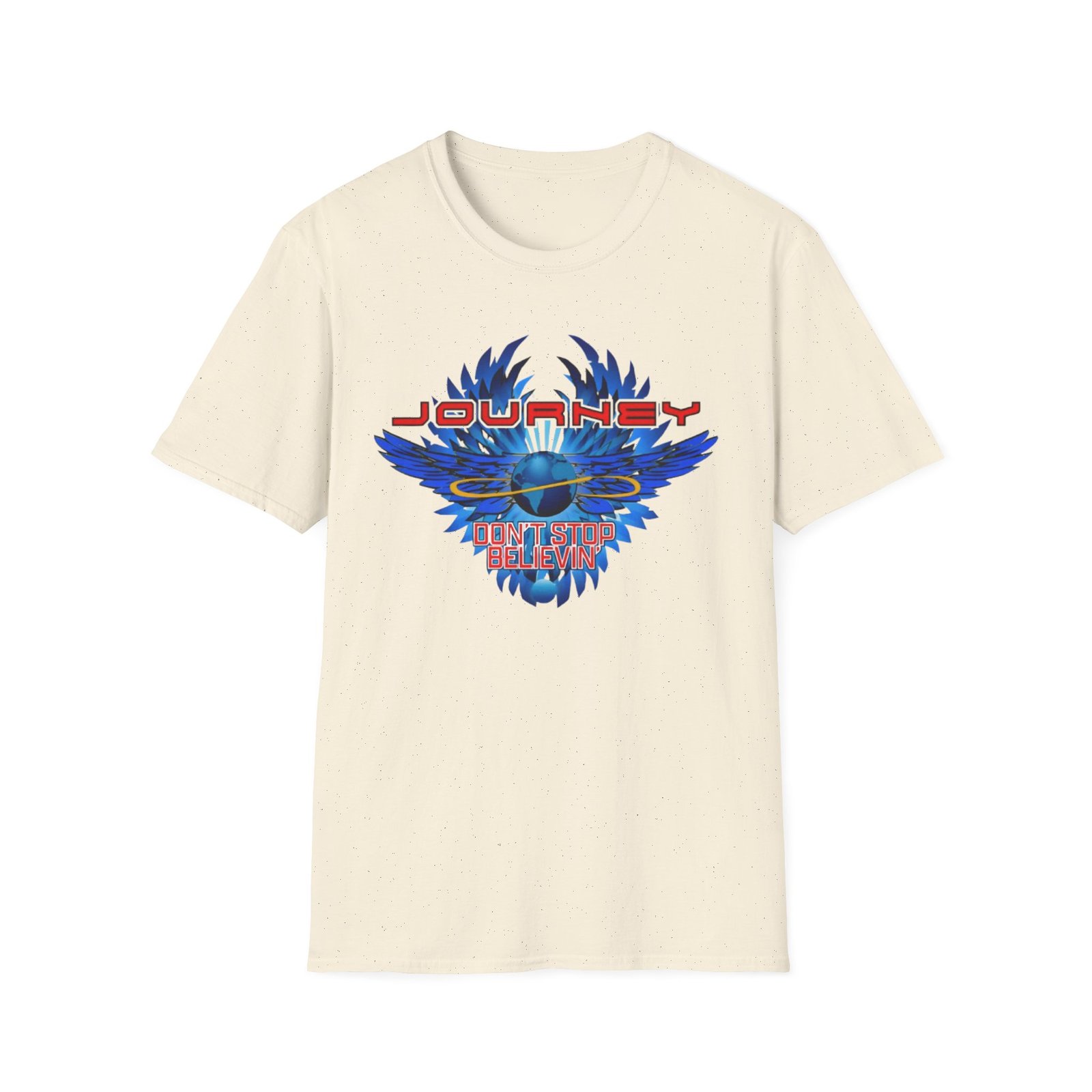 The Journey 2024 Don't Stop Believin unisex soft-style t-shirt puts a new spin on casual comfort. Made from very soft materials, this tee is 100% cotton for solid colors. Heather colors and sports grey include polyester. The shoulders have twill tape for improved durability. There are no side seams. The collar is made with ribbed knitting to prevent curling damage.