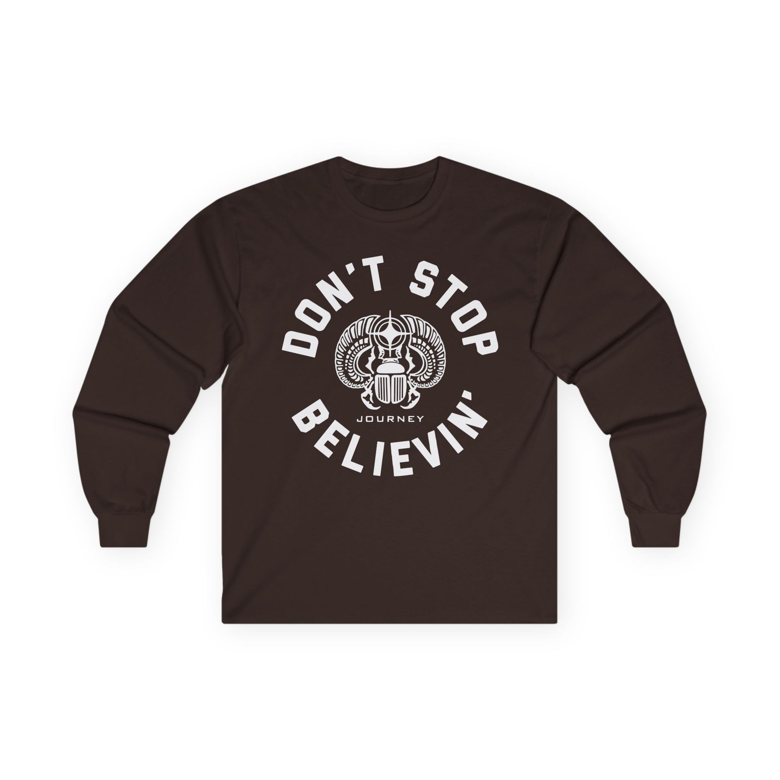 A bit more formal than a standard-issue t-shirt, the Journey Don't Stop Believin ultra cotton long sleeve tee is a clear comfort winner. The sleeves also act as a nice frame. There are no side seams. The shoulders are taped for improved durability. This makes for a good fitting around the shoulders and neck. The cotton used for these shirts is environmentally friendly.