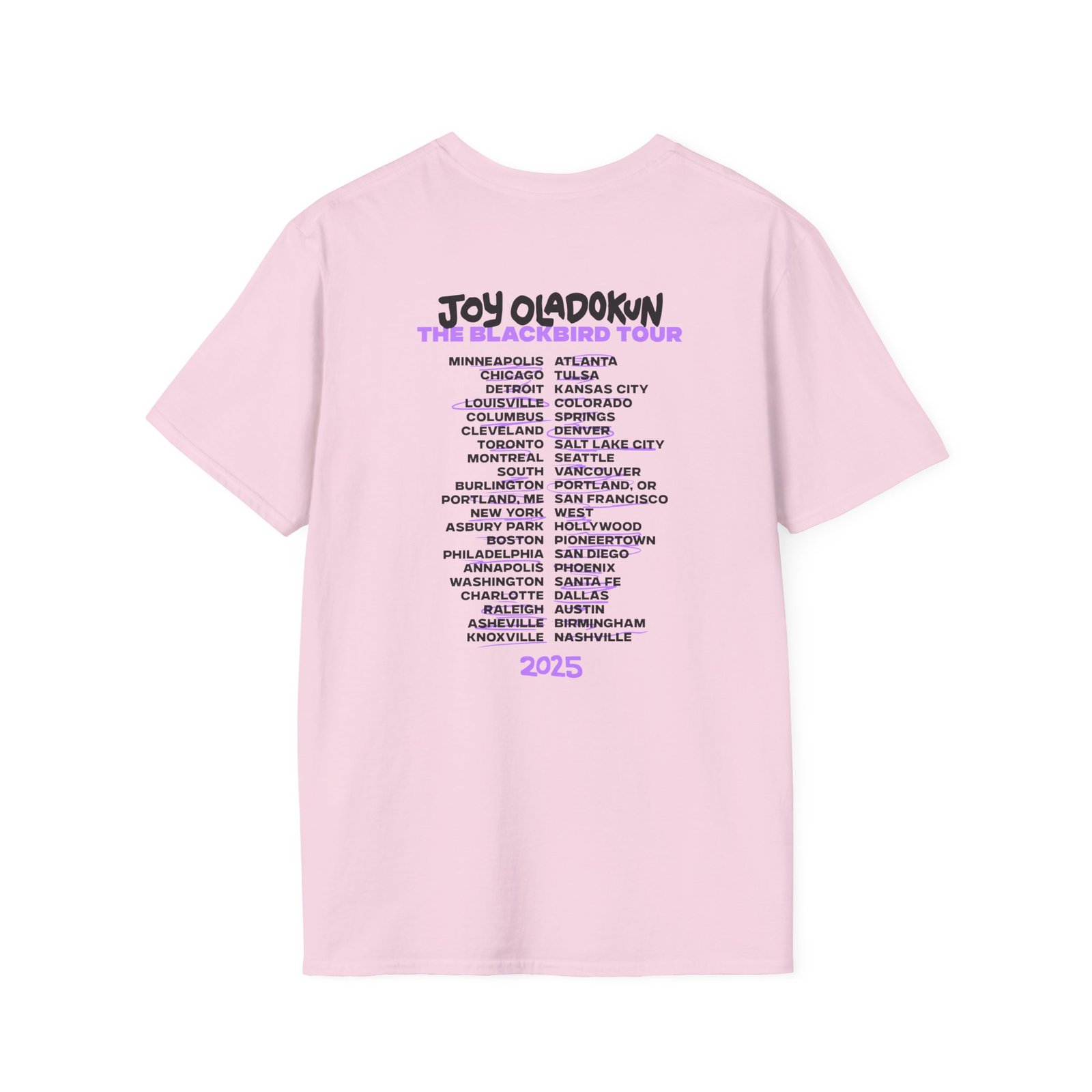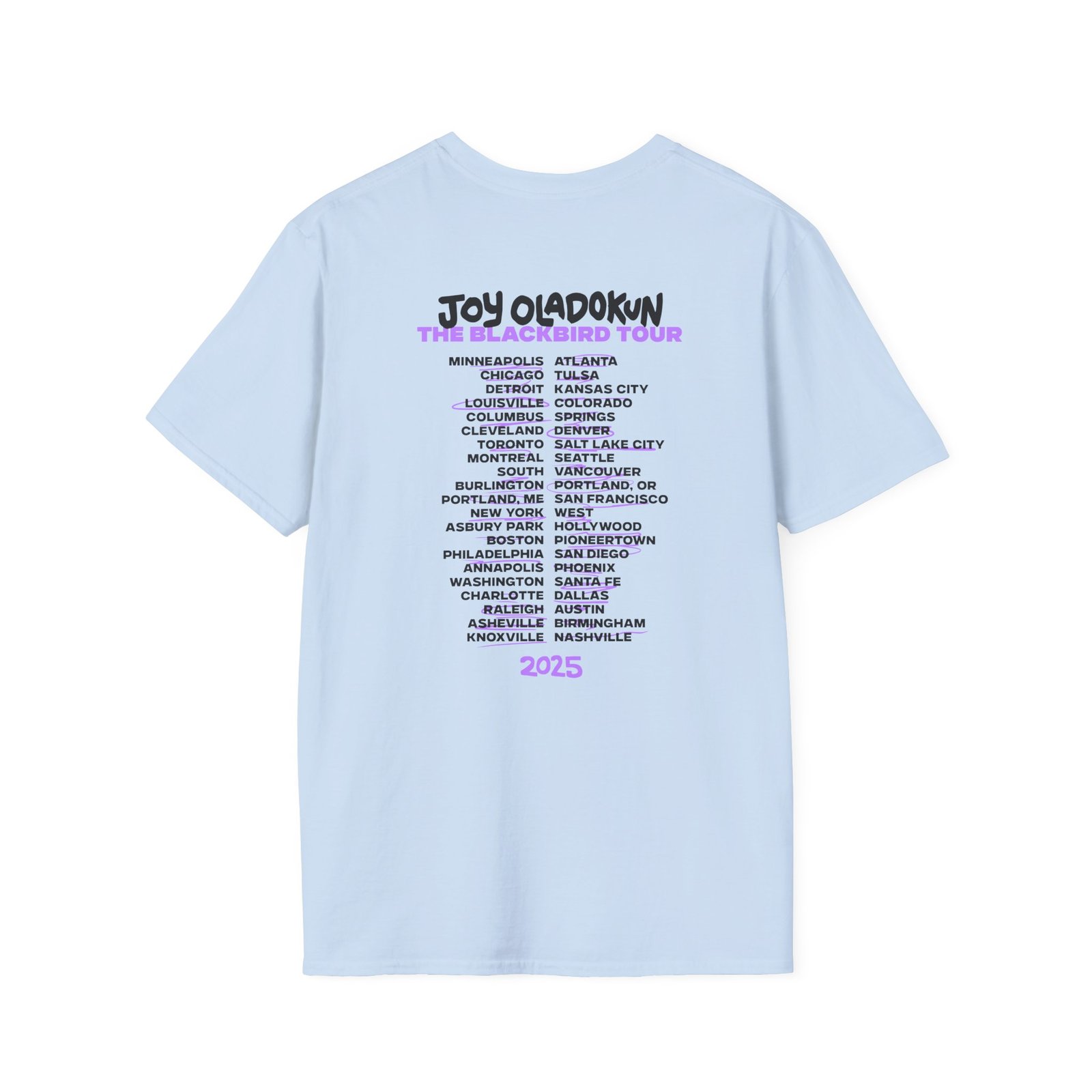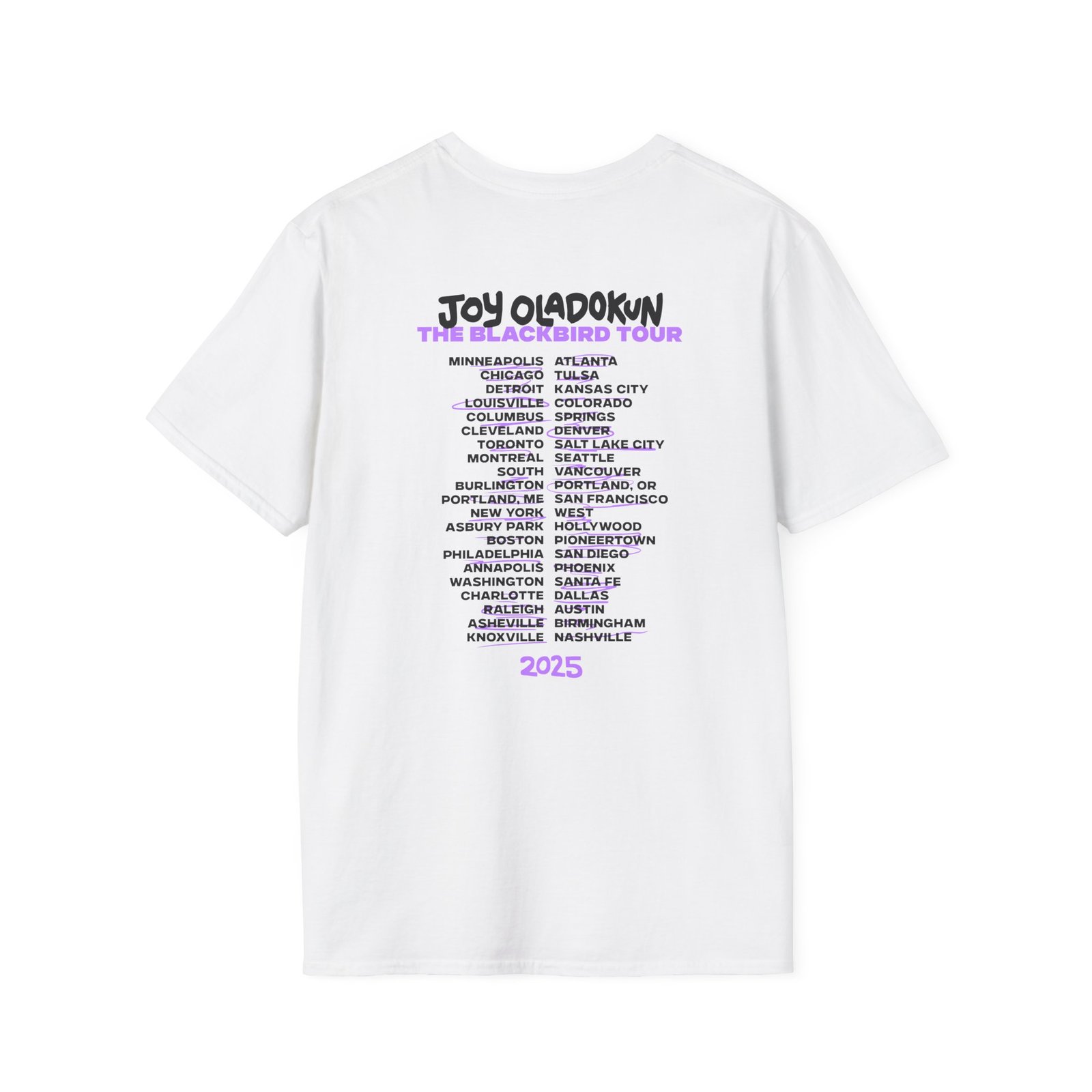 The Joy Oladokun Black Bird Tour unisex soft-style t-shirt puts a new spin on casual comfort. Made from very soft materials, this tee is 100% cotton for solid colors. Heather colors and sports grey include polyester. The shoulders have twill tape for improved durability. There are no side seams. The collar is made with ribbed knitting to prevent curling damage.