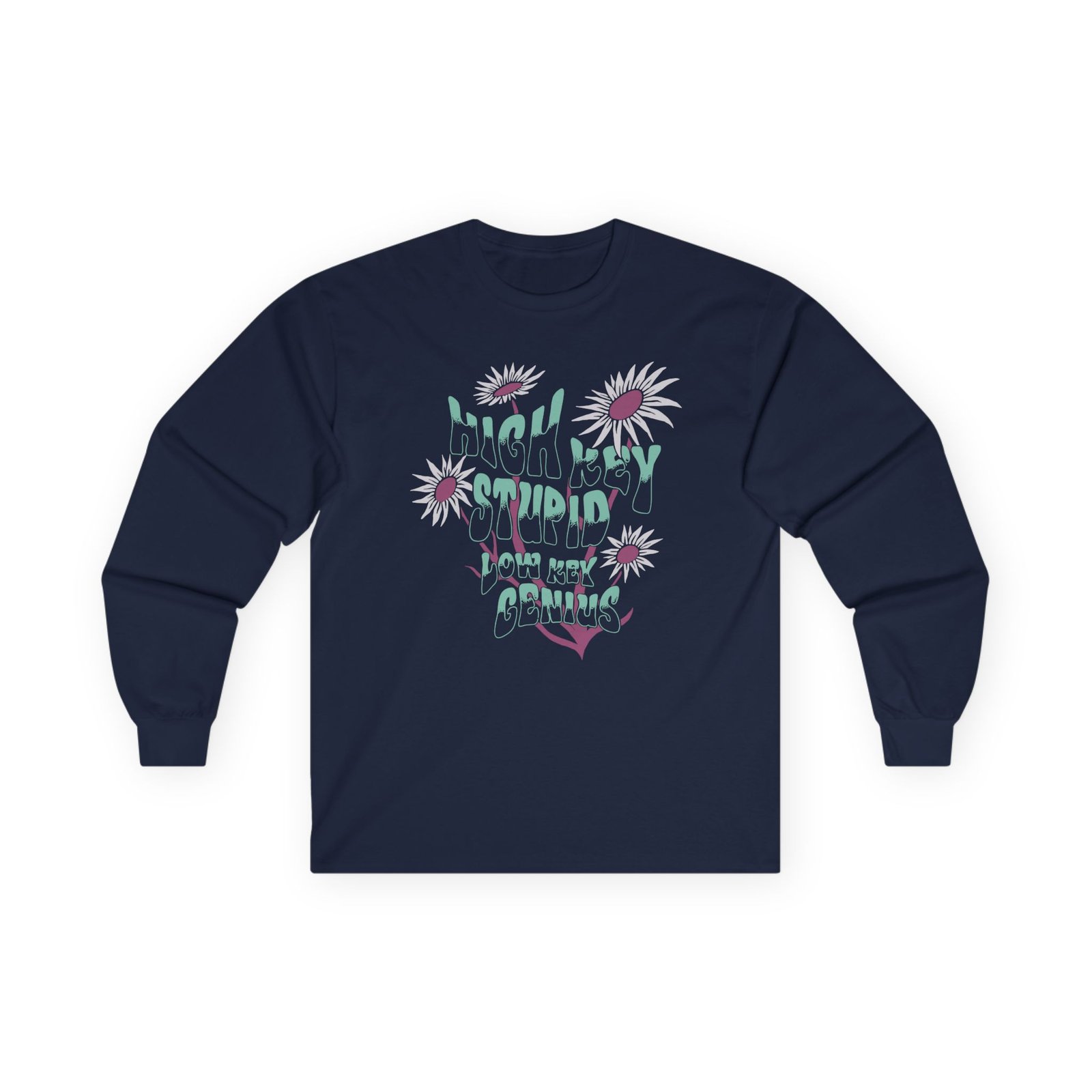 A bit more formal than a standard-issue t-shirt, the Kallmekris High Key Stupid Low Key Genius ultra cotton long sleeve tee is a clear comfort winner. The sleeves also act as a nice frame. There are no side seams. The shoulders are taped for improved durability. This makes for a good fitting around the shoulders and neck. The cotton used for these shirts is environmentally friendly.