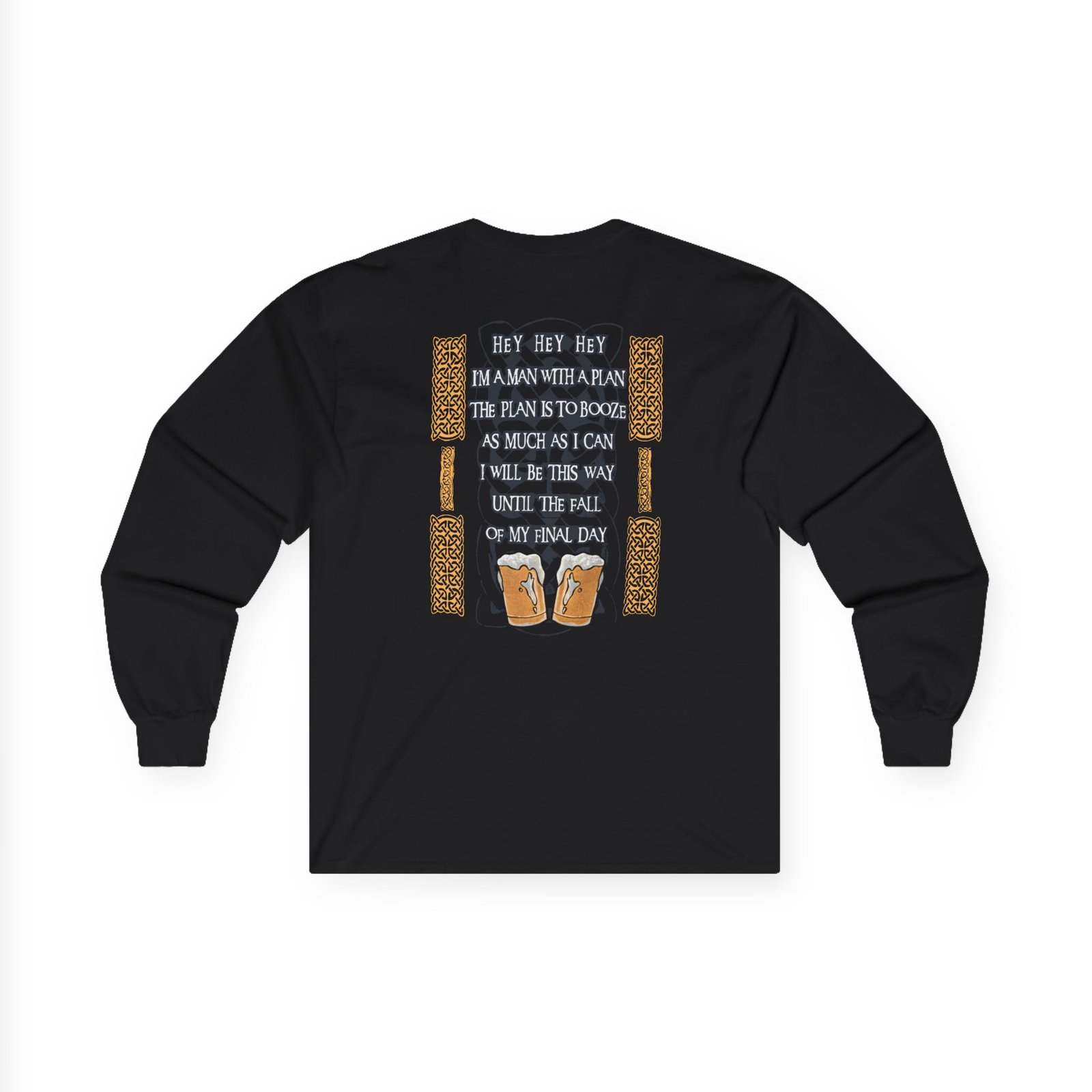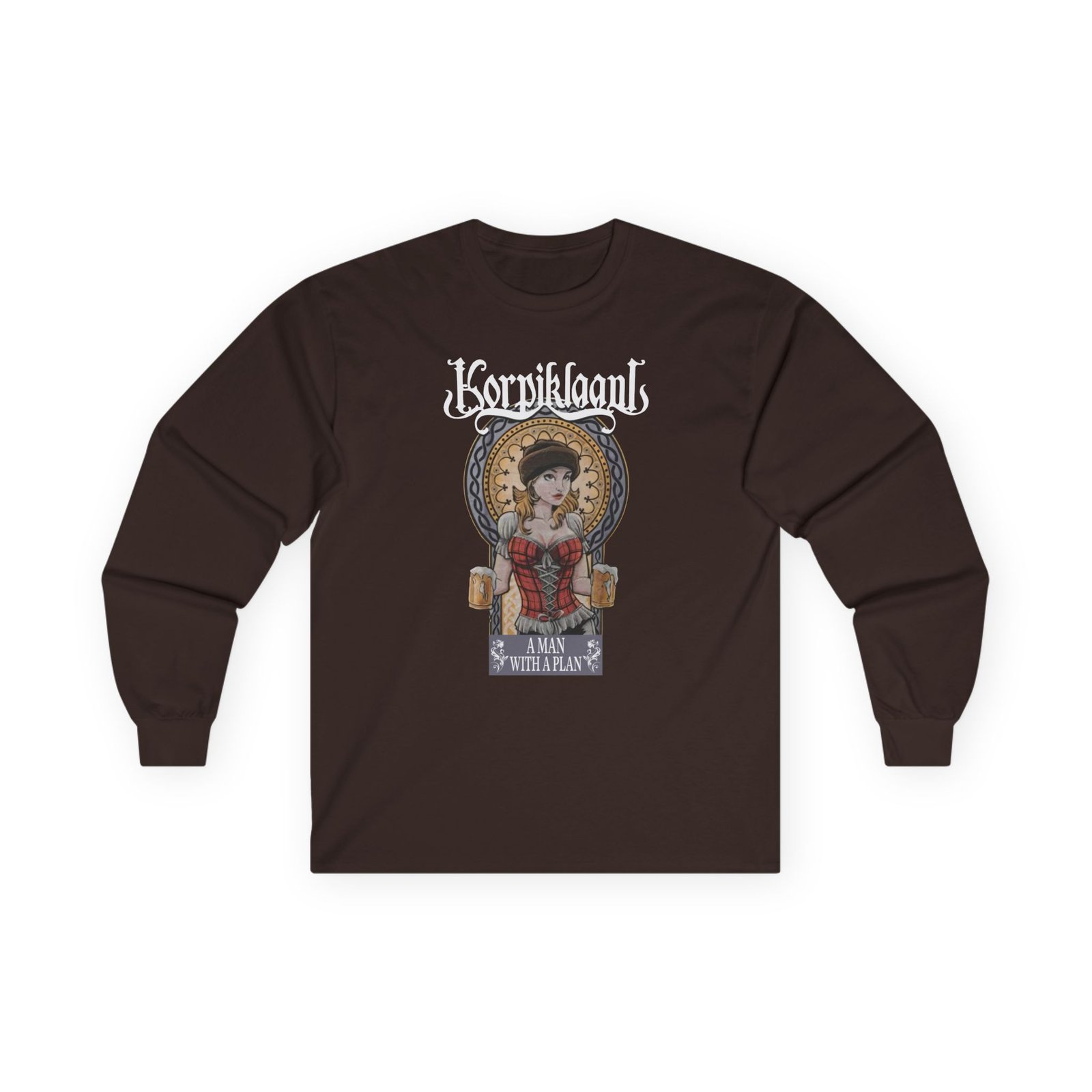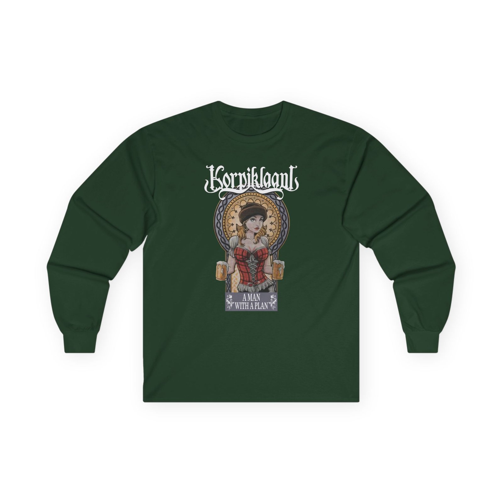 A bit more formal than a standard-issue t-shirt, the Korpiklaani a Man With a Plan ultra cotton long sleeve tee is a clear comfort winner. The sleeves also act as a nice frame. There are no side seams. The shoulders are taped for improved durability. This makes for a good fitting around the shoulders and neck. The cotton used for these shirts is environmentally friendly.