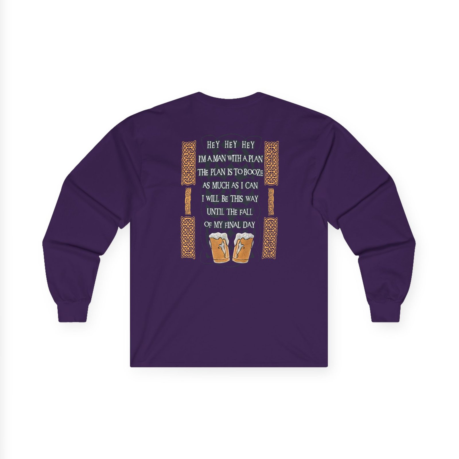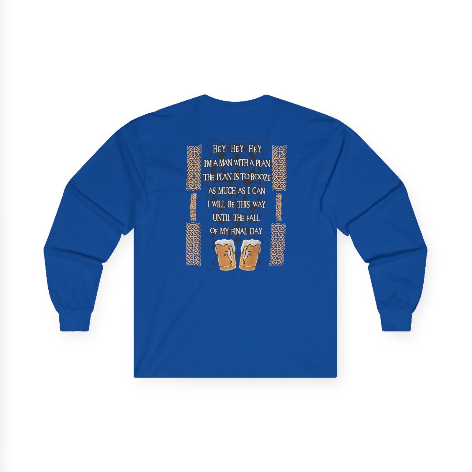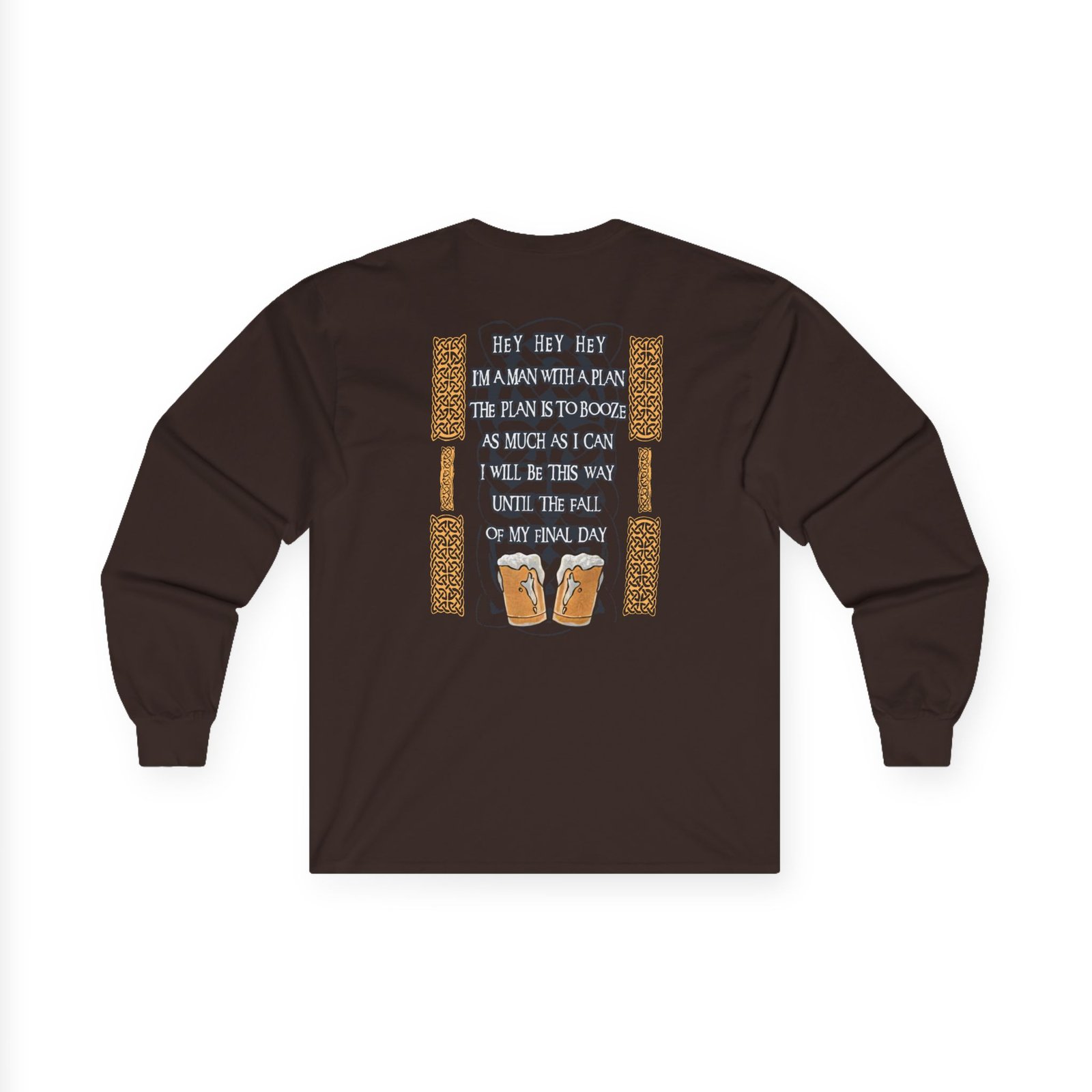 A bit more formal than a standard-issue t-shirt, the Korpiklaani a Man With a Plan ultra cotton long sleeve tee is a clear comfort winner. The sleeves also act as a nice frame. There are no side seams. The shoulders are taped for improved durability. This makes for a good fitting around the shoulders and neck. The cotton used for these shirts is environmentally friendly.