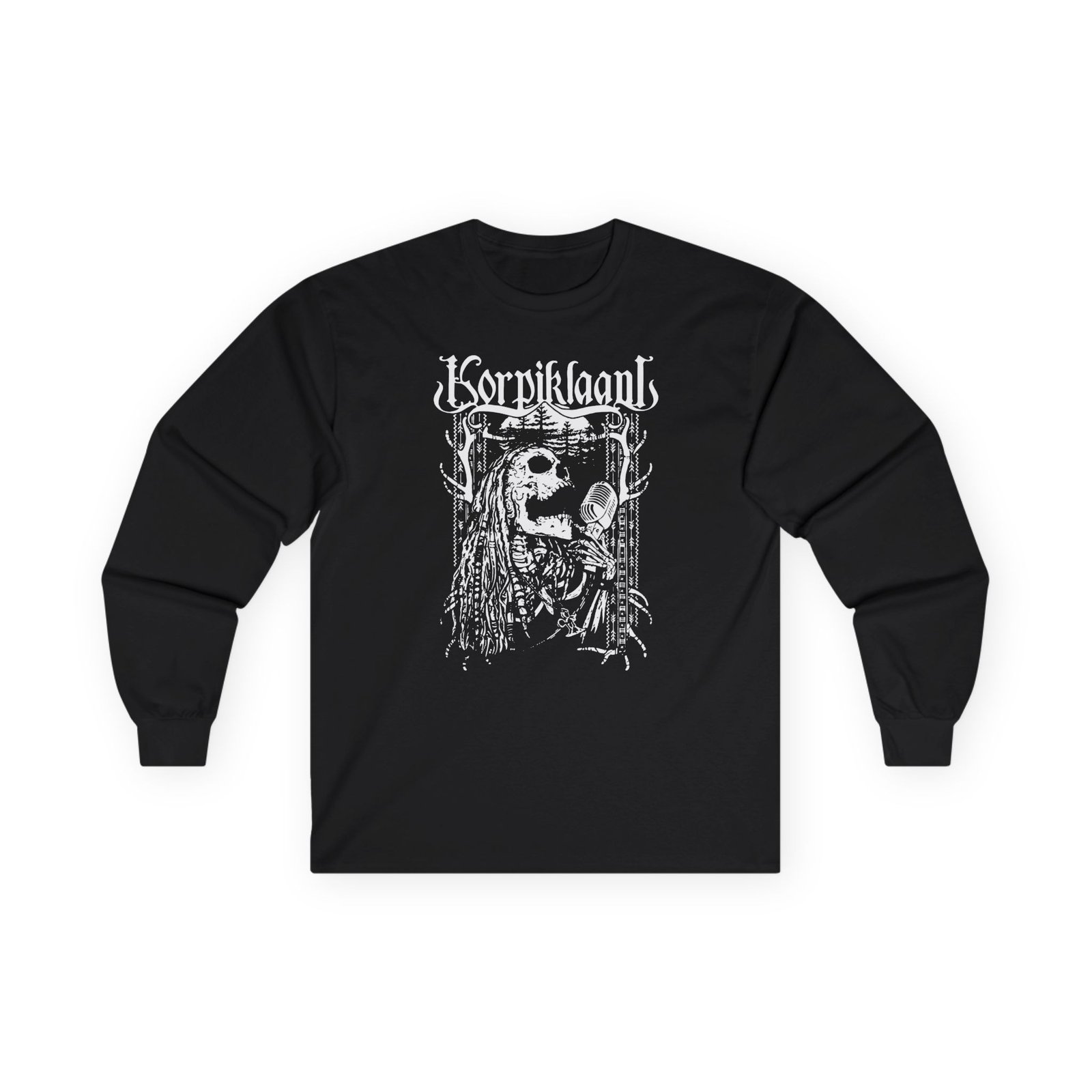 A bit more formal than a standard-issue t-shirt, the Korpiklaani What's My Message ultra cotton long sleeve tee is a clear comfort winner. The sleeves also act as a nice frame. There are no side seams. The shoulders are taped for improved durability. This makes for a good fitting around the shoulders and neck. The cotton used for these shirts is environmentally friendly.