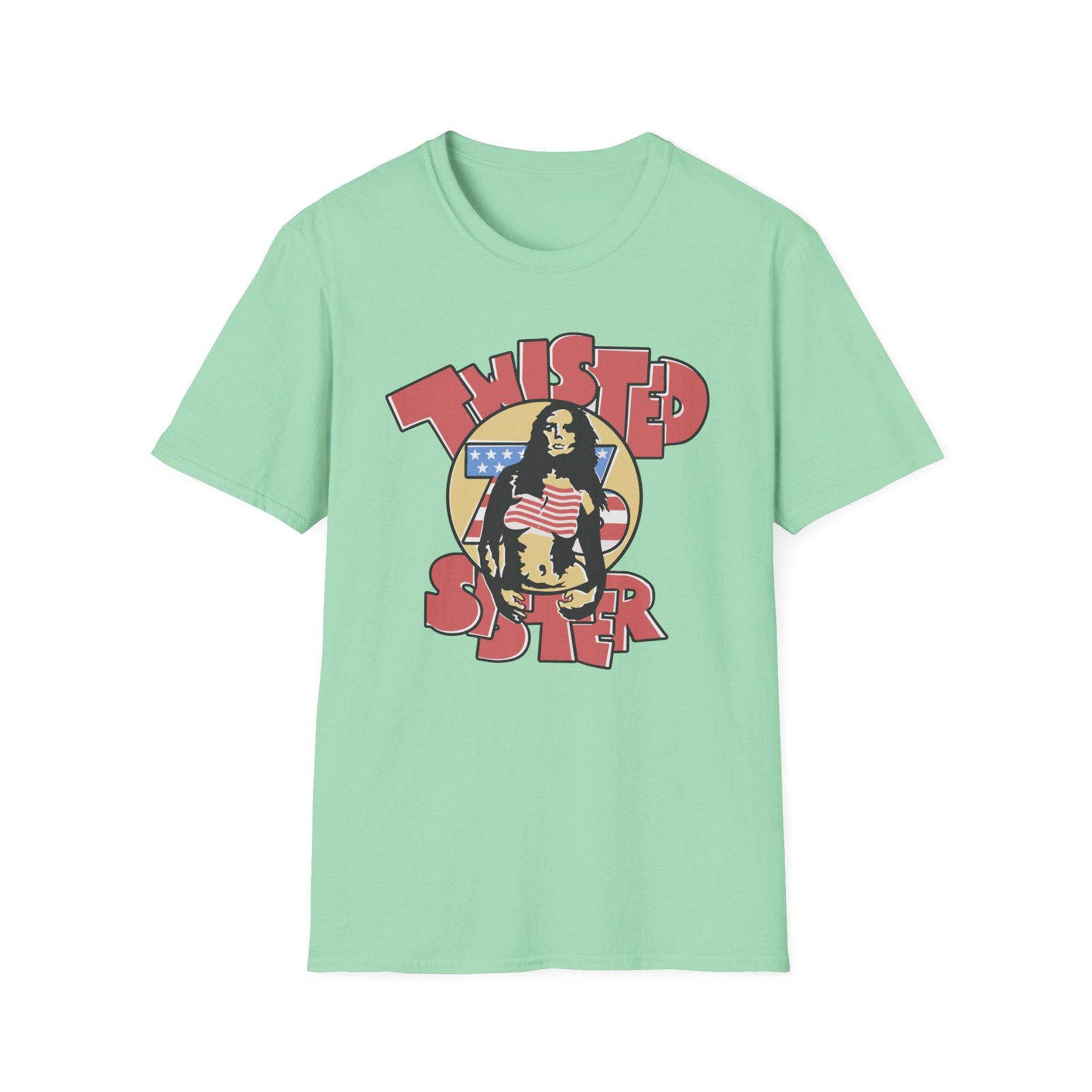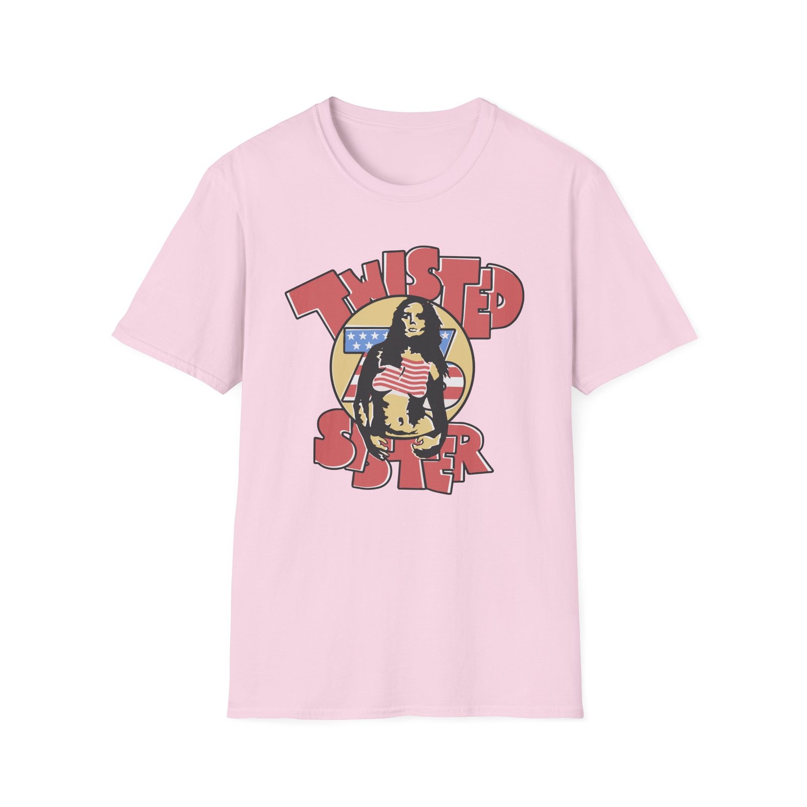 The Ladies Stars and Stripes Twisted Sister unisex soft-style t-shirt puts a new spin on casual comfort. Made from very soft materials, this tee is 100% cotton for solid colors. Heather colors and sports grey include polyester. The shoulders have twill tape for improved durability. There are no side seams. The collar is made with ribbed knitting to prevent curling damage.