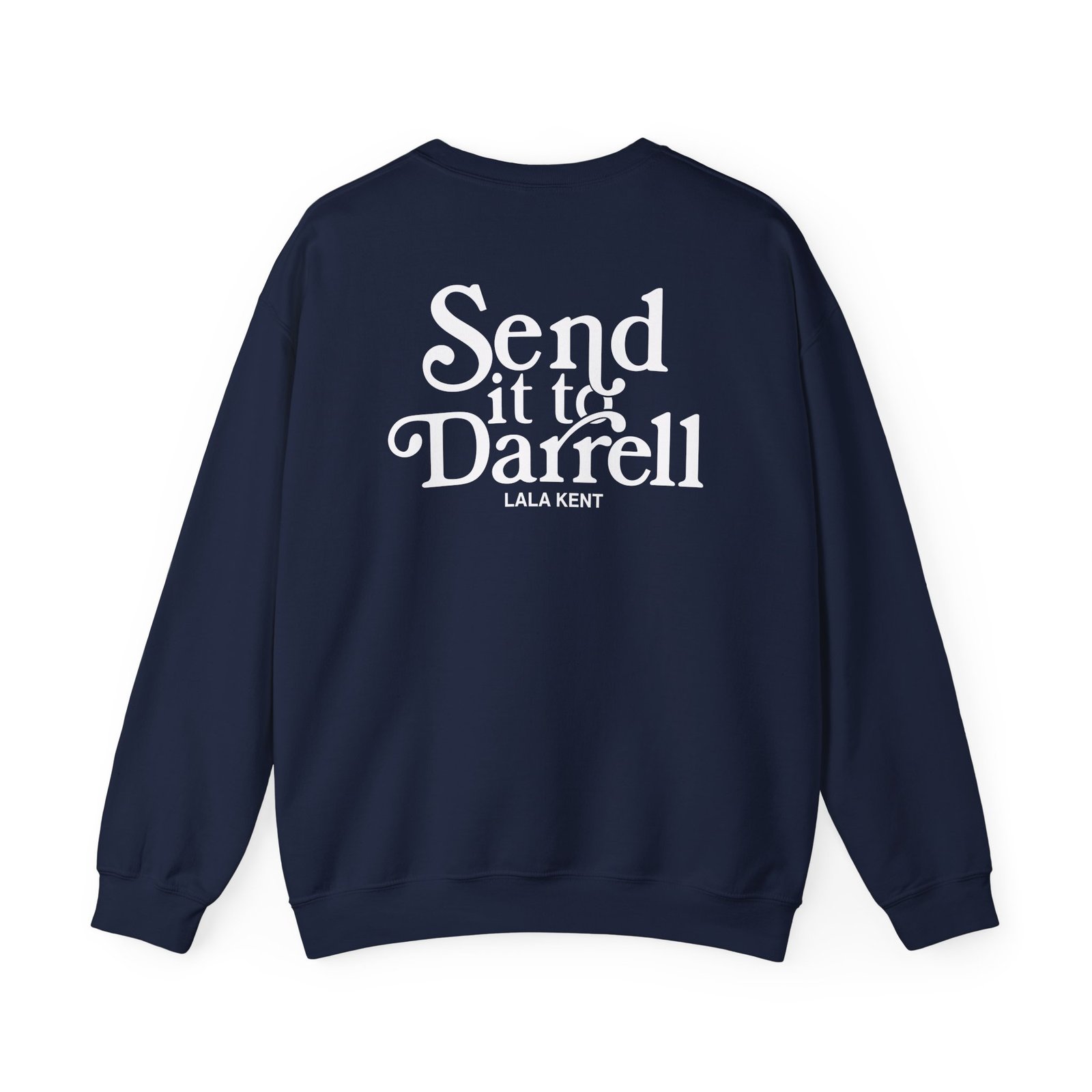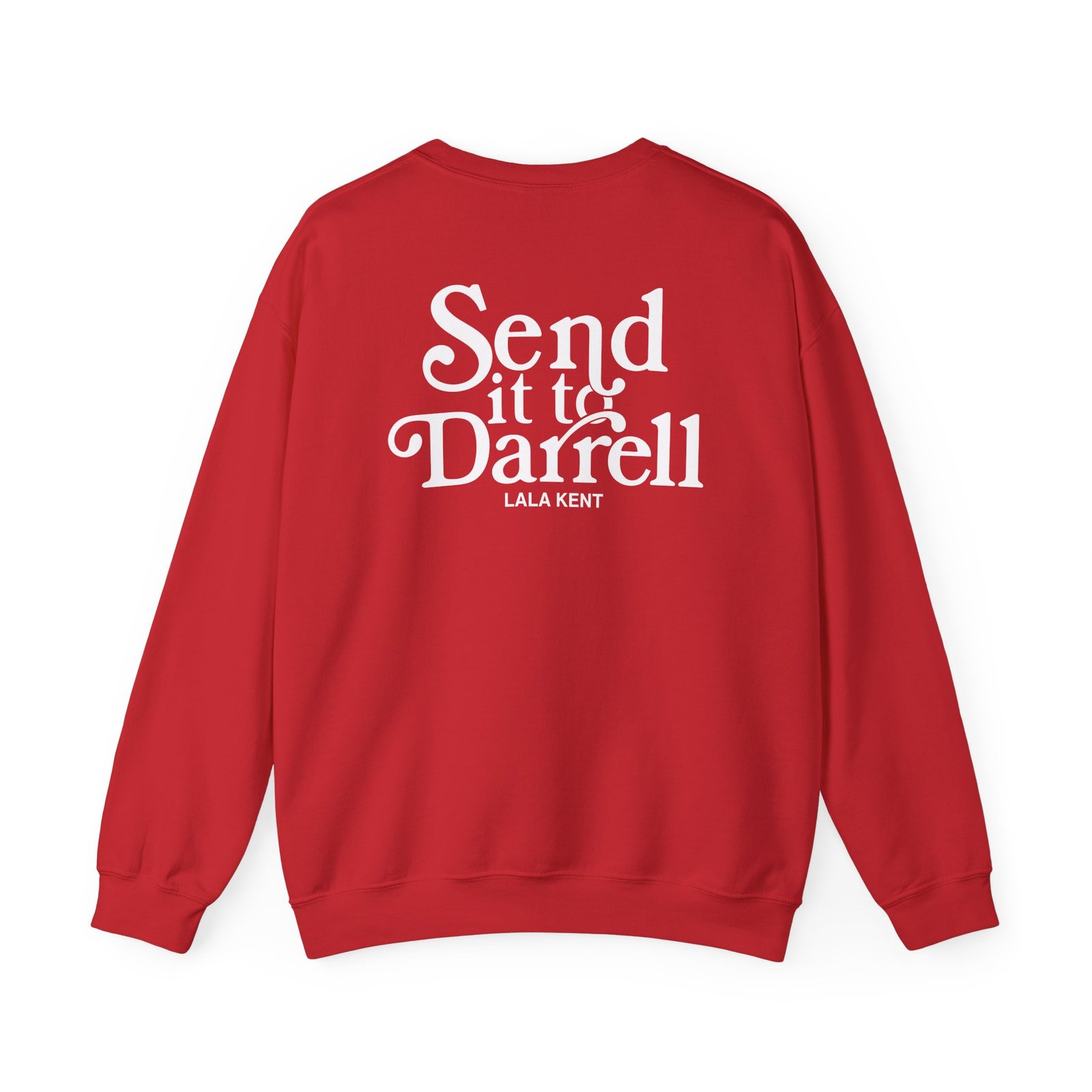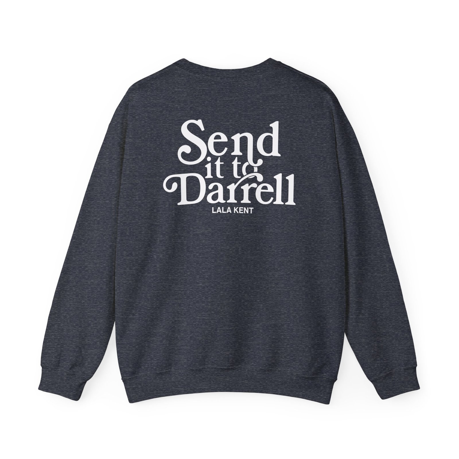 Ideal for any situation, a Lala Kent Send It to Darrell unisex heavy blend crewneck sweatshirt is pure comfort. These garments are made from polyester and cotton. This combination helps designs come out looking fresh and beautiful. The collar is ribbed knit, so it retains its shape even after washing. There are no itchy side seams on these sweaters.