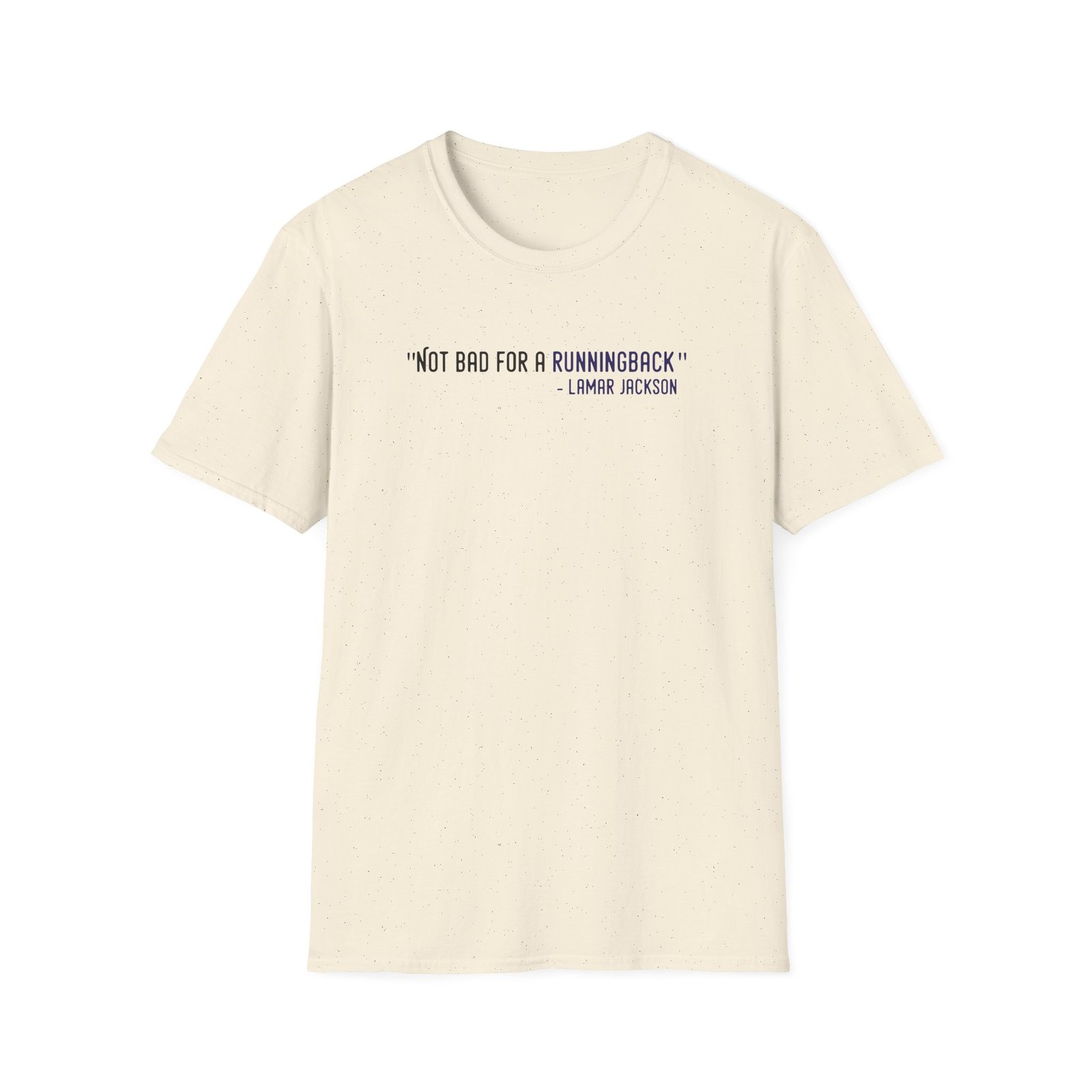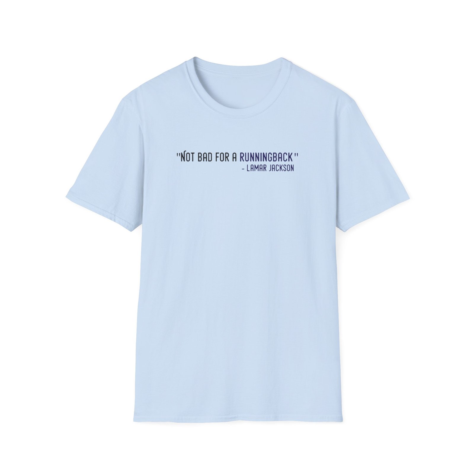 The Lamar Jackson The Prodigy Not Bad for a Running Back unisex soft-style t-shirt puts a new spin on casual comfort. Made from very soft materials, this tee is 100% cotton for solid colors. Heather colors and sports grey include polyester. The shoulders have twill tape for improved durability. There are no side seams. The collar is made with ribbed knitting to prevent curling damage.