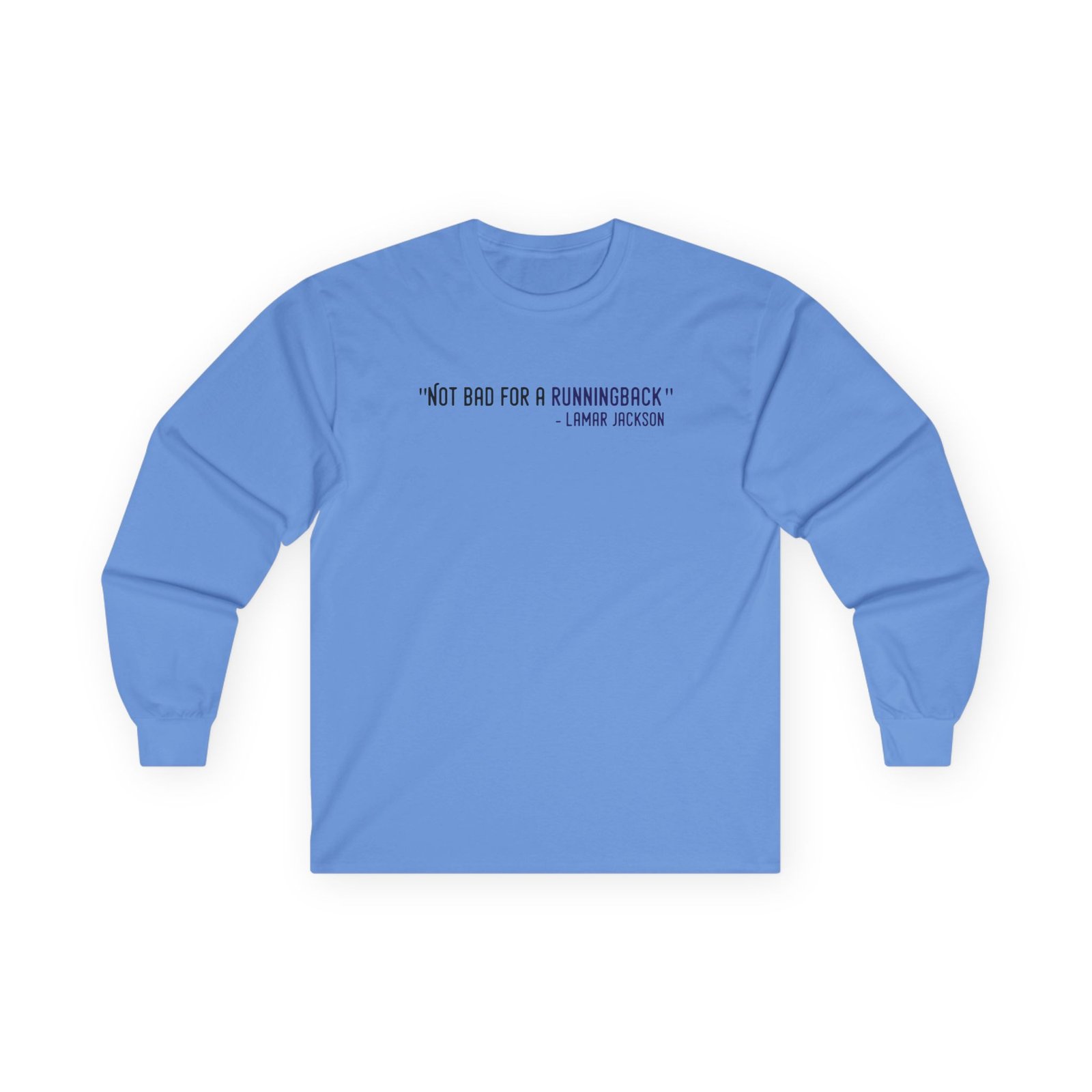 A bit more formal than a standard-issue t-shirt, the Lamar Jackson The Prodigy Not Bad for a Running Back ultra cotton long sleeve tee is a clear comfort winner. The sleeves also act as a nice frame. There are no side seams. The shoulders are taped for improved durability. This makes for a good fitting around the shoulders and neck. The cotton used for these shirts is environmentally friendly.