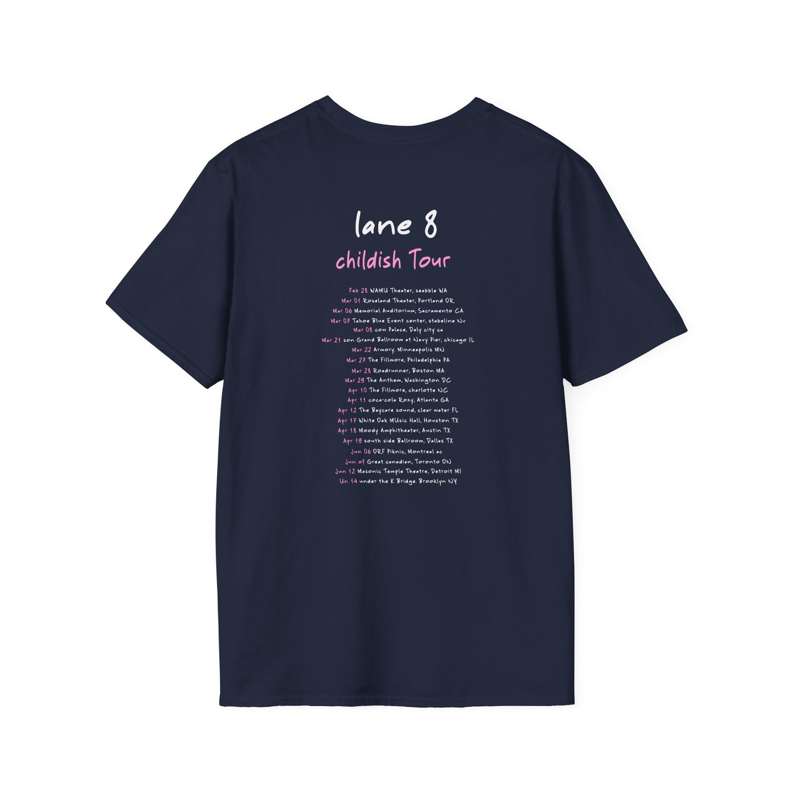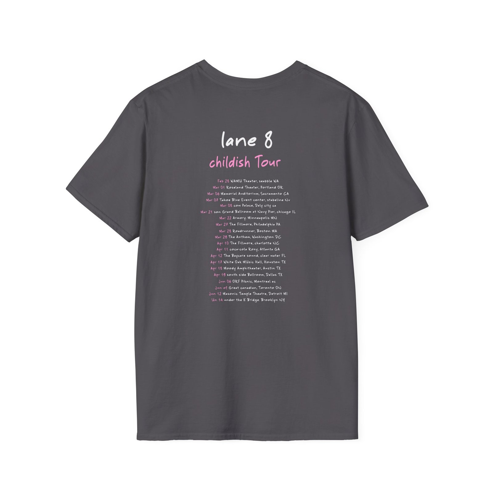 The Lane 8 Childish Tour unisex soft-style t-shirt puts a new spin on casual comfort. Made from very soft materials, this tee is 100% cotton for solid colors. Heather colors and sports grey include polyester. The shoulders have twill tape for improved durability. There are no side seams. The collar is made with ribbed knitting to prevent curling damage.