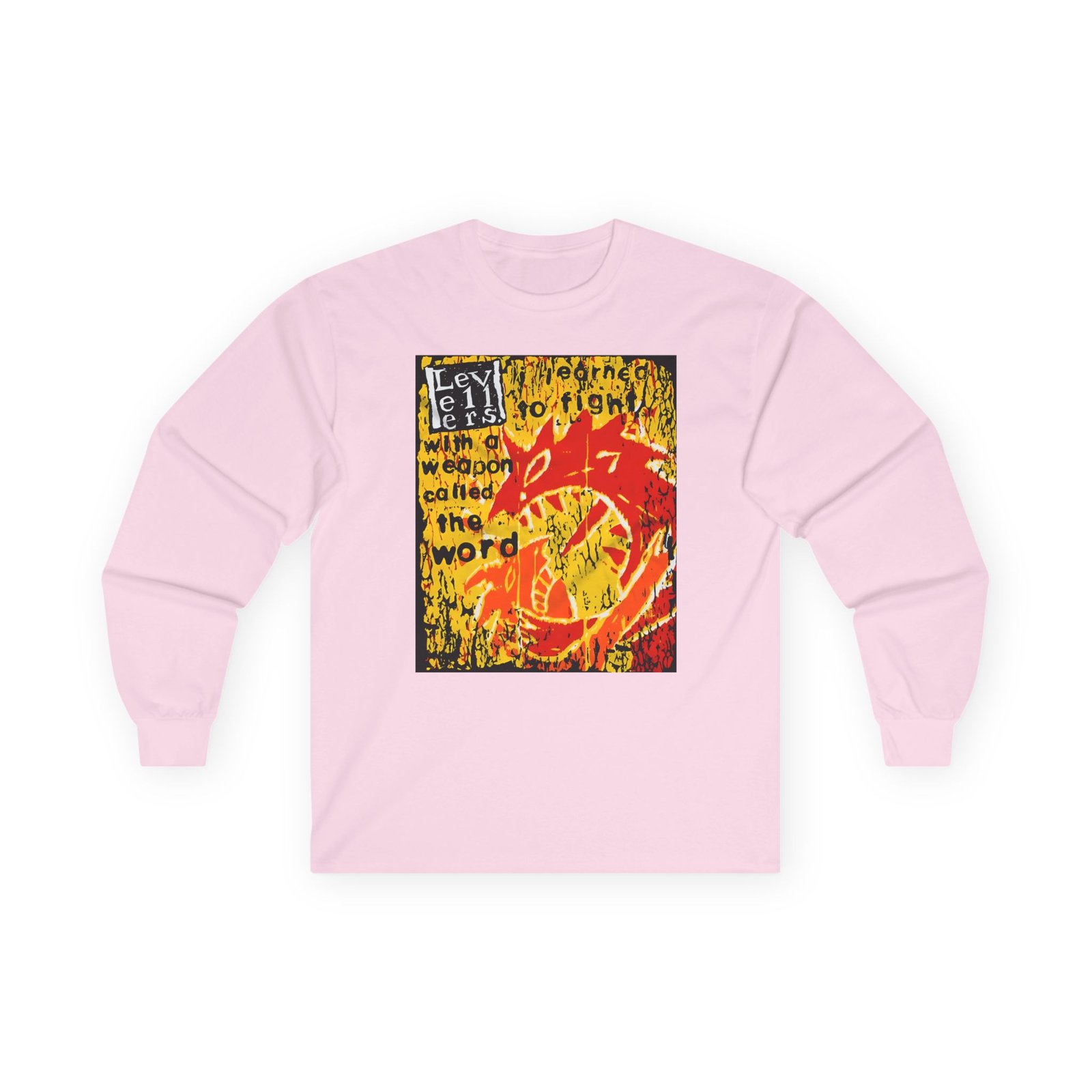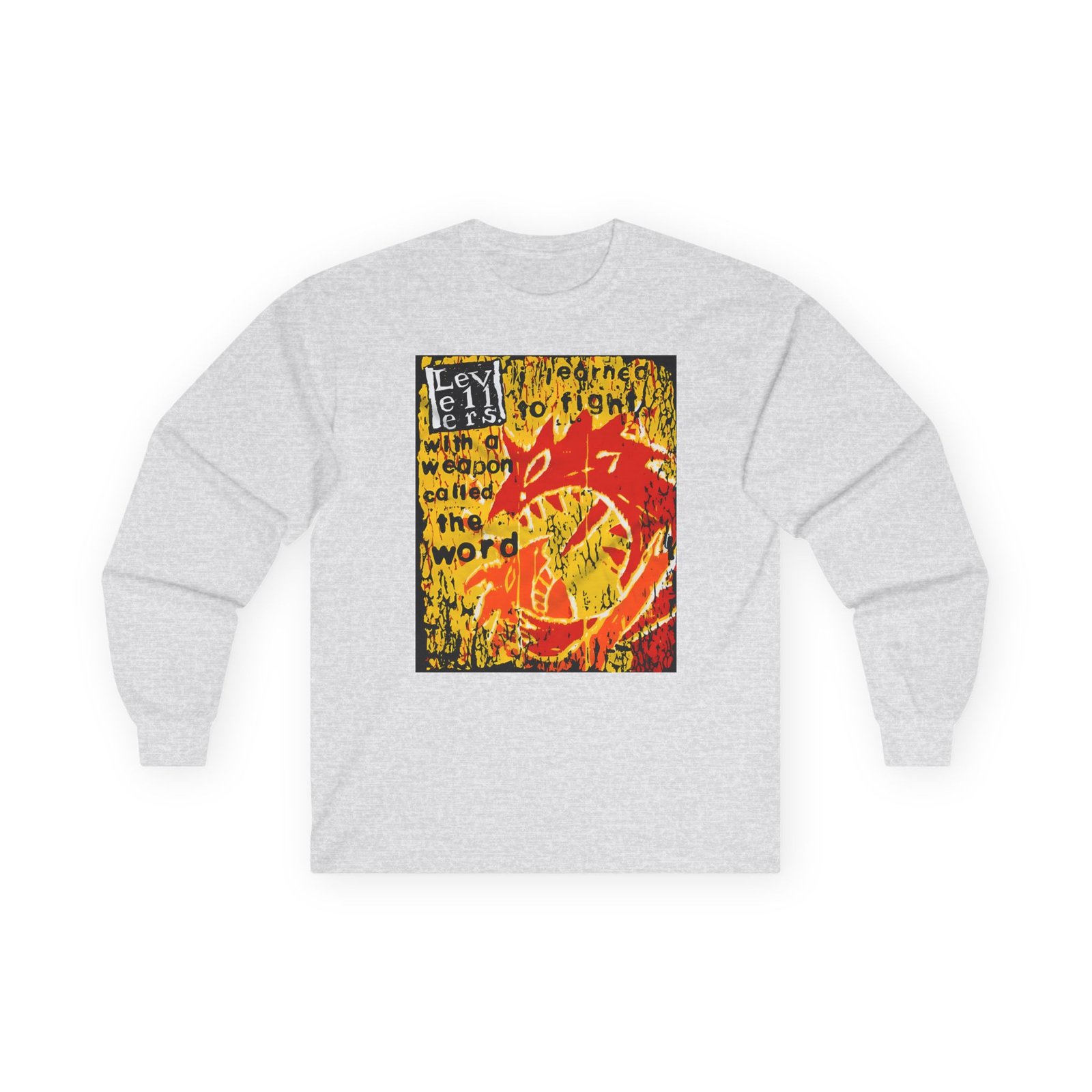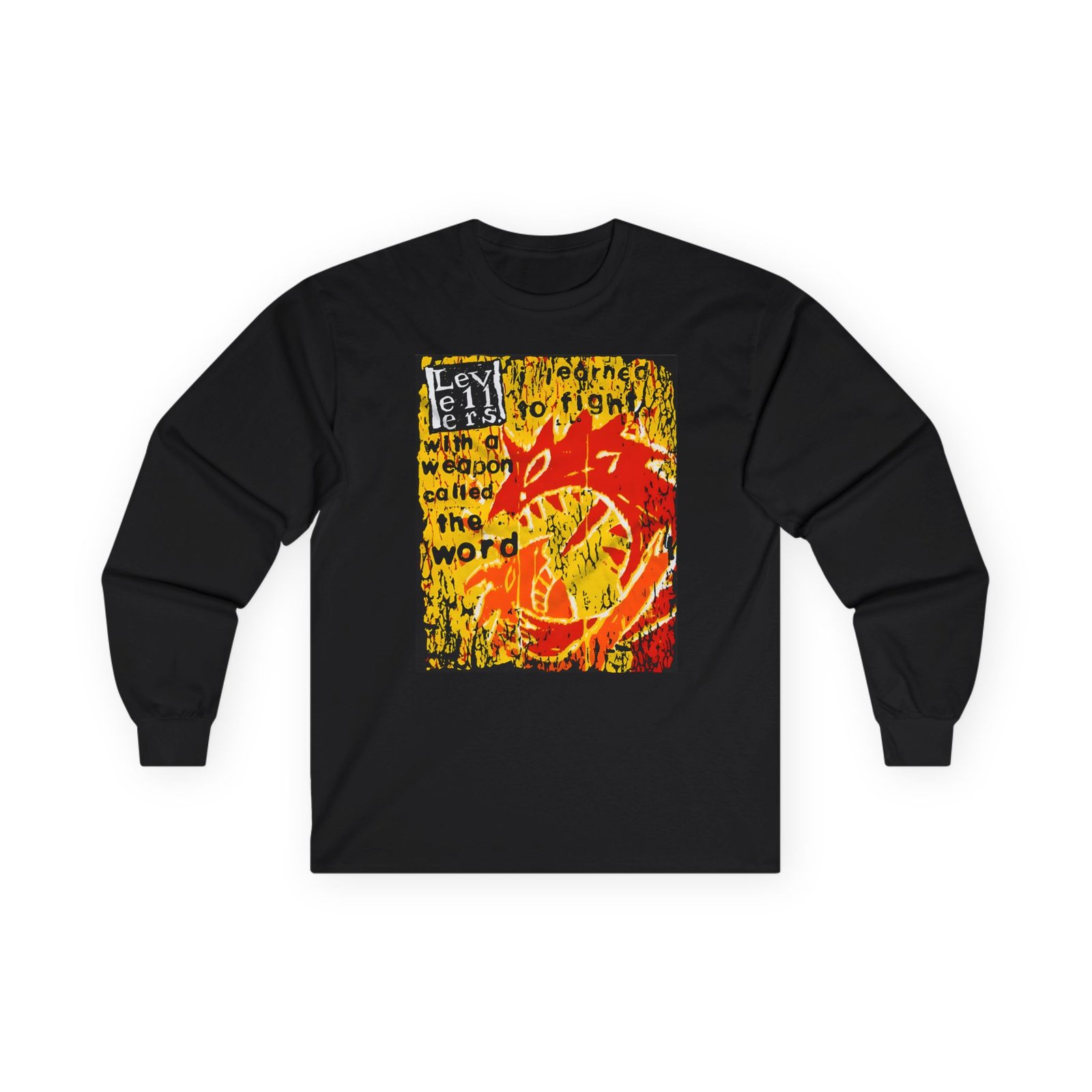A bit more formal than a standard-issue t-shirt, the Levellers a Weapon Called the Word ultra cotton long sleeve tee is a clear comfort winner. The sleeves also act as a nice frame. There are no side seams. The shoulders are taped for improved durability. This makes for a good fitting around the shoulders and neck. The cotton used for these shirts is environmentally friendly.