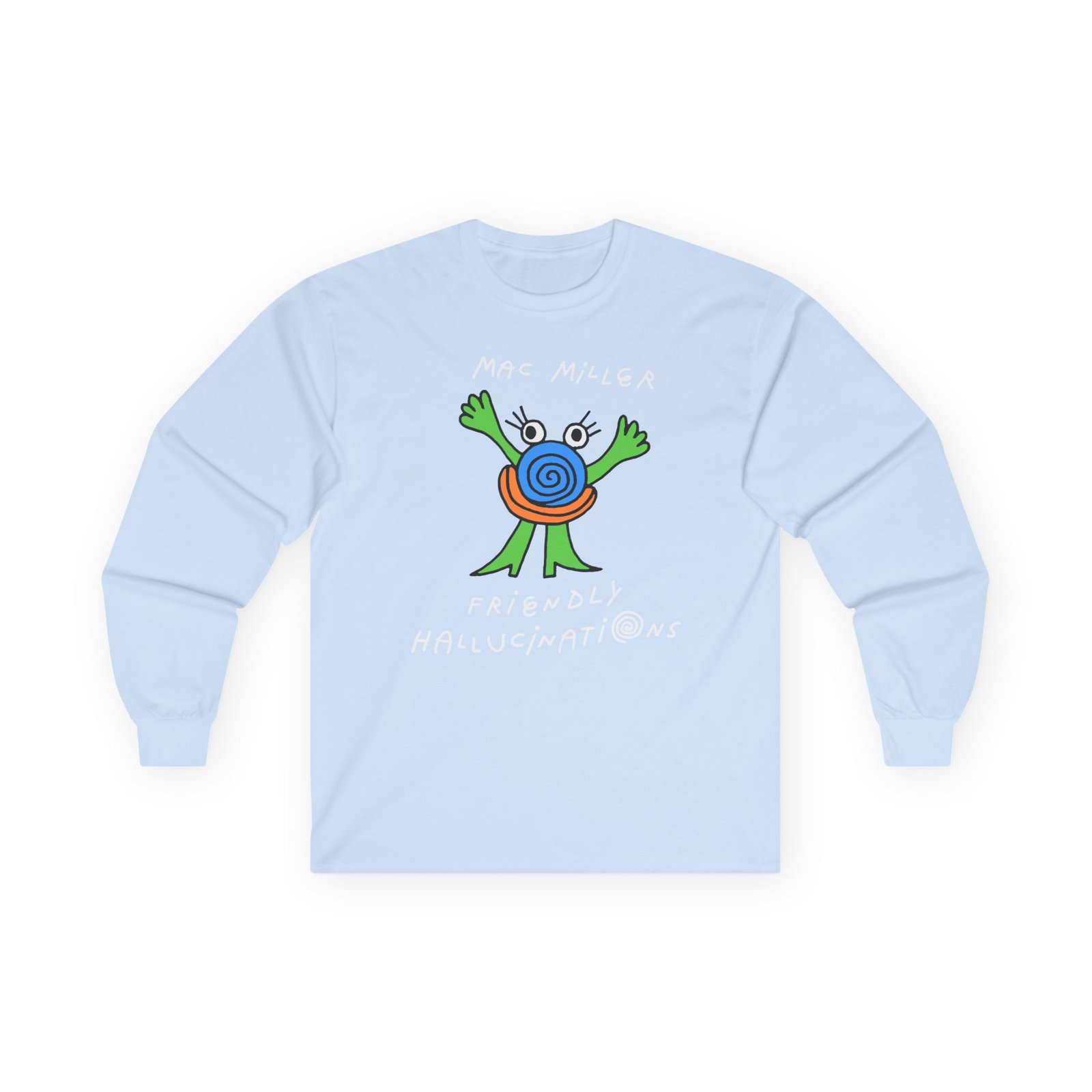 A bit more formal than a standard-issue t-shirt, the Mac Miller Friendly Hallucinations ultra cotton long sleeve tee is a clear comfort winner. The sleeves also act as a nice frame. There are no side seams. The shoulders are taped for improved durability. This makes for a good fitting around the shoulders and neck. The cotton used for these shirts is environmentally friendly.