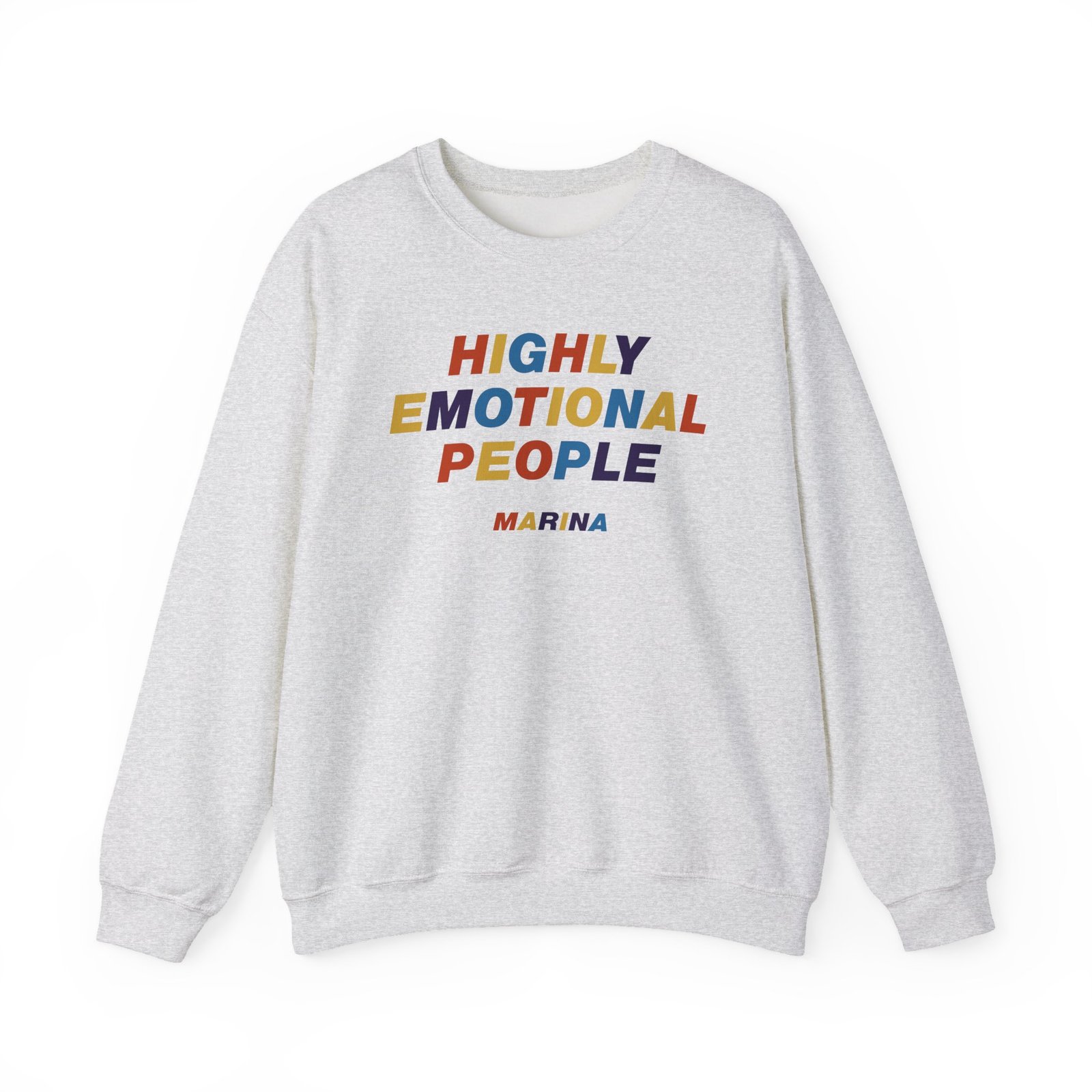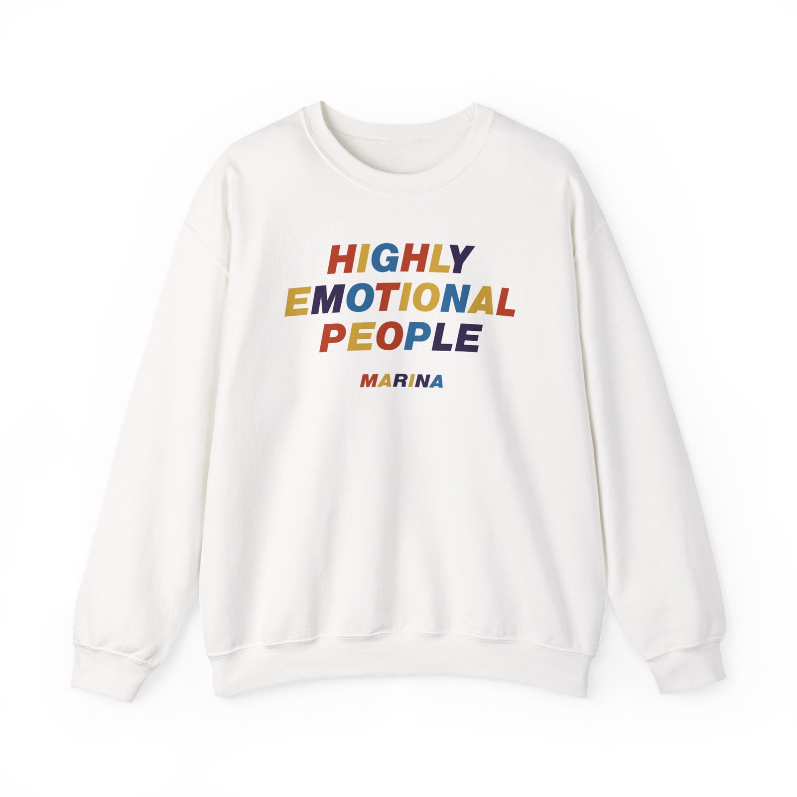 Ideal for any situation, a Marina Highly Emotional People unisex heavy blend crewneck sweatshirt is pure comfort. These garments are made from polyester and cotton. This combination helps designs come out looking fresh and beautiful. The collar is ribbed knit, so it retains its shape even after washing. There are no itchy side seams on these sweaters.