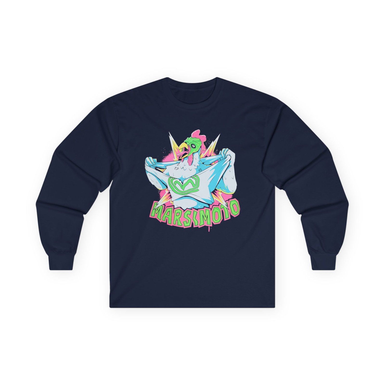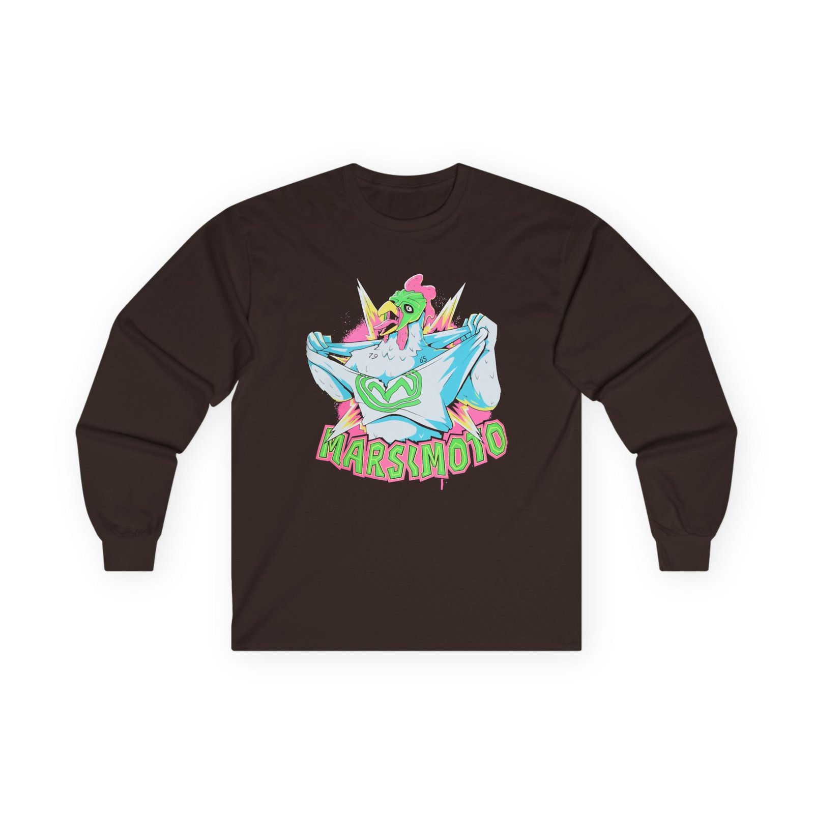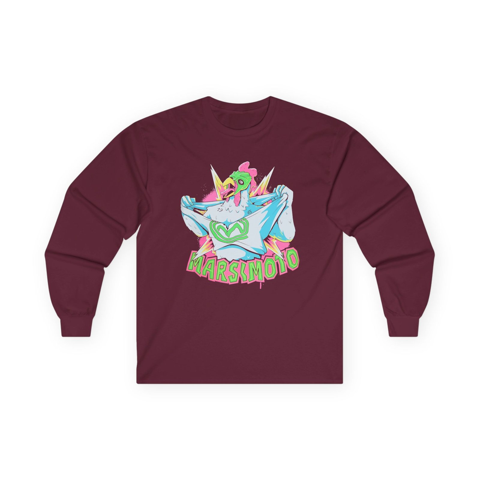 A bit more formal than a standard-issue t-shirt, the Marsimoto Chicken Terror ultra cotton long sleeve tee is a clear comfort winner. The sleeves also act as a nice frame. There are no side seams. The shoulders are taped for improved durability. This makes for a good fitting around the shoulders and neck. The cotton used for these shirts is environmentally friendly.