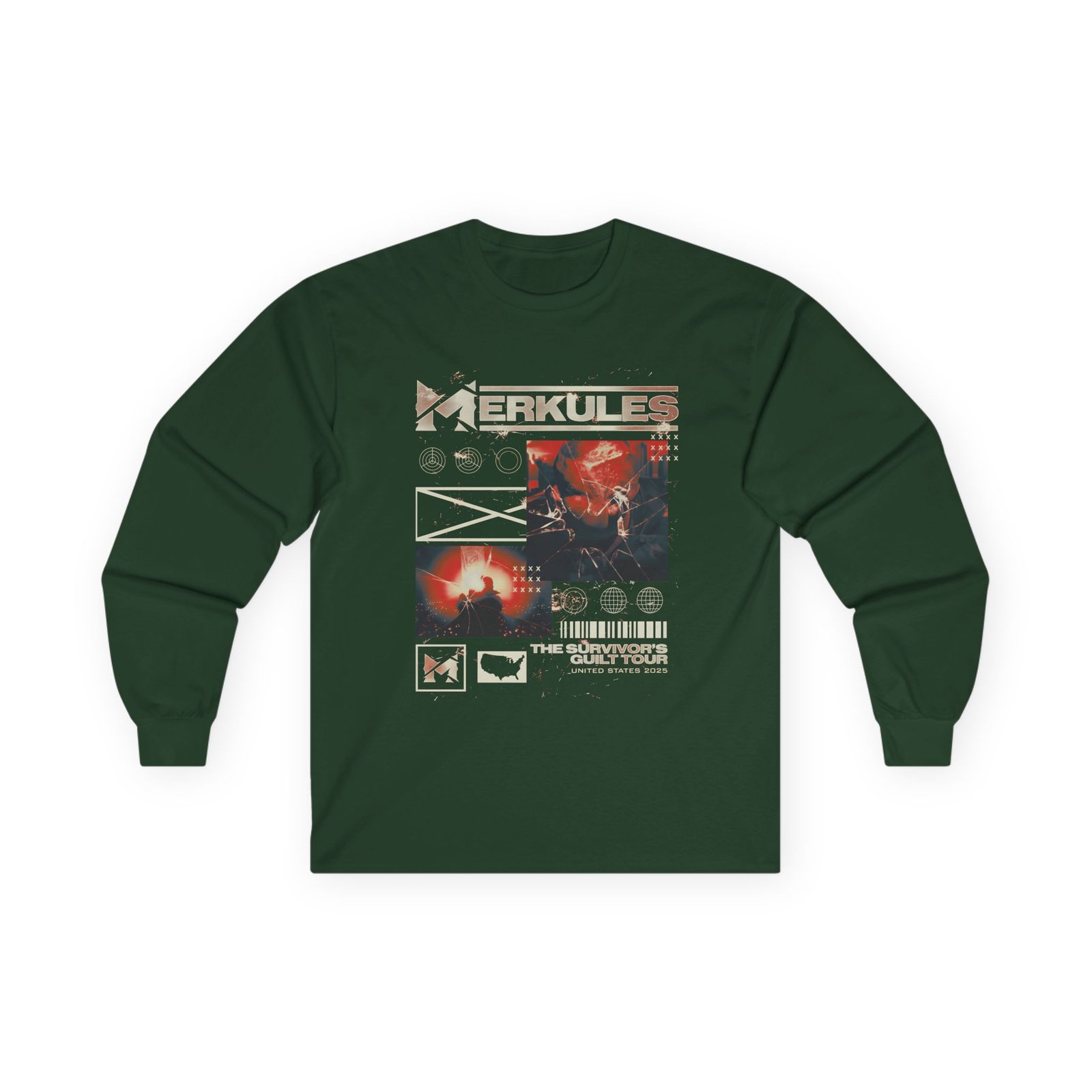 A bit more formal than a standard-issue t-shirt, the Merkules Survivor's Guilt Collage ultra cotton long sleeve tee is a clear comfort winner. The sleeves also act as a nice frame. There are no side seams. The shoulders are taped for improved durability. This makes for a good fitting around the shoulders and neck. The cotton used for these shirts is environmentally friendly.