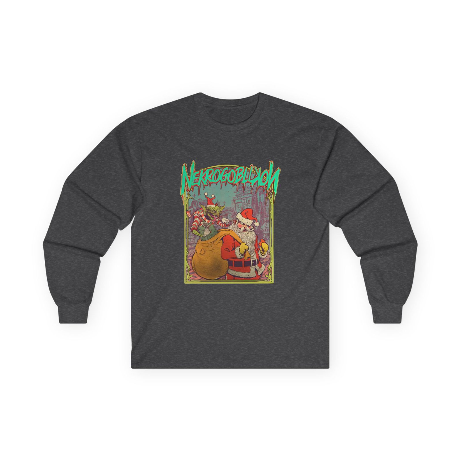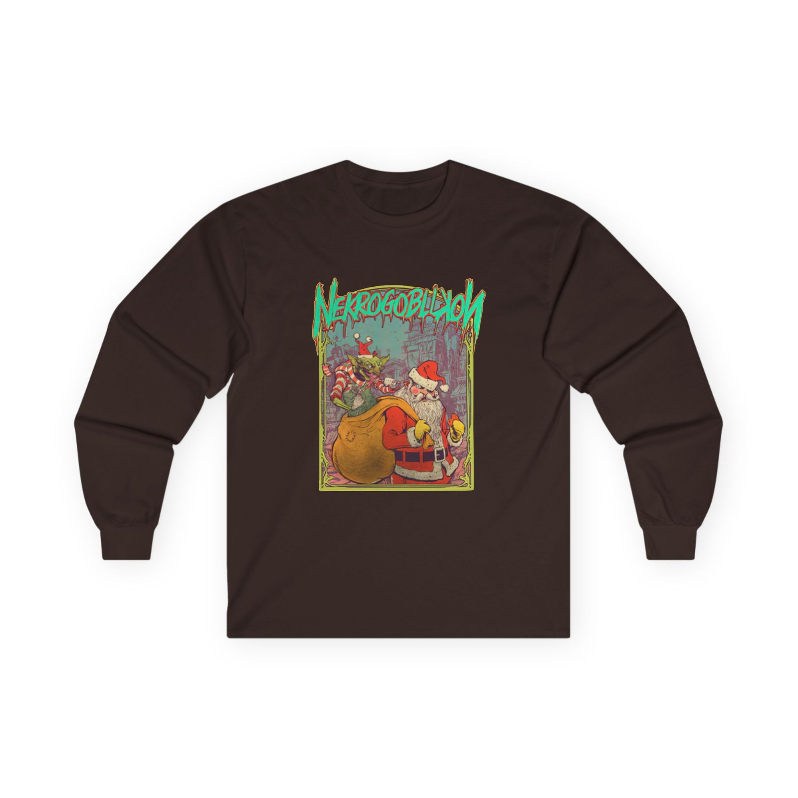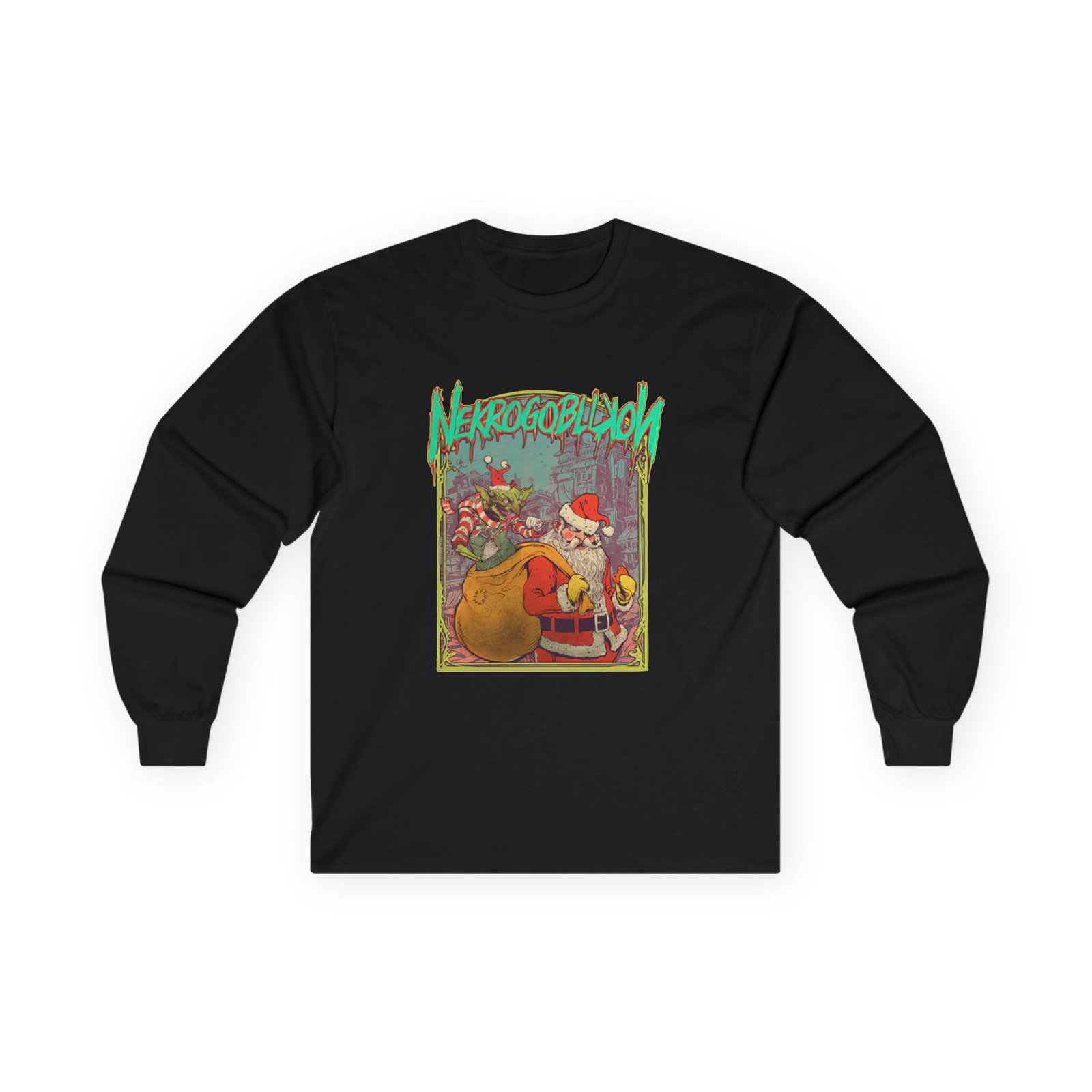 A bit more formal than a standard-issue t-shirt, the Nekrogoblikon 2023 Xmas ultra cotton long sleeve tee is a clear comfort winner. The sleeves also act as a nice frame. There are no side seams. The shoulders are taped for improved durability. This makes for a good fitting around the shoulders and neck. The cotton used for these shirts is environmentally friendly.
