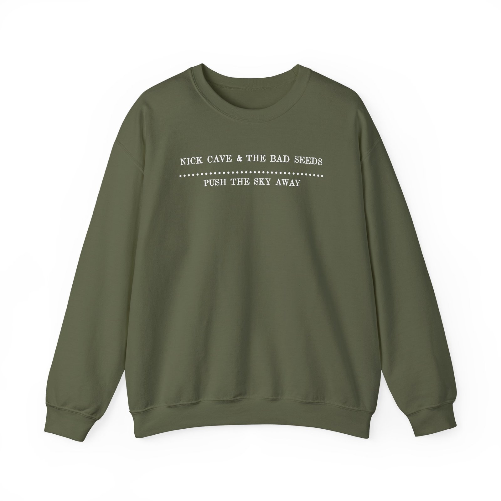 Ideal for any situation, a Nick Cave Push the Sky Away unisex heavy blend crewneck sweatshirt is pure comfort. These garments are made from polyester and cotton. This combination helps designs come out looking fresh and beautiful. The collar is ribbed knit, so it retains its shape even after washing. There are no itchy side seams on these sweaters.