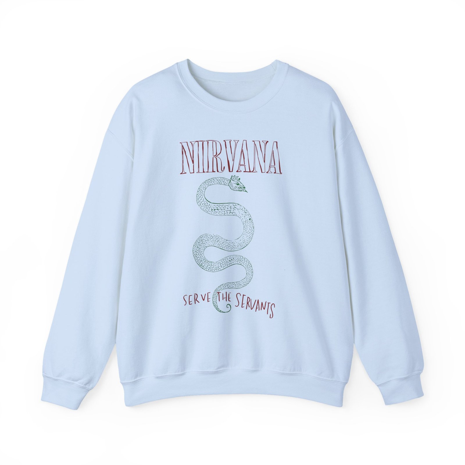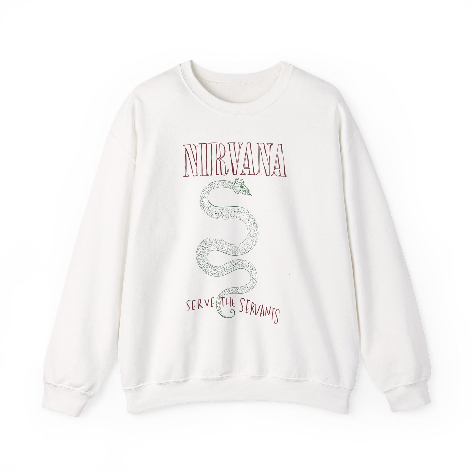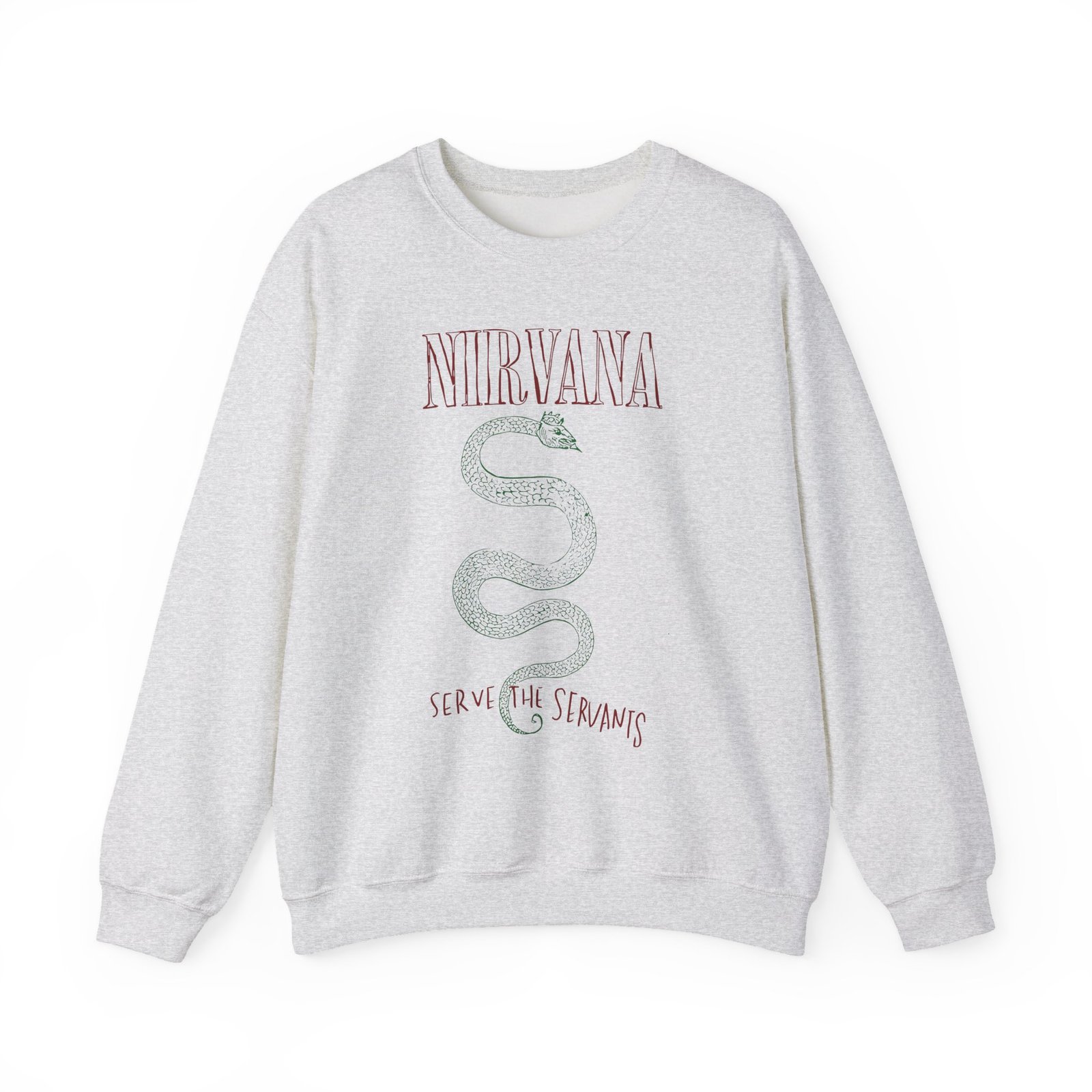 Ideal for any situation, a Nirvana Serve The Servants unisex heavy blend crewneck sweatshirt is pure comfort. These garments are made from polyester and cotton. This combination helps designs come out looking fresh and beautiful. The collar is ribbed knit, so it retains its shape even after washing. There are no itchy side seams on these sweaters.