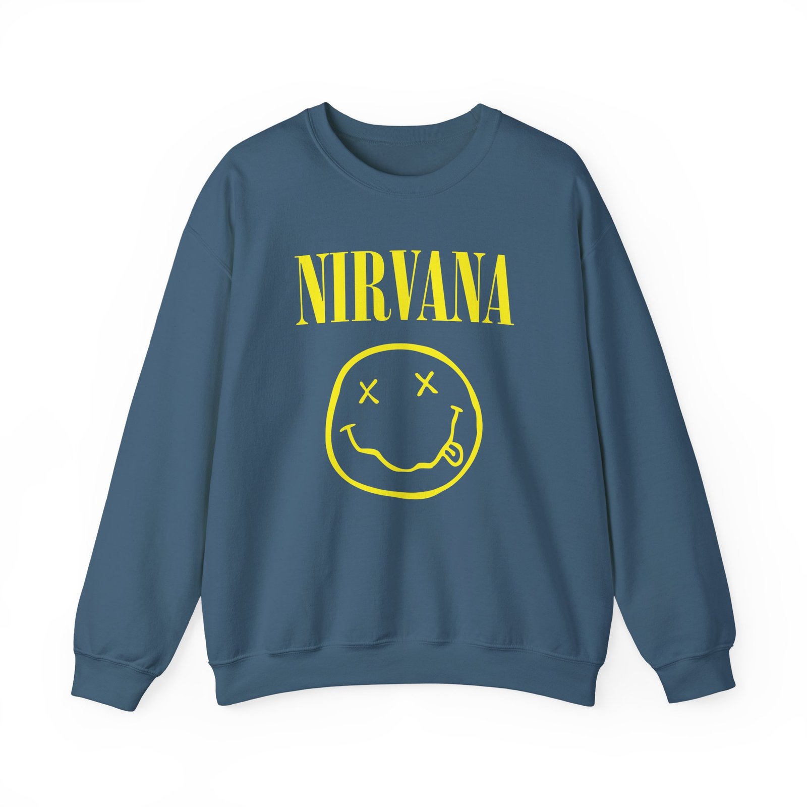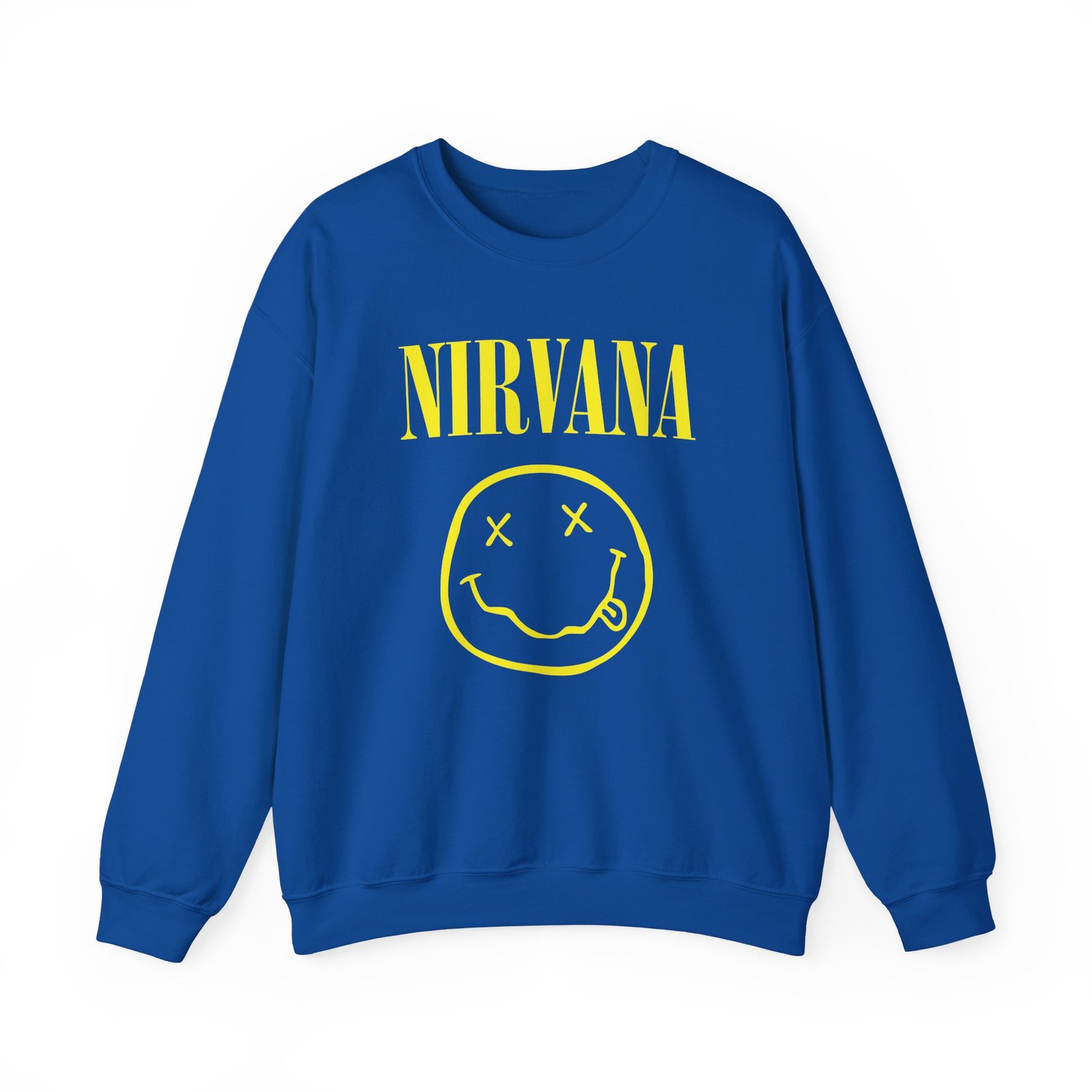 Ideal for any situation, a Nirvana Smiley unisex heavy blend crewneck sweatshirt is pure comfort. These garments are made from polyester and cotton. This combination helps designs come out looking fresh and beautiful. The collar is ribbed knit, so it retains its shape even after washing. There are no itchy side seams on these sweaters.