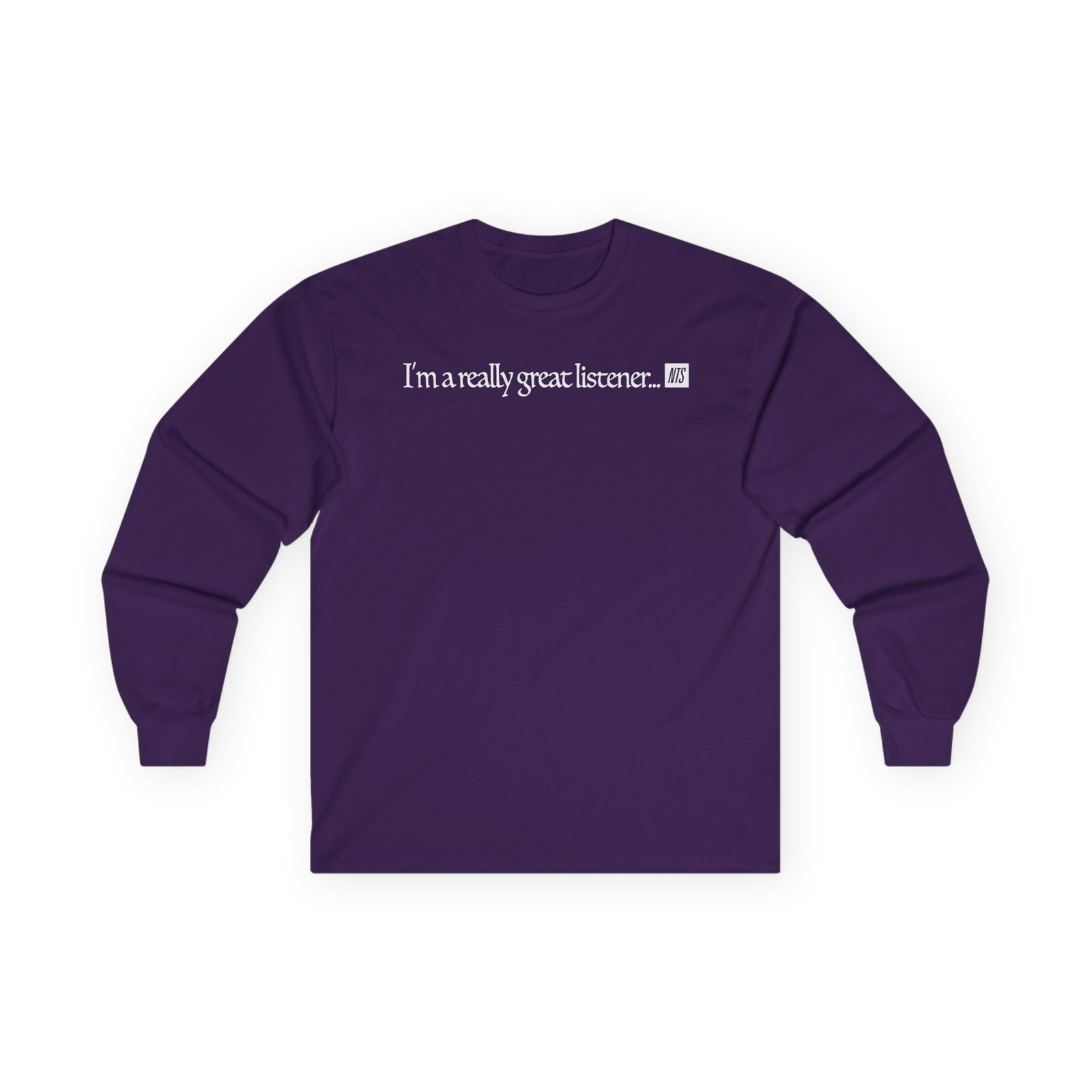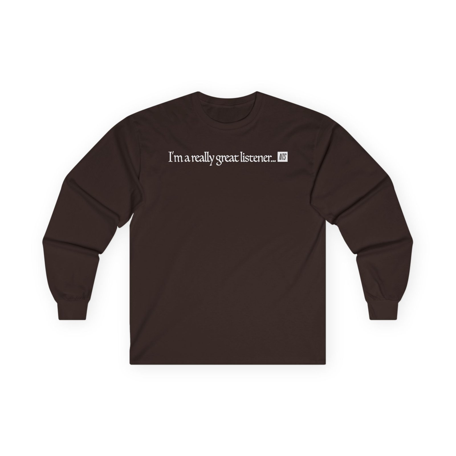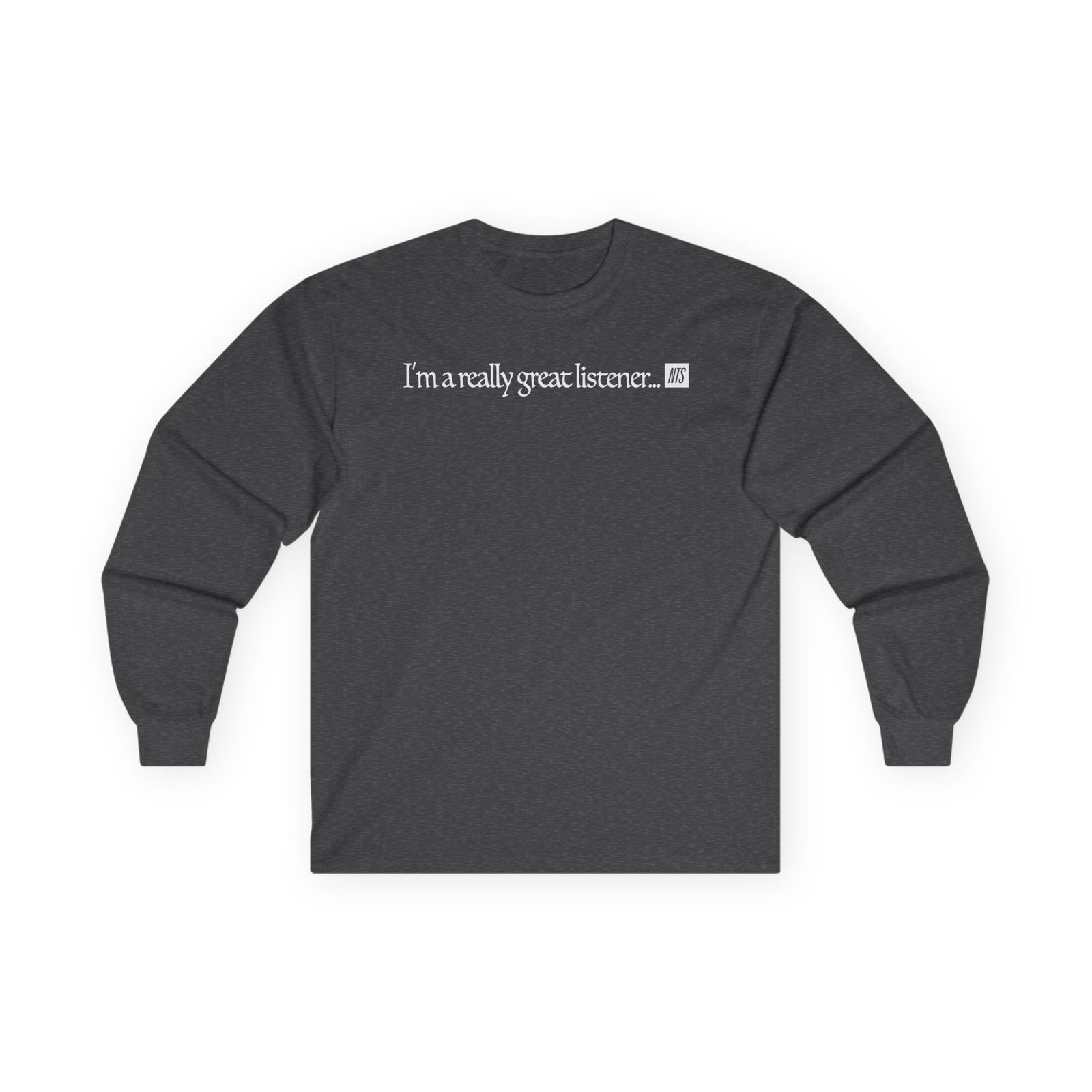 A bit more formal than a standard-issue t-shirt, the NTS I'm A Really Great Listener ultra cotton long sleeve tee is a clear comfort winner. The sleeves also act as a nice frame. There are no side seams. The shoulders are taped for improved durability. This makes for a good fitting around the shoulders and neck. The cotton used for these shirts is environmentally friendly.