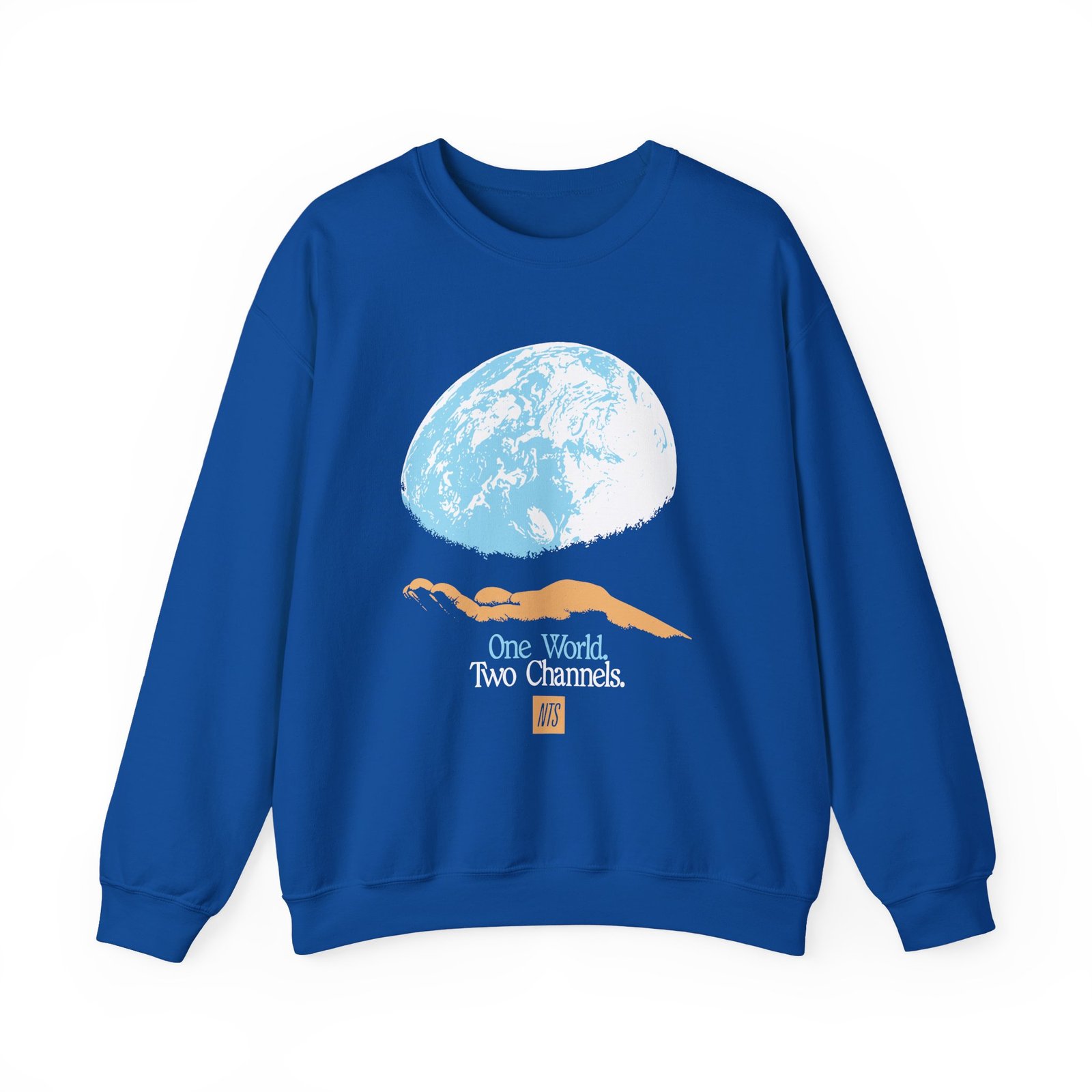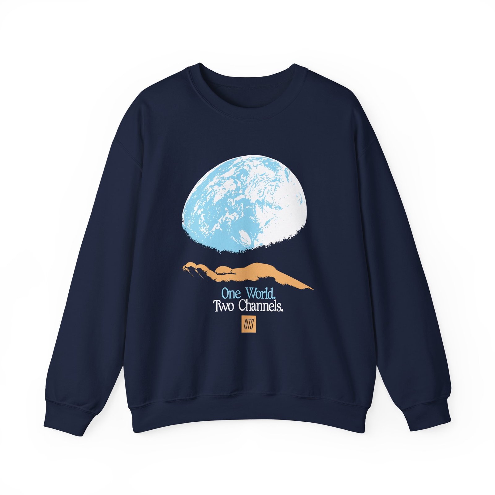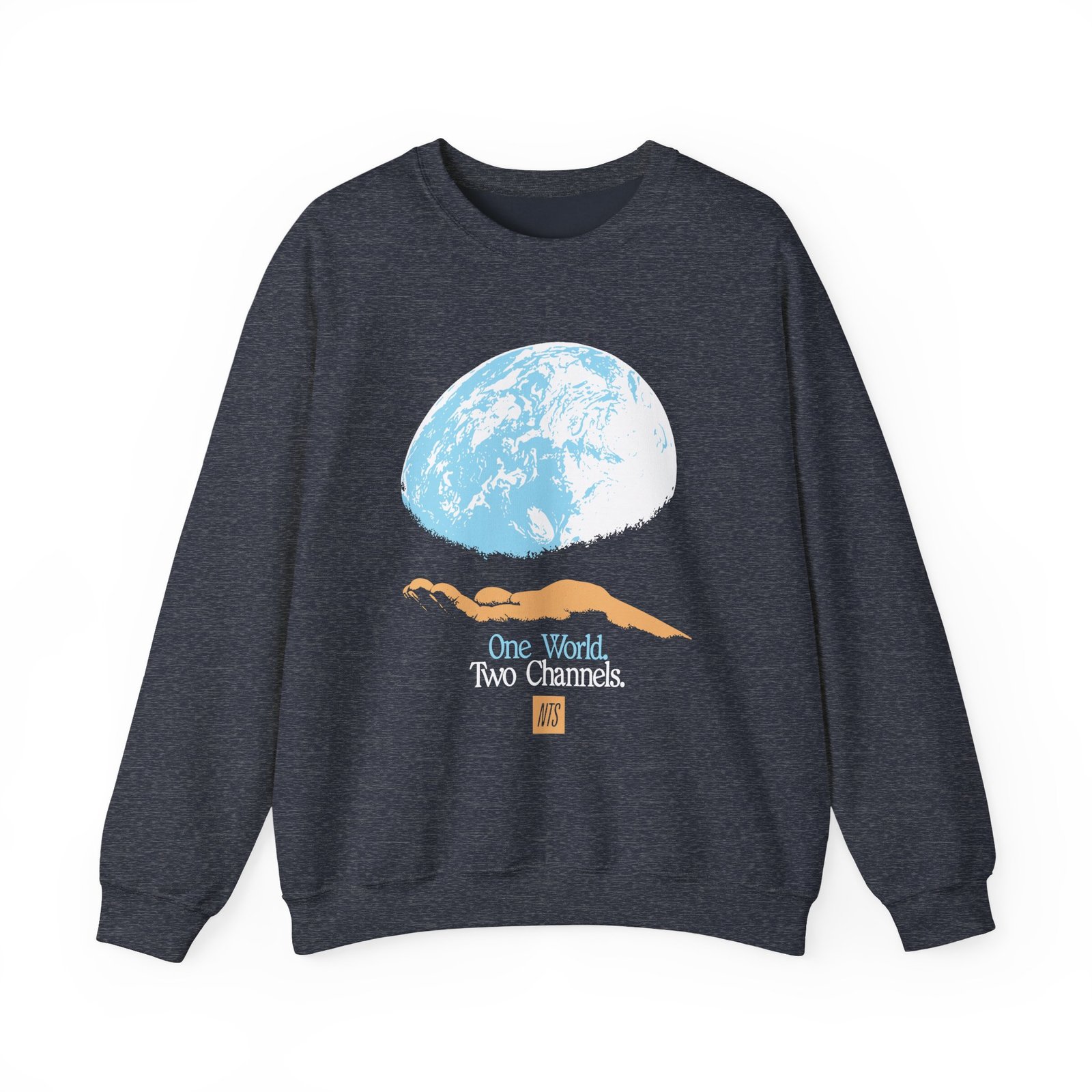 Ideal for any situation, a NTS One World Two Channels unisex heavy blend crewneck sweatshirt is pure comfort. These garments are made from polyester and cotton. This combination helps designs come out looking fresh and beautiful. The collar is ribbed knit, so it retains its shape even after washing. There are no itchy side seams on these sweaters.