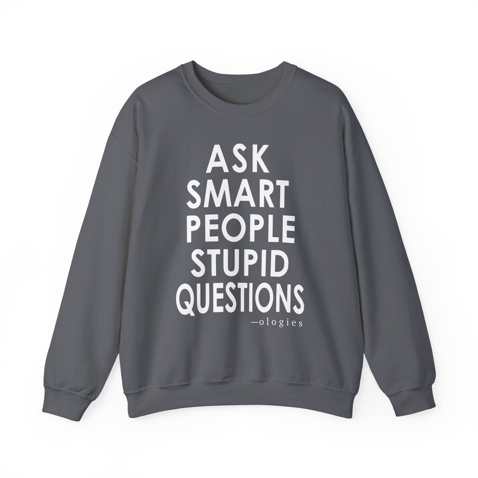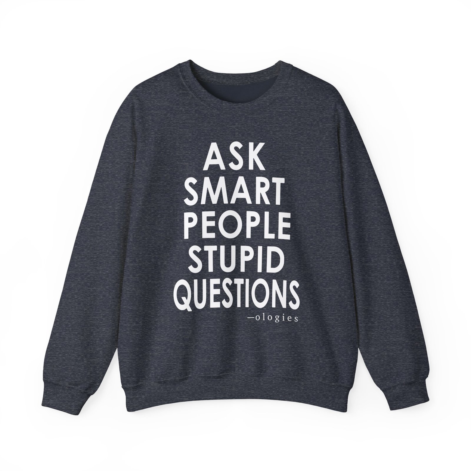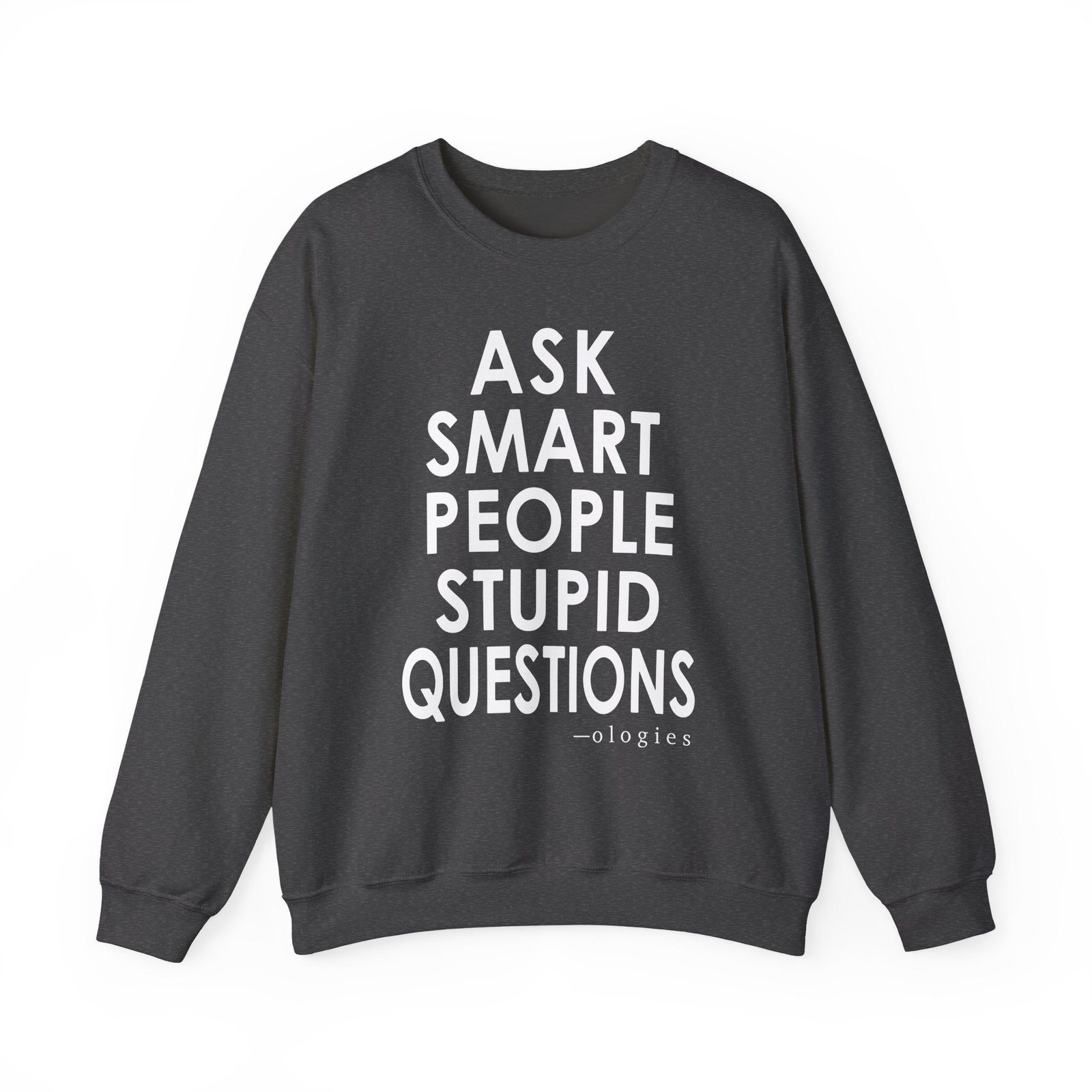 Ideal for any situation, a Ologies Ask Smart People Stupid Questions unisex heavy blend crewneck sweatshirt is pure comfort. These garments are made from polyester and cotton. This combination helps designs come out looking fresh and beautiful. The collar is ribbed knit, so it retains its shape even after washing. There are no itchy side seams on these sweaters.
