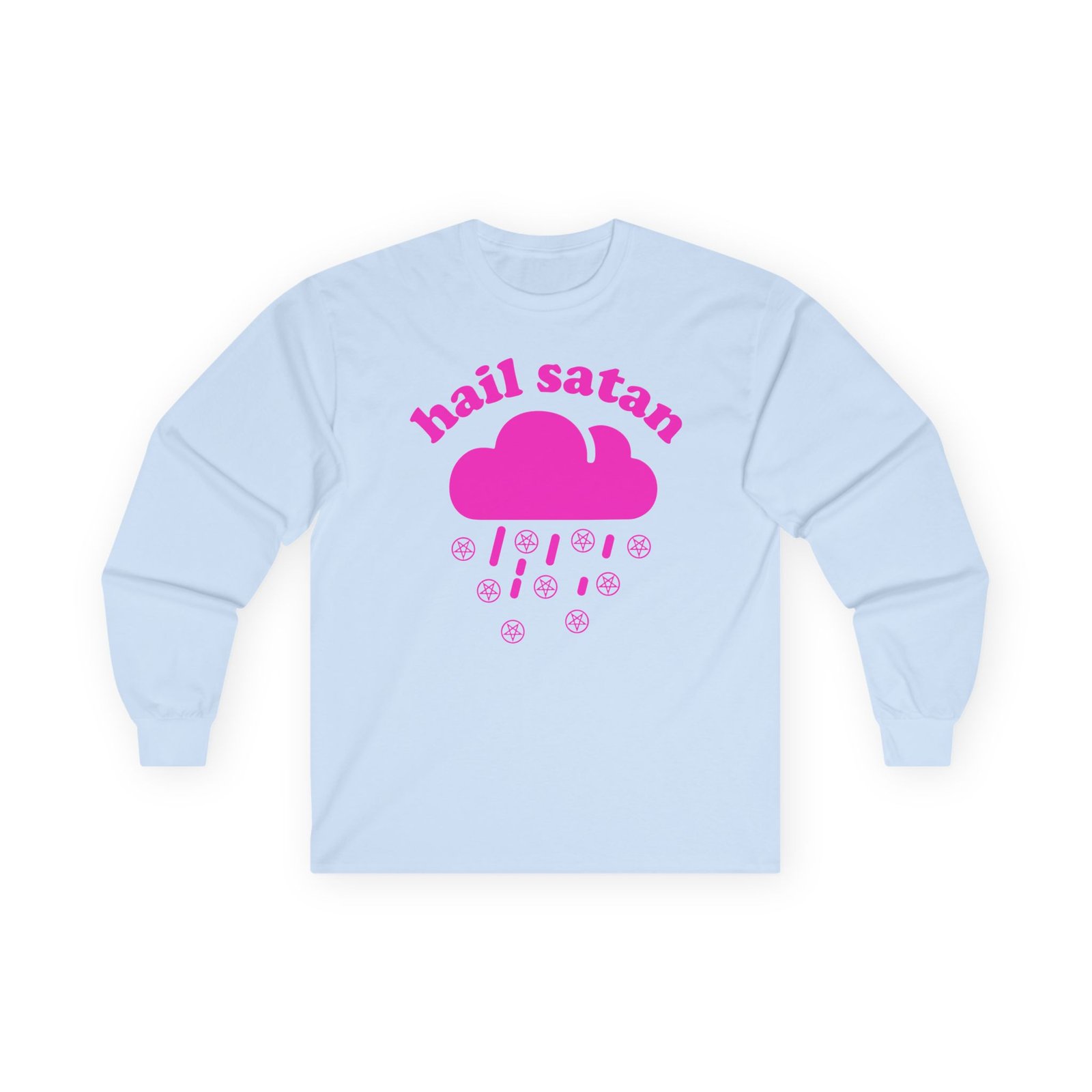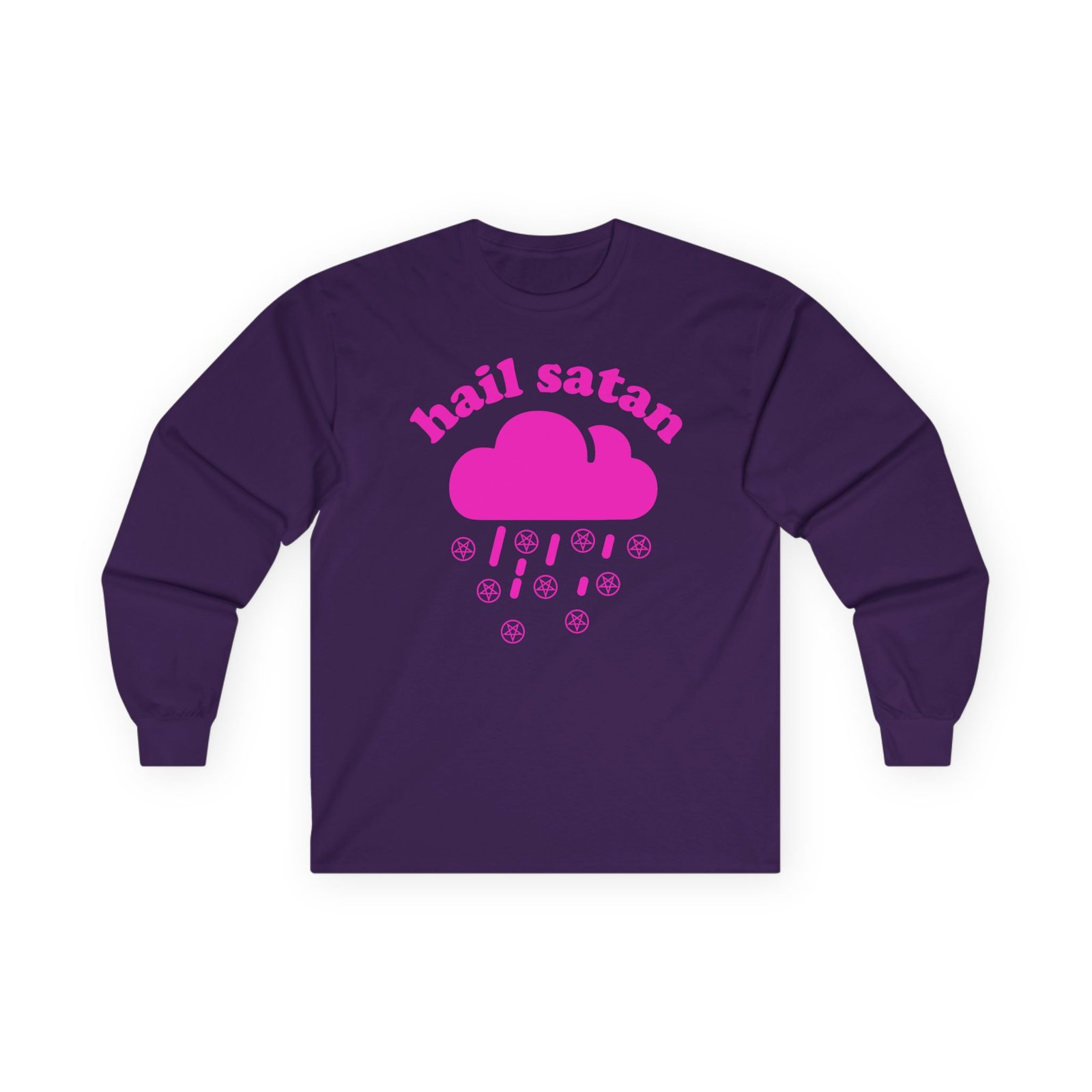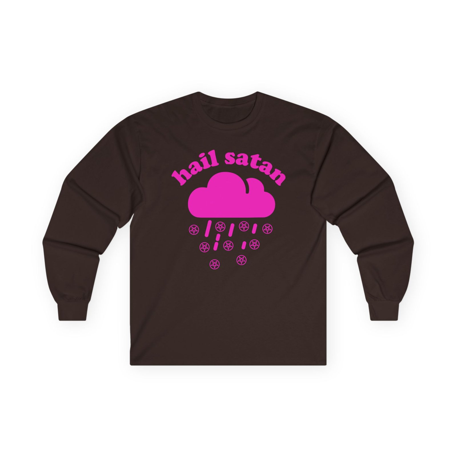 A bit more formal than a standard-issue t-shirt, the Placebo Hail Satan ultra cotton long sleeve tee is a clear comfort winner. The sleeves also act as a nice frame. There are no side seams. The shoulders are taped for improved durability. This makes for a good fitting around the shoulders and neck. The cotton used for these shirts is environmentally friendly.