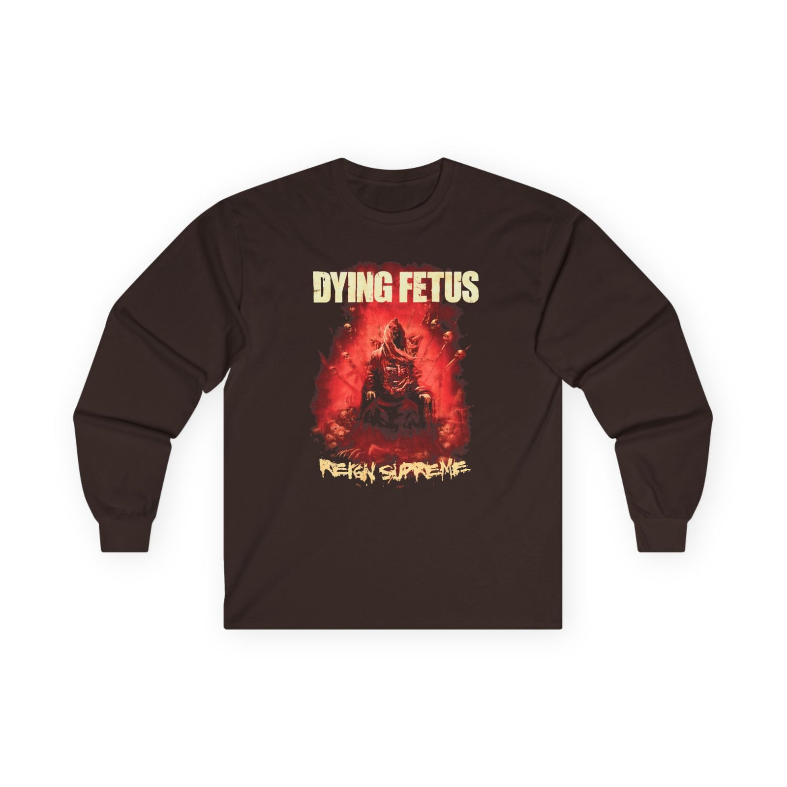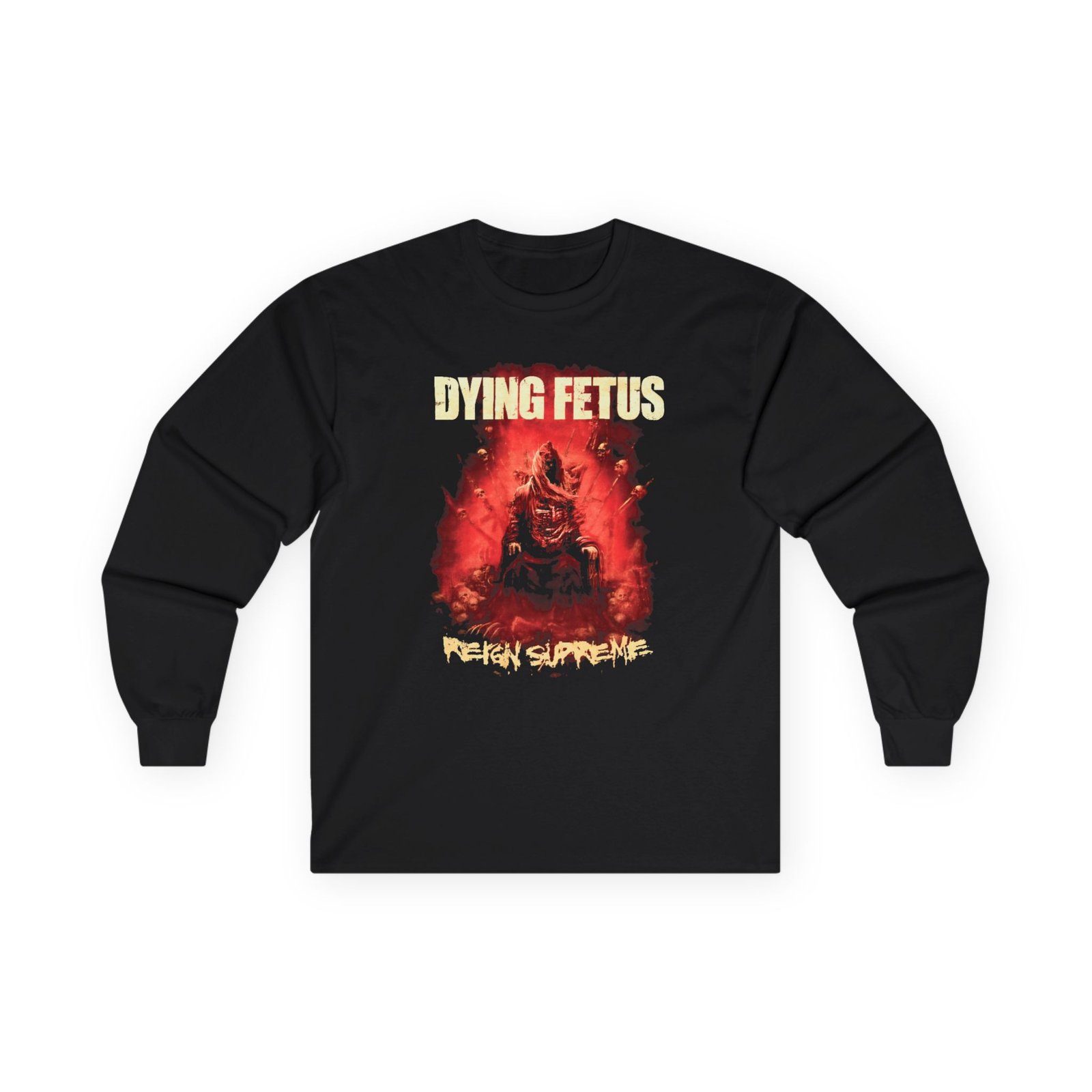 A bit more formal than a standard-issue t-shirt, the Reign Supreme "Dying Fetus" ultra cotton long sleeve tee is a clear comfort winner. The sleeves also act as a nice frame. There are no side seams. The shoulders are taped for improved durability. This makes for a good fitting around the shoulders and neck. The cotton used for these shirts is environmentally friendly.