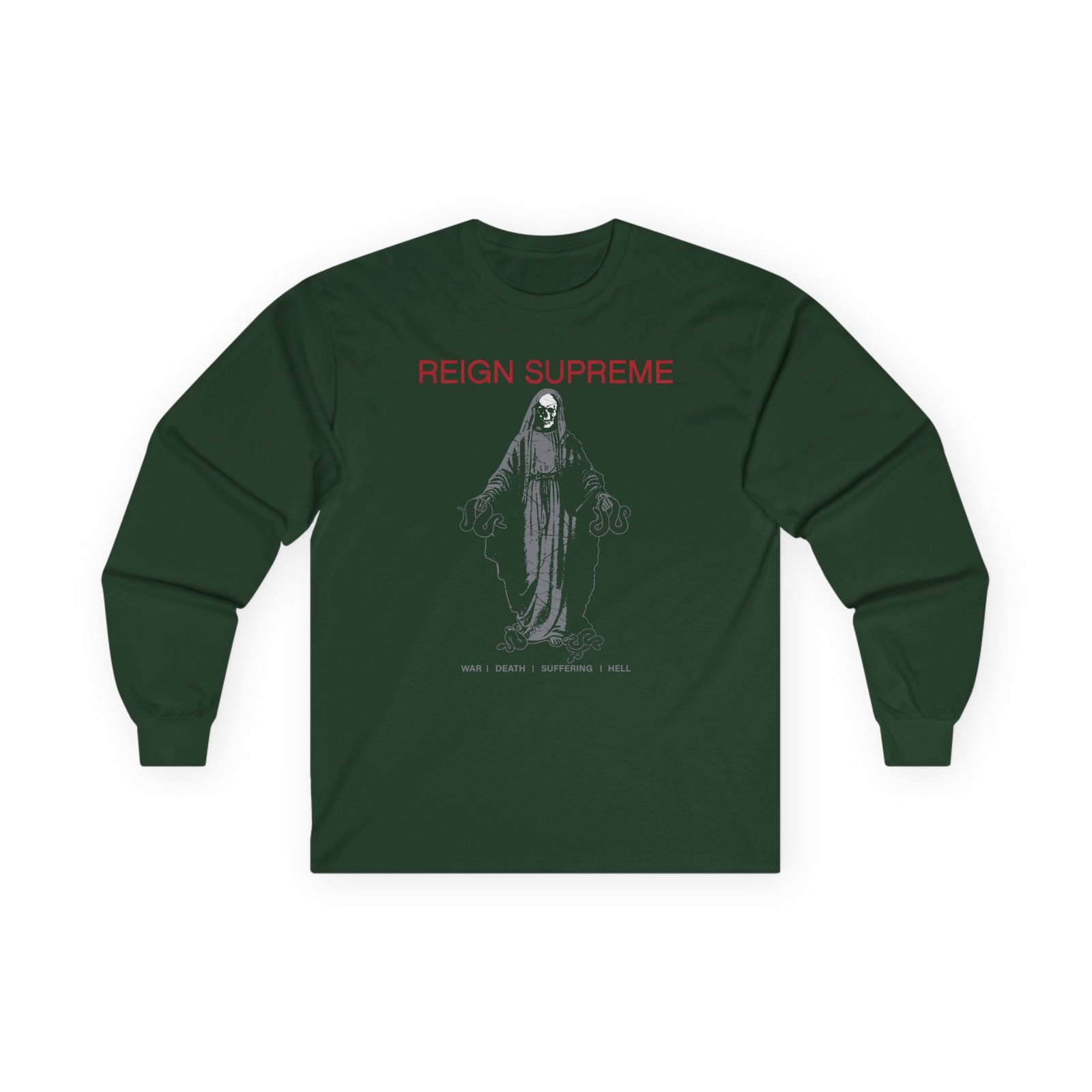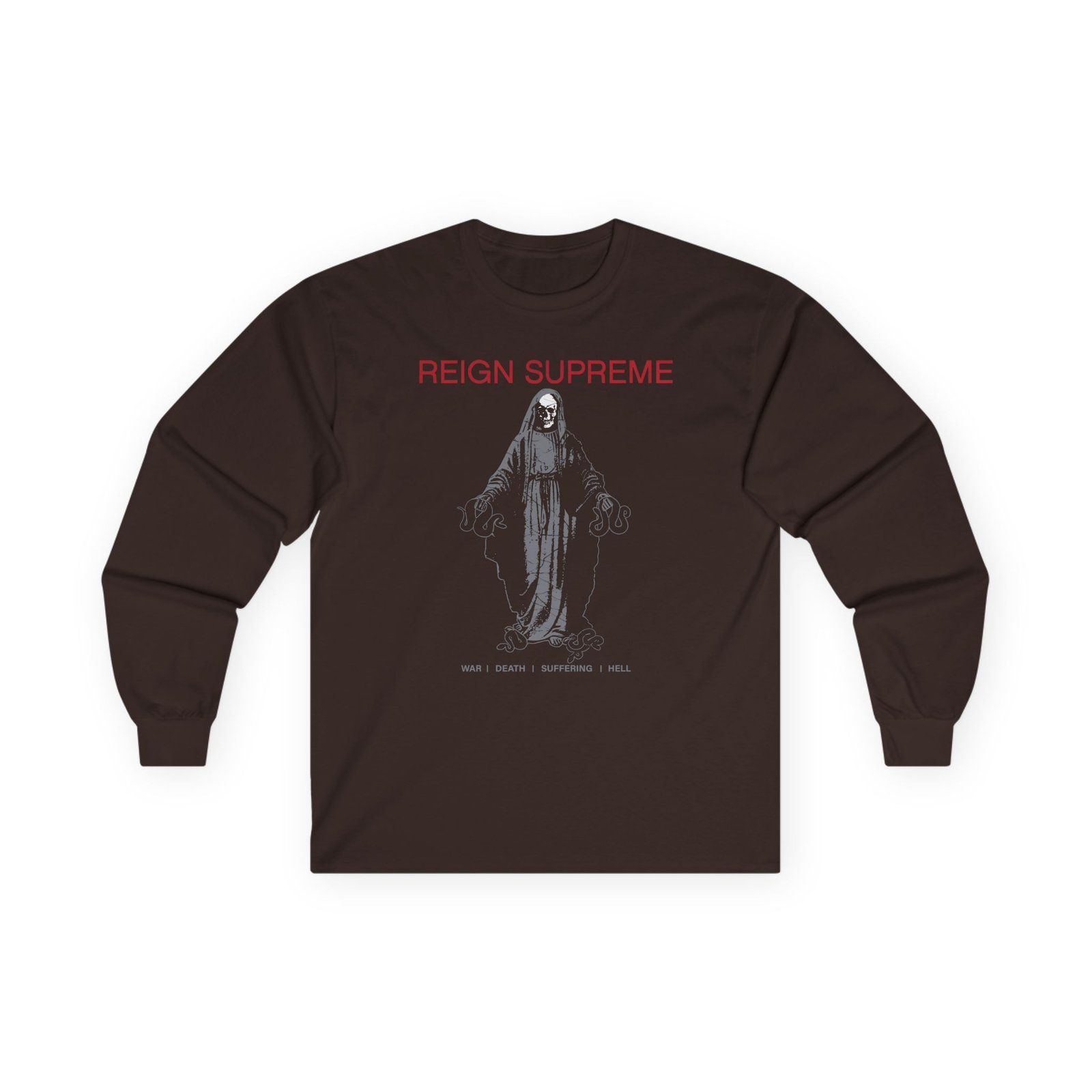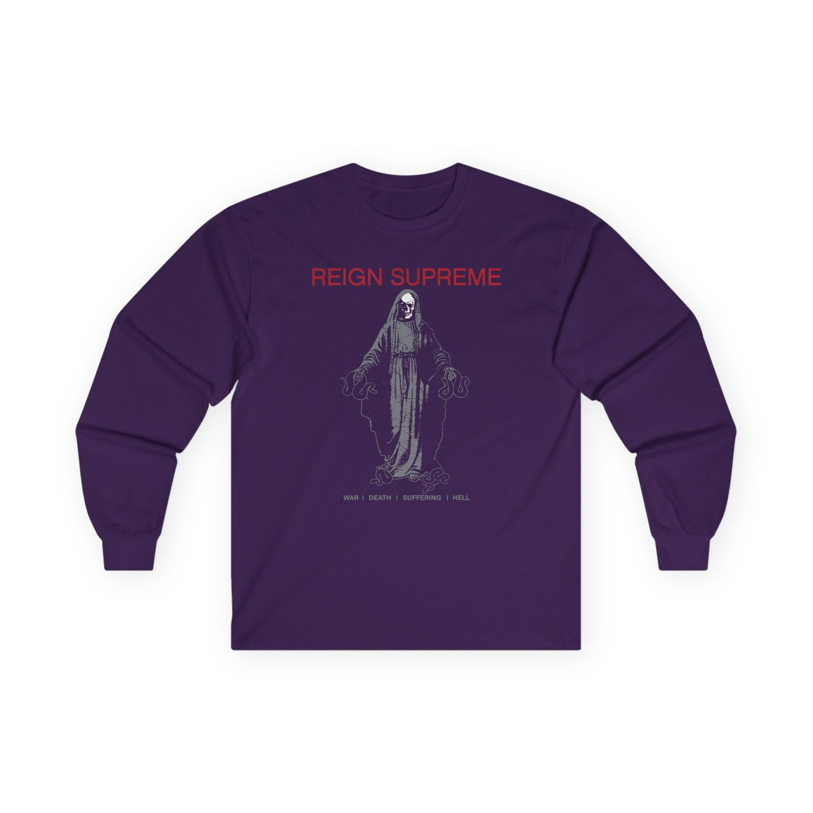 A bit more formal than a standard-issue t-shirt, the Reign Supreme "Skull Mary" ultra cotton long sleeve tee is a clear comfort winner. The sleeves also act as a nice frame. There are no side seams. The shoulders are taped for improved durability. This makes for a good fitting around the shoulders and neck. The cotton used for these shirts is environmentally friendly.