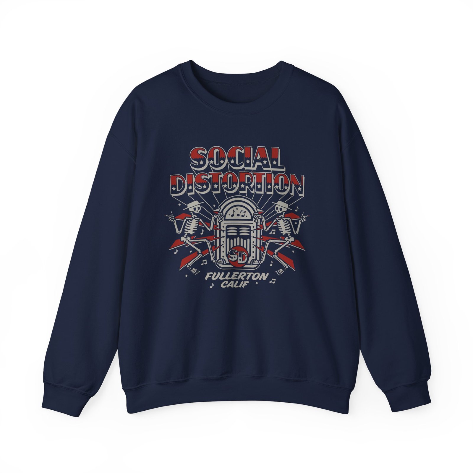 Ideal for any situation, a SD Jukebox Skelly unisex heavy blend crewneck sweatshirt is pure comfort. These garments are made from polyester and cotton. This combination helps designs come out looking fresh and beautiful. The collar is ribbed knit, so it retains its shape even after washing. There are no itchy side seams on these sweaters.