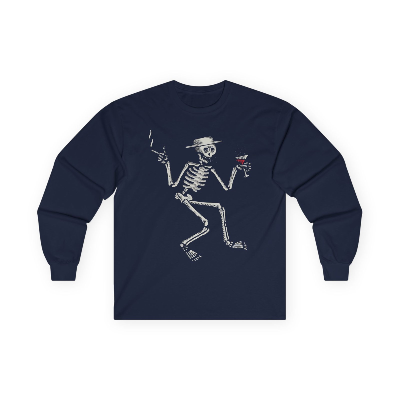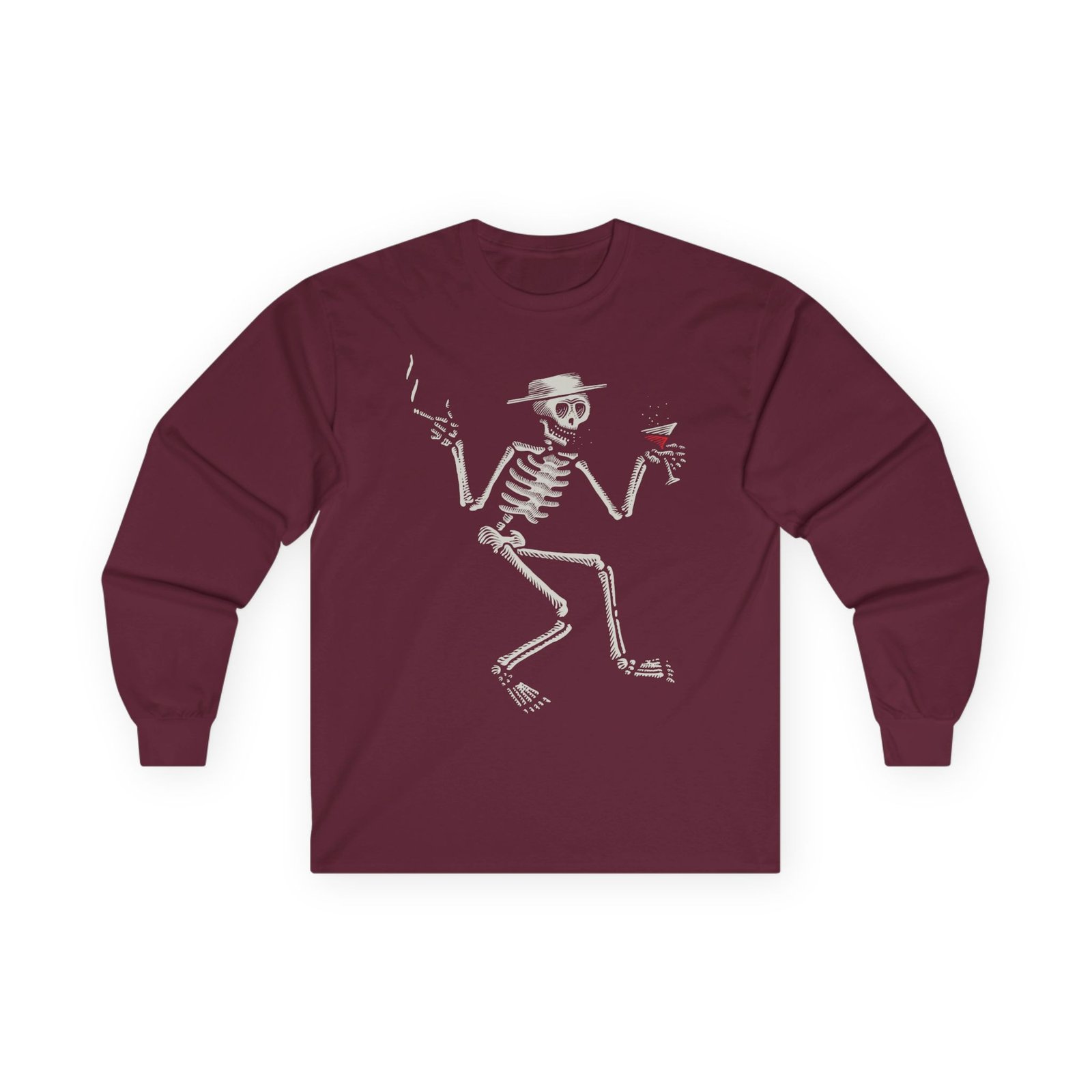 A bit more formal than a standard-issue t-shirt, the SD Woodcut Skelly ultra cotton long sleeve tee is a clear comfort winner. The sleeves also act as a nice frame. There are no side seams. The shoulders are taped for improved durability. This makes for a good fitting around the shoulders and neck. The cotton used for these shirts is environmentally friendly.