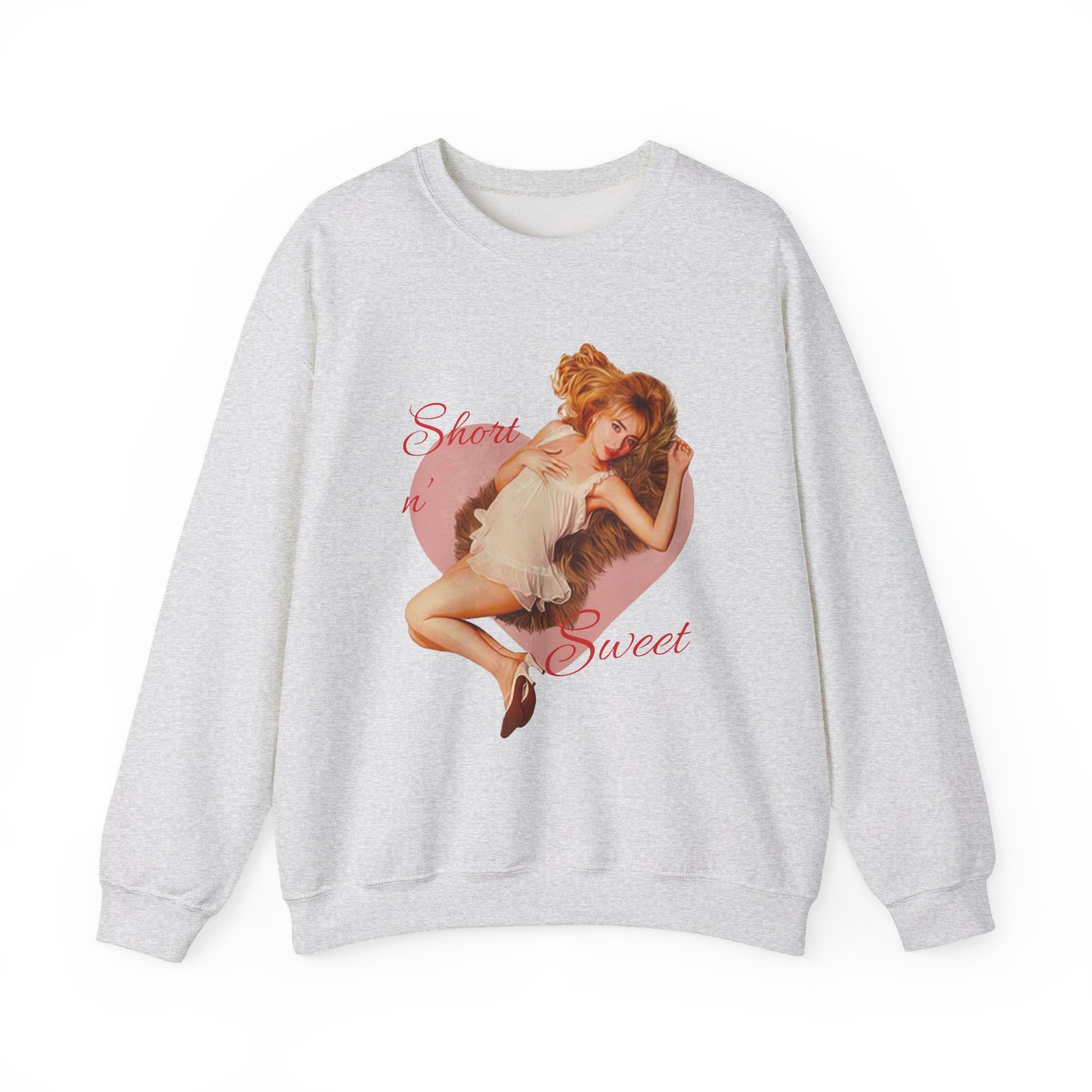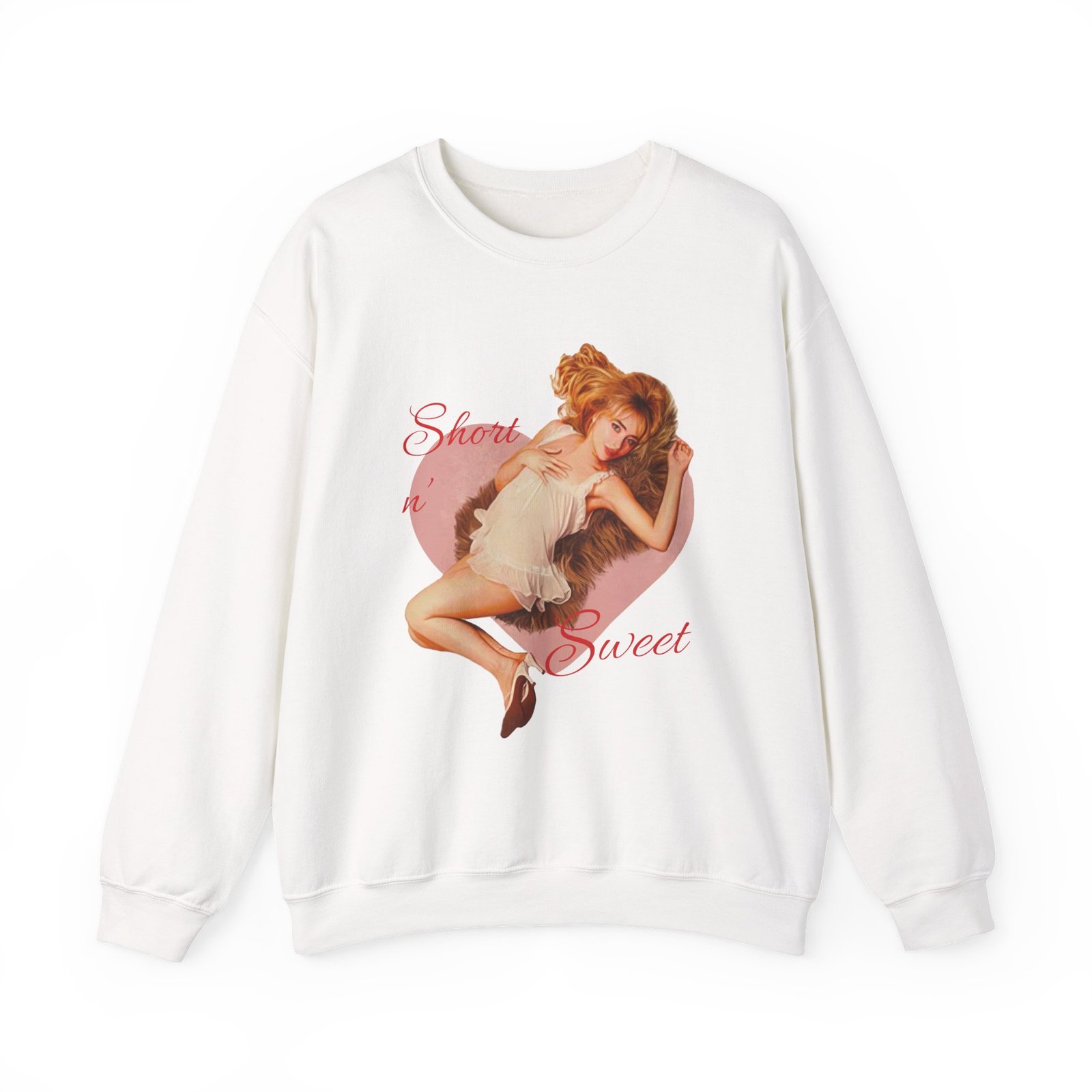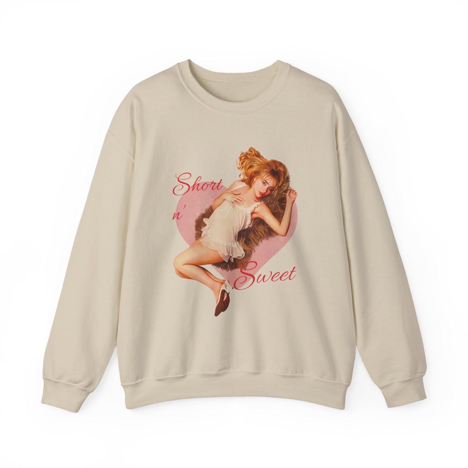Ideal for any situation, a Short N' Sweet Heart Ivory unisex heavy blend crewneck sweatshirt is pure comfort. These garments are made from polyester and cotton. This combination helps designs come out looking fresh and beautiful. The collar is ribbed knit, so it retains its shape even after washing. There are no itchy side seams on these sweaters.