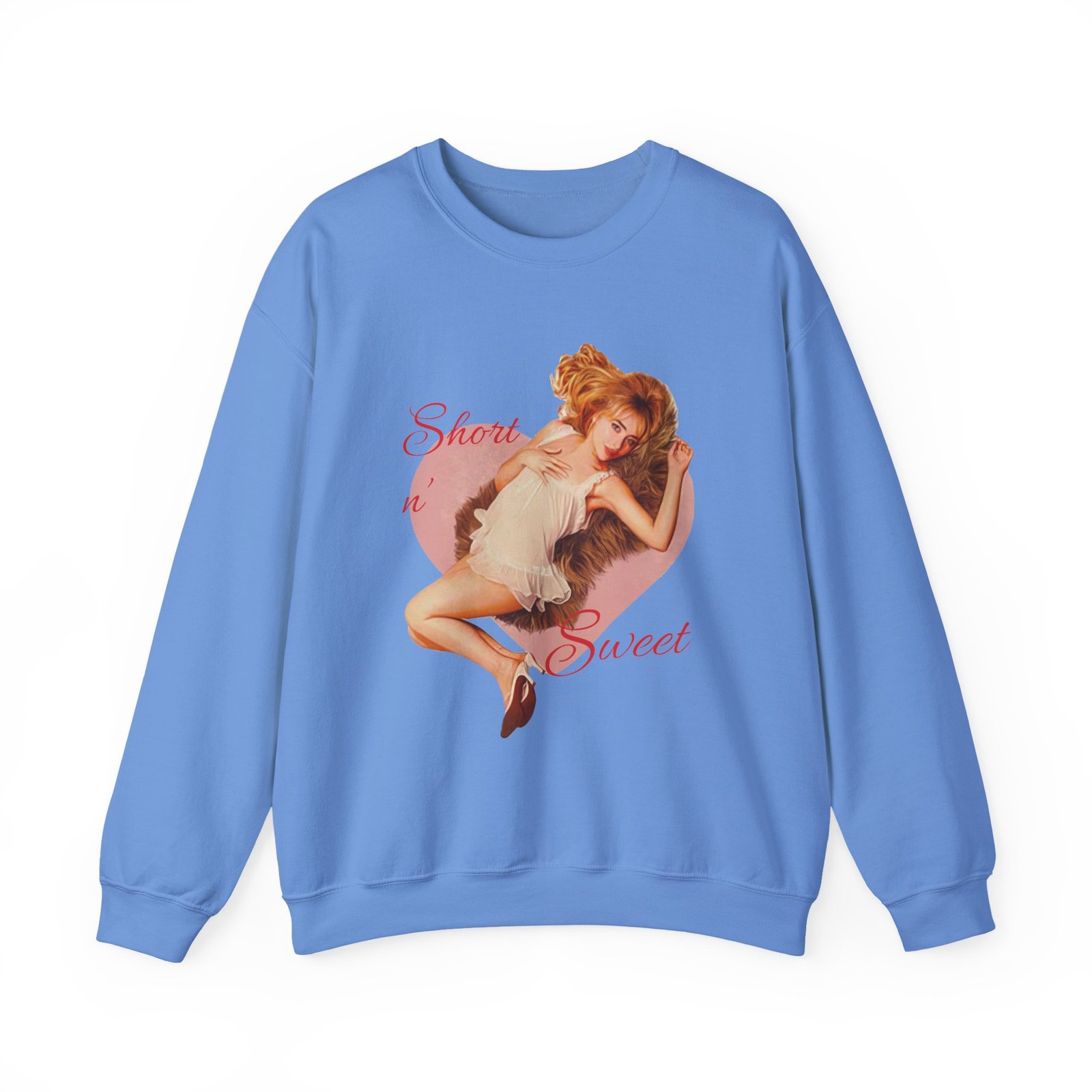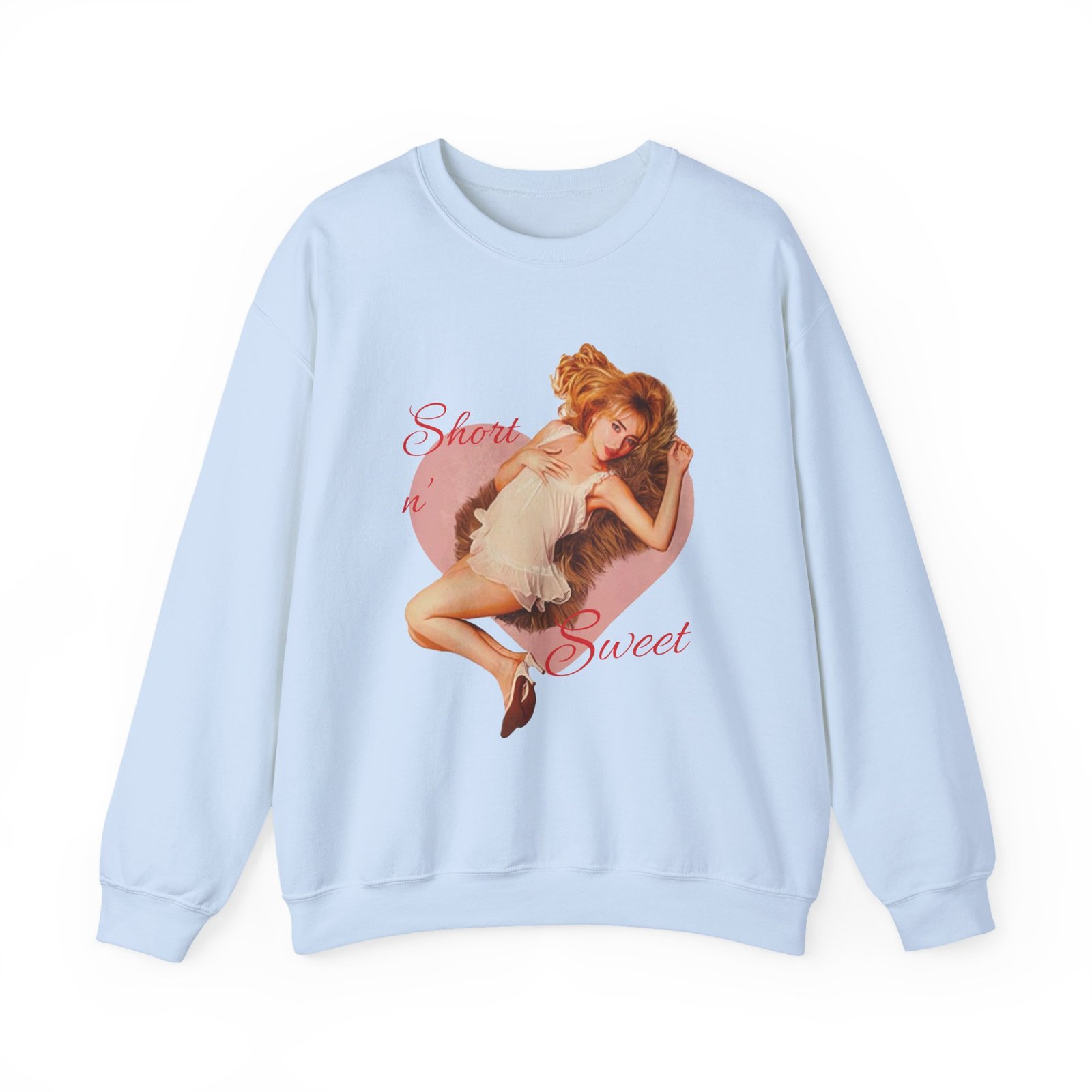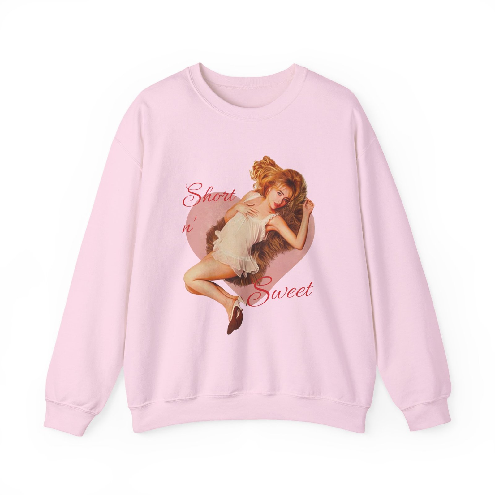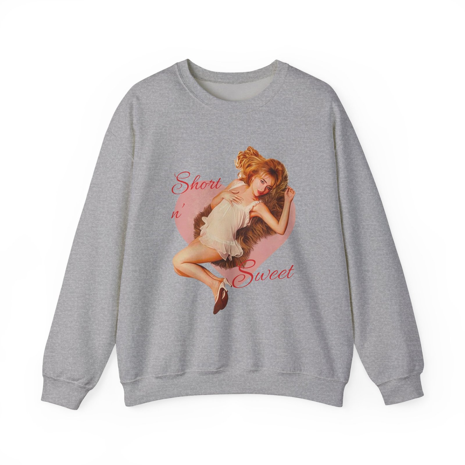 Ideal for any situation, a Short N' Sweet Heart Ivory unisex heavy blend crewneck sweatshirt is pure comfort. These garments are made from polyester and cotton. This combination helps designs come out looking fresh and beautiful. The collar is ribbed knit, so it retains its shape even after washing. There are no itchy side seams on these sweaters.
