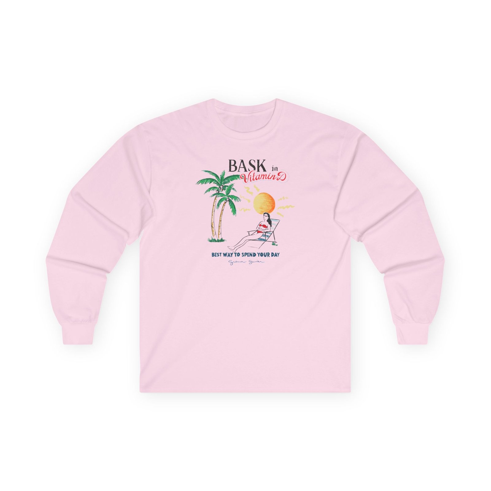 A bit more formal than a standard-issue t-shirt, the Sienna Mae Bask in Vitamin D ultra cotton long sleeve tee is a clear comfort winner. The sleeves also act as a nice frame. There are no side seams. The shoulders are taped for improved durability. This makes for a good fitting around the shoulders and neck. The cotton used for these shirts is environmentally friendly.