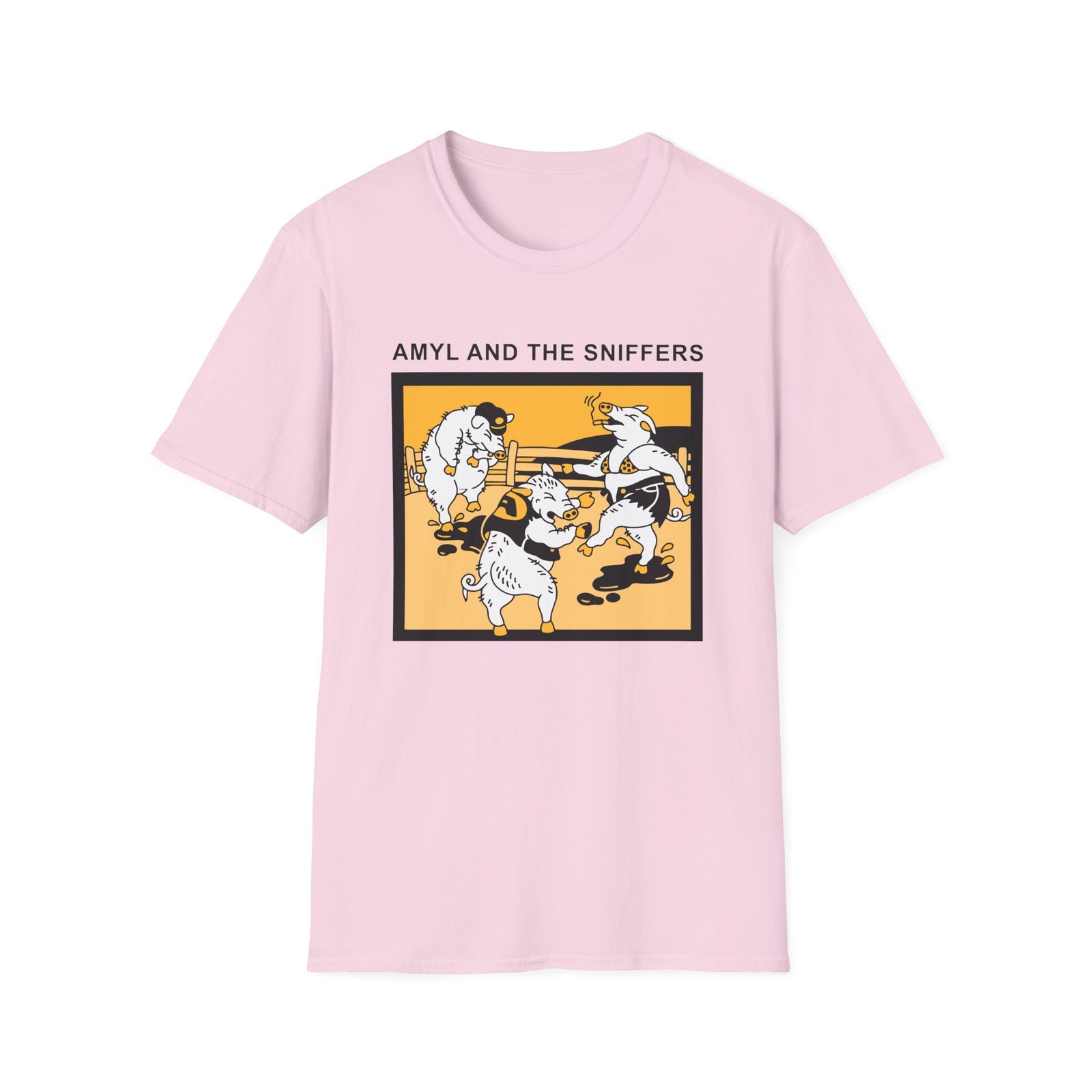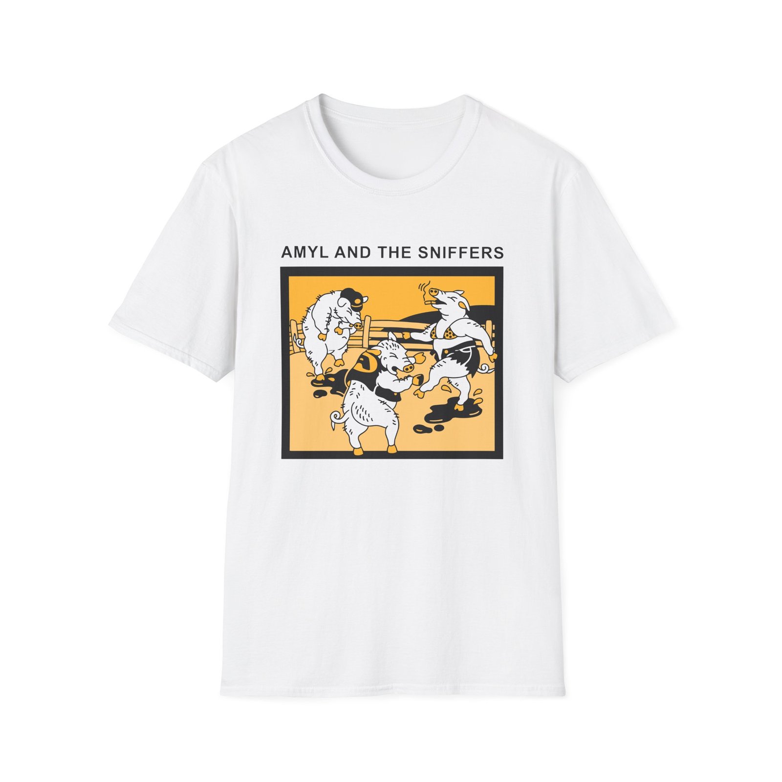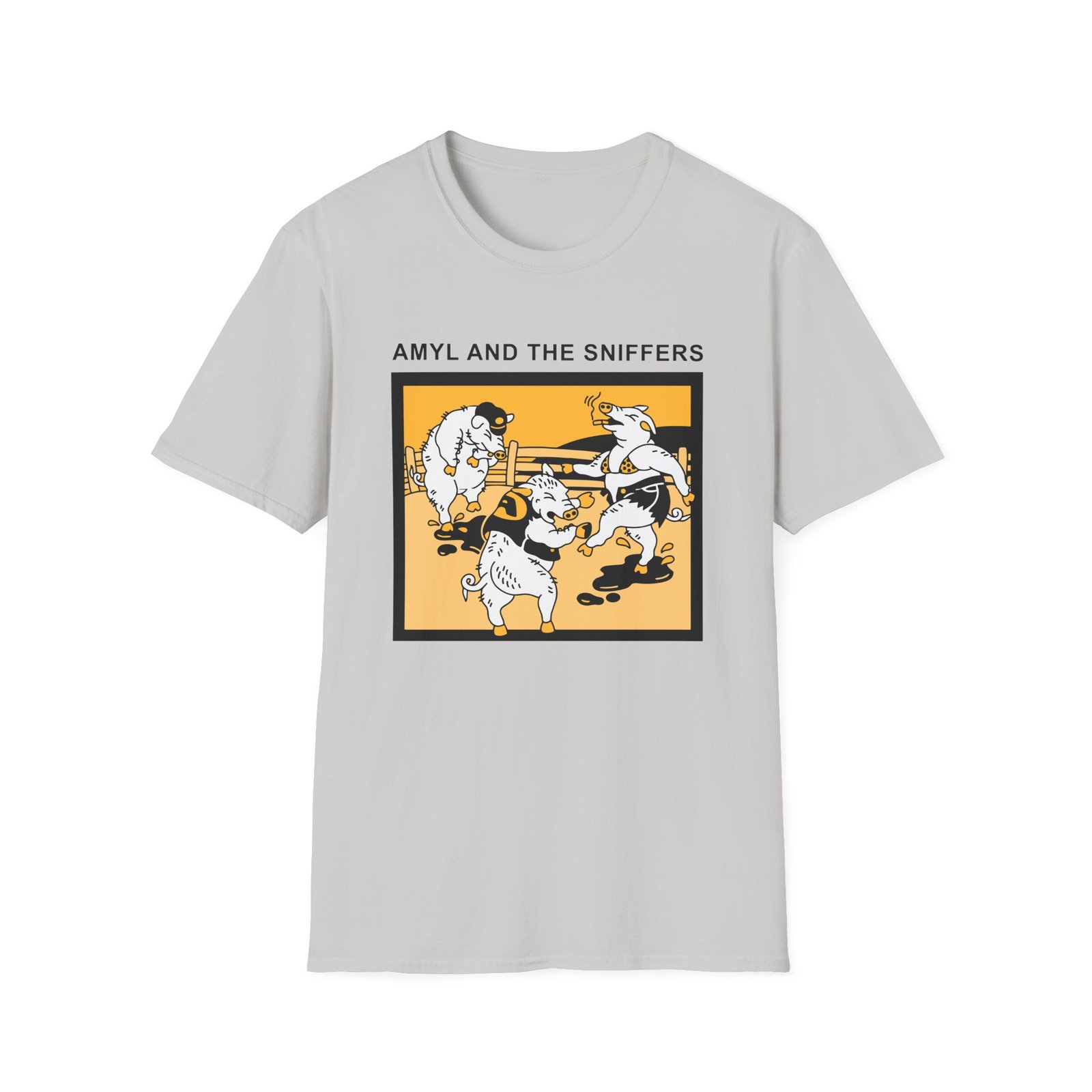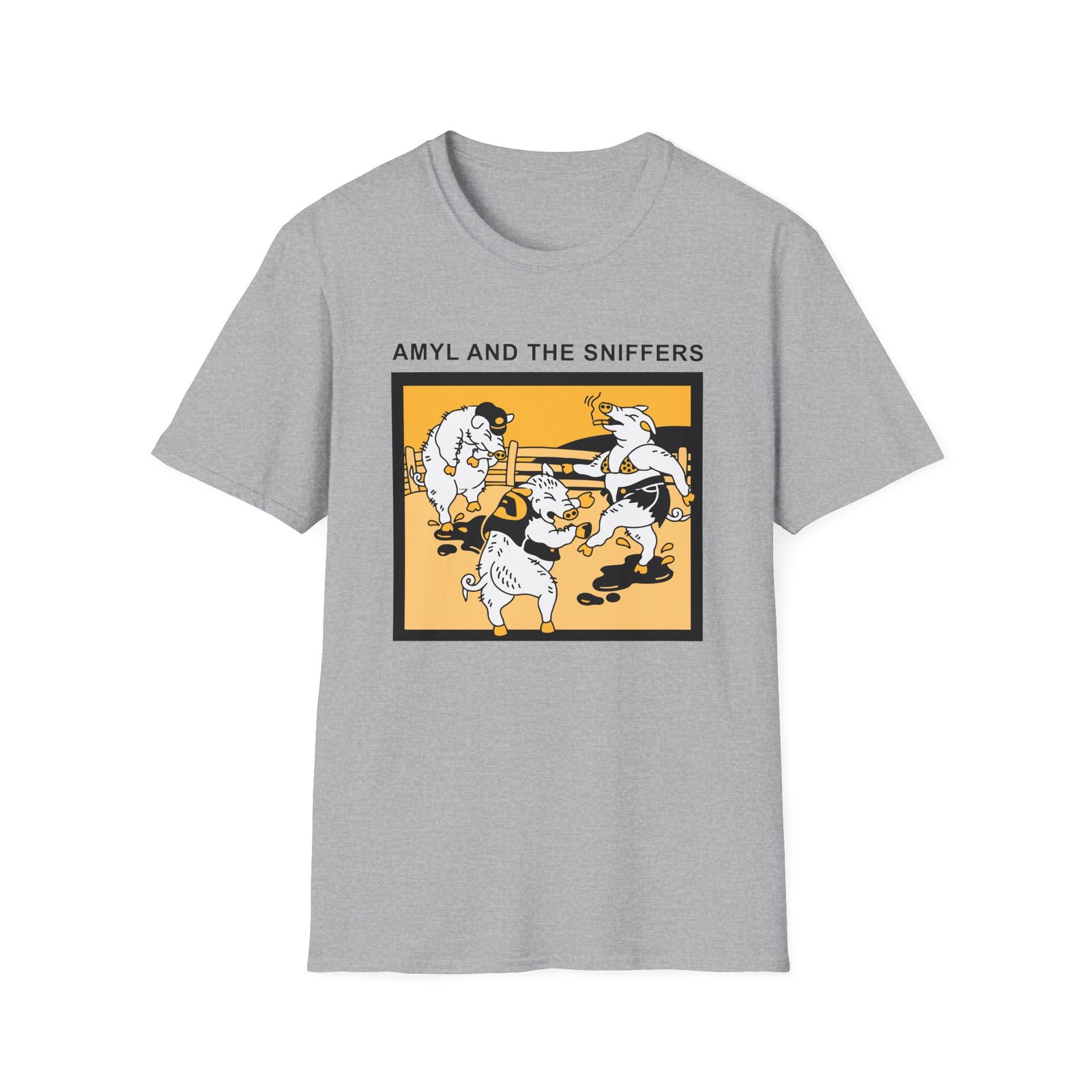 The Snifferish, Amyl and the Sniffers Pigs unisex soft-style t-shirt puts a new spin on casual comfort. Made from very soft materials, this tee is 100% cotton for solid colors. Heather colors and sports grey include polyester. The shoulders have twill tape for improved durability. There are no side seams. The collar is made with ribbed knitting to prevent curling damage.