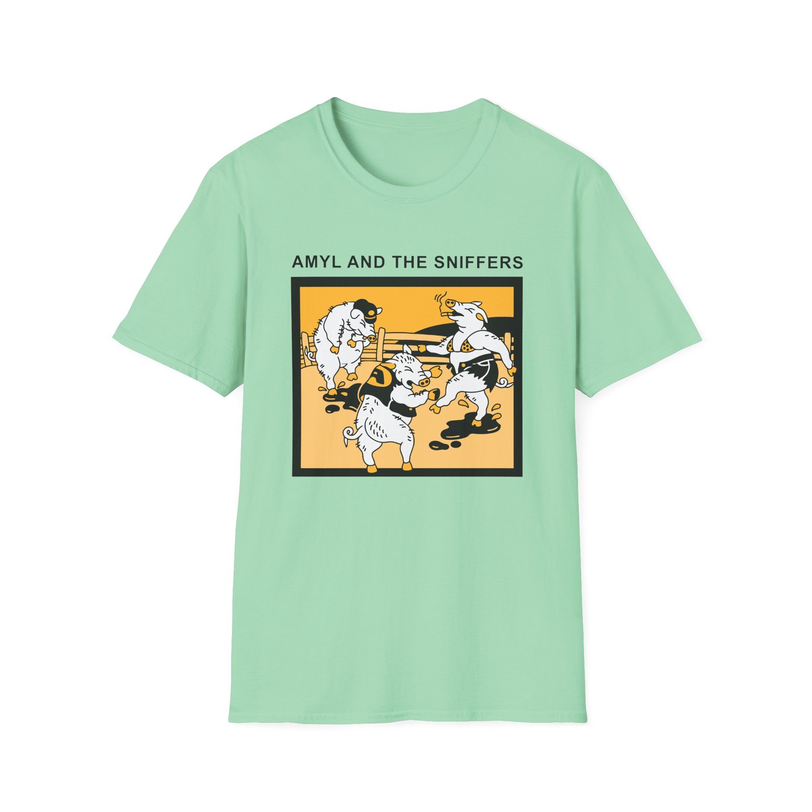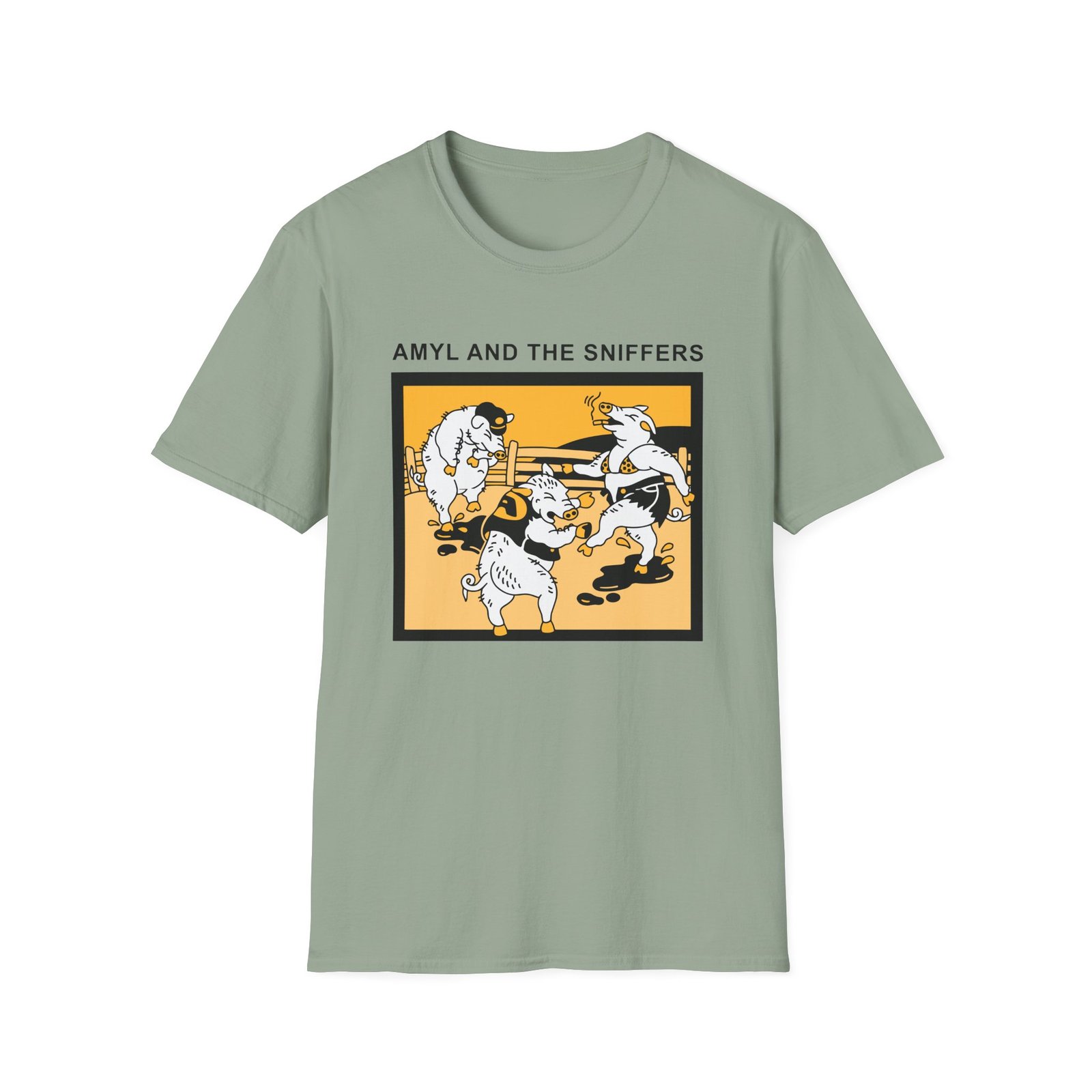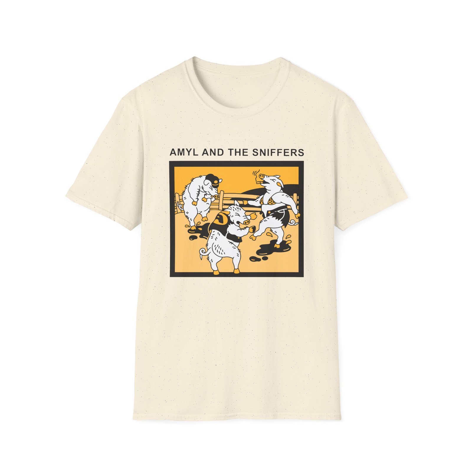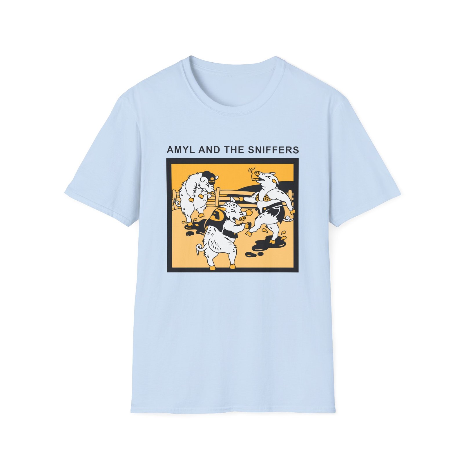 The Snifferish, Amyl and the Sniffers Pigs unisex soft-style t-shirt puts a new spin on casual comfort. Made from very soft materials, this tee is 100% cotton for solid colors. Heather colors and sports grey include polyester. The shoulders have twill tape for improved durability. There are no side seams. The collar is made with ribbed knitting to prevent curling damage.